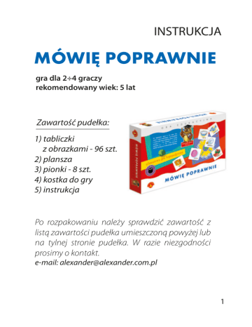 INSTRUKCJA MÓWIĘ POPRAWNIE gra dla 2÷4 graczy rekomendowany wiek: 5 lat Zawartość pudełka: 1) tabliczki z obrazkami - 96 szt. 2) plansza 3) pionki - 8 szt. 4) kostka do gry 5) instrukcja Po rozpakowaniu należy sprawdzić zawartość z listą zawartości pudełka umieszczoną powyżej lub na tylnej stronie pudełka. W razie niezgodności prosimy o kontakt. e-mail: [email protected] 1 Zasady bezpiecznego użytkowania: Ostrzeżenia: Nieodpowiednie dla dzieci w wieku poniżej 3 lat. Zestaw zawiera małe elementy niebezpieczeństwo zakrztuszenia. Prosimy zachować opakowanie ze względu na podane informacje. Konieczność nadzoru przy zabawie osoby dorosłej. Opakowanie nie jest częścią zabawki. Stan zabawki należy regularnie kontrolować. 2 „Mówię poprawnie” to gra mająca na celu rozwój mowy dziecka w wieku przedszkolnym i wczesnoszkolnym. Podczas zabawy gracze pod okiem opiekuna ćwiczą różnicowanie głosek. Grę można wykorzystać do zabawy w domu z rodzicami, w szkole, w pracy terapeutycznej z logopedą. Przygotowanie do gry: Na stole należy położyć planszę oraz potasowane kartoniki z obrazkami, tylną stroną (gwiazdkami) do góry, w 3 oddzielnych szeregach (każdy o innym kolorze gwiazdki). Gracze otrzymują po 2 pionki, które ustawiają na okrągłych narożnych polach planszy, zgodnych z kolorami pionków. 3 Cel gry: Celem gry jest jak najszybsze okrążenie przez gracza toru dwoma pionkami i ustawienie ich wewnątrz, na okrągłych polach, zgodnych z kolorami jego pionków. Początek gry: Grę rozpoczyna najmłodszy gracz. Rzuca kostką i zaczynając od pola startu, czyli pola na torze w kolorze jego pionka (ze strzałką), przesuwa swój pionek o tyle pól, ile wskazała kostka (w kierunku wyznaczonym strzałką). Przebieg i zasady gry: Gracz stając pionkiem na polu z np. żółtą gwiazdką odsłania kartonik z szeregu o takim samym kolorze gwiazdki i stara się wymówić poprawnie wyraz, zgodnie z obrazkiem i napisem znajdującymi się na trzymanym kartoniku (ćwiczona głoska zaznaczona jest czerwonym kolorem). 4 Jeśli zrobi to prawidłowo, to przysługuje mu premia - może przesunąć swój pionek dodatkowo o dwa pola do przodu. Poprawność wymowy ocenia opiekun. Wyciągnięty kartonik należy odłożyć z powrotem na spód szeregu, z którego był wzięty (gwiazdką do góry). Kolejność pozostałych graczy jest zgodna z ruchem wskazówek zegara. Po przejechaniu całego toru gry należy skręcić pionkiem przed polem ze strzałką (z którego zaczynało się grę) na jedno z pól wewnętrznych (koło). Aby zająć jedno z tych pól gracz musi wyrzucić liczbę oczek równą liczbie pól dzielących go od tego pola. Miejsca na polach wewnętrznych mogą być zajmowane w dowolnej kolejności. * Gracz w czasie swojej kolejki może jechać zawsze tylko jednym z dwóch posiadanych pionków. * Na jednym polu może stać tylko jeden pionek. 5 * Pionki mogą się wzajemnie zbijać i przeskakiwać. Pionek zostaje zbity, gdy pionek przeciwnika stanie na polu przez niego zajętym. Wędruje wówczas z powrotem na okrągłe pole narożne. Koniec gry: Gra kończy się gdy jeden z graczy jako pierwszy przemierzy tor gry swoimi dwoma pionkami i ustawi je na końcowych okrągłych polach wewnątrz toru. Ten gracz zwycięża. 6 Po utrwaleniu wymowy głosek gracze mogą grać bez kartoników. Obowiązują ich wówczas takie zasady jak wyżej, z kilkoma wyjątkami: - aby stanąć na polu startu, należy wcześniej wyrzucić „6”, - wyrzucenie „6” w czasie gry daje prawo do następnego rzutu, - gracz, którego pionek zostanie zbity i nie ma pionka na torze może zacząć grę dopiero po wyrzuceniu „6”. Przechowywanie: Produkt należy przechowywać w suchym pomieszczeniu, z dala od źródeł ciepła oraz w oryginalnym opakowaniu. Utylizacja: Po zakończeniu użytkowania usuwać zabawkę w sposób bezpieczny i z dbałością o środowisko Deklaracja WE: Produkt został oznaczony symbolem CE ponieważ jest zgodny z dyrektywą bezpieczeństwa zabawek. PRODUCENT: Z.P. „ALEXANDER” Piotr Pundzis 80 - 209 CHWASZCZYNO k/GDYNI, UL. TELEWIZYJNA 19 TEL./FAX 58 552 83 70, TEL. 58 552 87 27 Symbol 0-3 oznacza, że zabawka jest nieodpowiednia dla dzieci w wieku poniżej 3 lat. 7