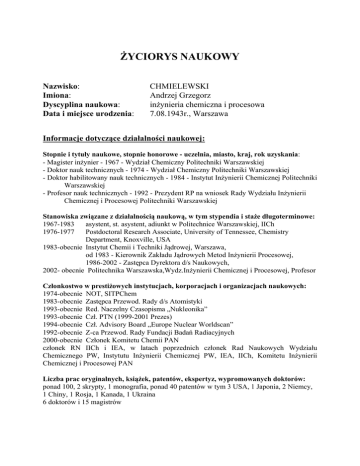 ŻYCIORYS NAUKOWY Nazwisko: Imiona: Dyscyplina naukowa: Data i miejsce urodzenia: CHMIELEWSKI Andrzej Grzegorz inżynieria chemiczna i procesowa 7.08.1943r., Warszawa Informacje dotyczące działalności naukowej: Stopnie i tytuły naukowe, stopnie honorowe - uczelnia, miasto, kraj, rok uzyskania: - Magister inżynier - 1967 - Wydział Chemiczny Politechniki Warszawskiej - Doktor nauk technicznych - 1974 - Wydział Chemiczny Politechniki Warszawskiej - Doktor habilitowany nauk technicznych - 1984 - Instytut Inżynierii Chemicznej Politechniki Warszawskiej - Profesor nauk technicznych - 1992 - Prezydent RP na wniosek Rady Wydziału Inżynierii Chemicznej i Procesowej Politechniki Warszawskiej Stanowiska związane z działalnością naukową, w tym stypendia i staże długoterminowe: 1967-1983 asystent, st. asystent, adiunkt w Politechnice Warszawskiej, IICh 1976-1977 Postdoctoral Research Associate, University of Tennessee, Chemistry Department, Knoxville, USA 1983-obecnie Instytut Chemii i Techniki Jądrowej, Warszawa, od 1983 - Kierownik Zakładu Jądrowych Metod Inżynierii Procesowej, 1986-2002 - Zastępca Dyrektora d/s Naukowych, 2002- obecnie Politechnika Warszawska,Wydz.Inżynierii Chemicznej i Procesowej, Profesor Członkostwo w prestiżowych instytucjach, korporacjach i organizacjach naukowych: 1974-obecnie NOT, SITPChem 1983-obecnie Zastępca Przewod. Rady d/s Atomistyki 1993-obecnie Red. Naczelny Czasopisma „Nukleonika” 1993-obecnie Czł. PTN (1999-2001 Prezes) 1994-obecnie Czł. Advisory Board „Europe Nuclear Worldscan” 1992-obecnie Z-ca Przewod. Rady Fundacji Badań Radiacyjnych 2000-obecnie Członek Komitetu Chemii PAN członek RN IICh i IEA, w latach poprzednich członek Rad Naukowych Wydziału Chemicznego PW, Instytutu Inżynierii Chemicznej PW, IEA, IICh, Komitetu Inżynierii Chemicznej i Procesowej PAN Liczba prac oryginalnych, książek, patentów, ekspertyz, wypromowanych doktorów: ponad 100, 2 skrypty, 1 monografia, ponad 40 patentów w tym 3 USA, 1 Japonia, 2 Niemcy, 1 Chiny, 1 Rosja, 1 Kanada, 1 Ukraina 6 doktorów i 15 magistrów Prace oryginalne (wybrane): - Physico-chemical mechanism and technological development of electron beam flue gas treatment, Radiation Physics and Chemistry, 46(4-6), 1057-1062 (1995) - Investigation of the separation factor between light and heavy water in the liquid/vapor membrane permeation process, Journal of Membrane Science, 25, 257-262 (1991) - Application of ultrafiltration and complexation for the treatment of low-level radioactive effluents, Sep.Sci. and Technology, 30(7-9), 1779-1789 (1995) - Anisotropy of radiotracer diffusion in some nematic liquid crystals, Mol. Cryst. Liq. Cryst., 212, 205-215 (1992) - Rheological Properties of Some Biphenyl Liquid Crystals, Rhelogica Acta, 23, 207-210 (1984) Podręczniki, książki: - „Laboratorium specjalnych metod rozdzielania” Wyd. PW, Warszawa, 1976, 120 stron - „Specjalne metody rozdzielania” Wyd. PW, Warszawa, 1983, 172 strony - „Anizotropia zjawisk transportowych w nematycznych ciekłych kryształach”, Wyd. PW, Warszawa, 1983, 98 stron - „Environmental Applications of Ionizing Radiation”, J. Wiley, 1998, współautor 4 rozdziałów Krótkie omówienie osiągnięć naukowych: - badano oraz przedstawiono opis teoretyczny efektów izotopowych układów deuter/prot w lepkości i współczynnikach lotności dla roztworów elektrolitów oraz w równowagach fazowych liofilowych ciekłych kryształów, opracowano metody membranowe z przemianą fazową do rozdziału izotopów trwałych wody (wodór i tlen), - opis własności transportowych w ośrodku anizotropowym oraz jego weryfikacja w oparciu o układy modelowe - termotropowe ciekłe kryształy, - proces radiacyjnego oczyszczania gazów spalinowych, największa na świecie stację pilotową w EC Kawęczyn, założenia dla instalacji przemysłowej zbudowanej w EC Pomorzany, rozruch instalacji, - radioznacznikowe badania urządzeń przemysłowych, reaktory do produkcji DNT w ZNTK Bydgoszcz, reaktory w ZPF Gdańsk, ZCh Police, oczyszczalnie ścieków w MZRiP Płock, ZWCh Elana Toruń. Hasła kluczowe dotyczące kierunków badawczych: efekty izotopowe, metody radioznacznikowe, anizotropia zjawisk transportowych, technologie radiacyjne, metody inżynierii procesowej w ochronie środowiska, procesy i aparatura przemysłu chemicznego Najważniejsze nagrody i odznaczenia: - złoty krzyż zasługi - złoty medal z wyróżnieniem jury na 44 Ogólnoświatowej Wystawie Wynalazków „Eureka” w Brukseli - brązowy medal na 44 Ogólnoświatowej Wystawie Wynalazków „Eureka” w Brukseli nagrody i wyróżnienia: - Państwowej Rady d/s WEJ, - MGiE w konkursie ochrony powietrza atmosferycznego, - Prezesa PAA, Rektora PW, - SPWiR w konkursie ochrony środowiska - wyróżnienie Mistrz Techniki - Złoty Inżynier „High Tech”, 1999 Informacje dotyczące działalności pozanaukowej: Funkcje/stanowiska związane z działalnością pozanaukową: 1956-1961 ZHP, różne funkcje na szczeblu drużyny 1967-1979 ZNP, v-prezes/prezes koła w IICh PW 1980-1981 NSZZ „Solidarność”, przew. koła w IICh PW Krótkie omówienie osiągnięć w działalności pozanaukowej: Ekspert ONZ w Chile, Brazylii, Iranie, Ukrainie, Malezji, Korei Płd., Japonii i Filipinach, wykładowca na szkoleniach w Japonii, Arabii Saudyjskiej, Syrii. Cykl wykładów z ochrony środowiska na Uniwersytecie Sao Paulo, Brazylia i USTC, Hefei, Chiny. Zaproszony do prezentacji referatu podczas 37 Generalnej Konferencji MAEA w Wiedniu. Kierowanie największym polsko-japońskim projektem współpracy naukowo-technicznej (w zakresie oczyszczania gazów spalinowych). Przewodniczący komitetów organizacyjnych wielu międzynarodowych konferencji naukowych, m.in. oficjalnej konferencji MAEA (Zakopane, 1997). Dyrektor międzyregionalnego kursu MAEA z dziedziny zastosowania technologii radiacyjnych (1997). Zainteresowania pozazawodowe (hobby): turystyka piesza, narciarstwo, li