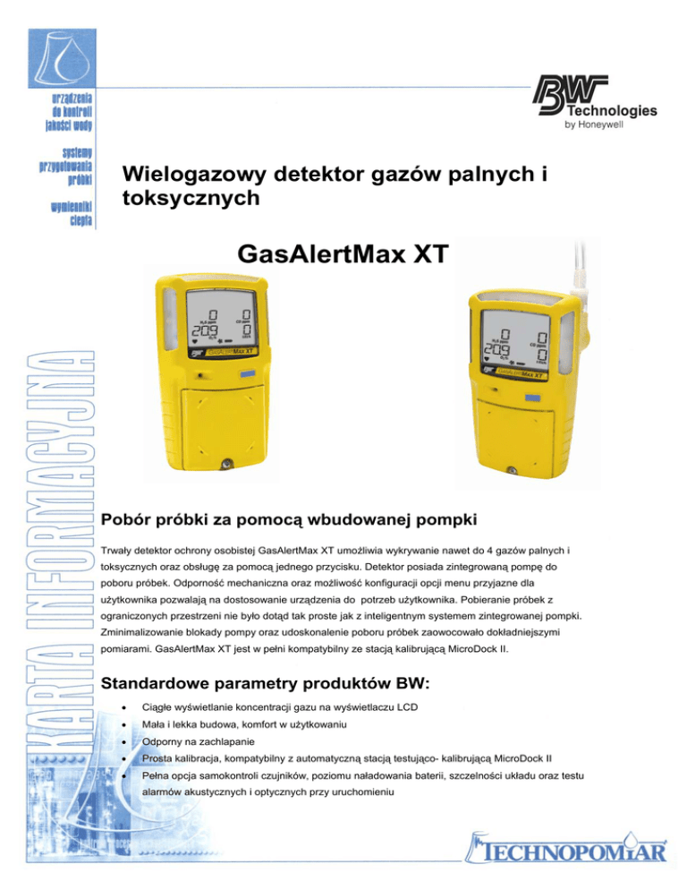 Wielogazowy detektor gazów palnych i toksycznych GasAlertMax XT Pobór próbki za pomocą wbudowanej pompki Trwały detektor ochrony osobistej GasAlertMax XT umożliwia wykrywanie nawet do 4 gazów palnych i toksycznych oraz obsługę za pomocą jednego przycisku. Detektor posiada zintegrowaną pompę do poboru próbek. Odporność mechaniczna oraz możliwość konfiguracji opcji menu przyjazne dla użytkownika pozwalają na dostosowanie urządzenia do potrzeb użytkownika. Pobieranie próbek z ograniczonych przestrzeni nie było dotąd tak proste jak z inteligentnym systemem zintegrowanej pompki. Zminimalizowanie blokady pompy oraz udoskonalenie poboru próbek zaowocowało dokładniejszymi pomiarami. GasAlertMax XT jest w pełni kompatybilny ze stacją kalibrującą MicroDock II. Standardowe parametry produktów BW: • Ciągłe wyświetlanie koncentracji gazu na wyświetlaczu LCD • Mała i lekka budowa, komfort w użytkowaniu • Odporny na zachlapanie • Prosta kalibracja, kompatybilny z automatyczną stacją testująco- kalibrującą MicroDock II • Pełna opcja samokontroli czujników, poziomu naładowania baterii, szczelności układu oraz testu alarmów akustycznych i optycznych przy uruchomieniu • Jasne, dobrze widoczne znaczniki alarmu • Odporny na wstrząsy Dodatkowe cechy GasAlertMax XT: • Zintegrowana pompa z dokładną membraną; • Najlepszy w swojej klasie czujnik blokady z półprzewodnikowym przewodem ciśnieniowym; • Obsługa w języku Angielskim, Francuskim, Niemieckim, Hiszpańskim oraz Portugalskim; • Zarządzanie za pomocą programu Fleet Manager II • Standardowa funkcja zapisu danych GasAlertMaxXT Specyfikacja • Wymiary: 5.1 x 2.8 x 2.0 in. / 13.1 x 7.0 x 5.2 cm • Waga 11.5 oz. / 328 g • Temperatura pracy -4 to 122ºF / -20 to 50ºC • Wilgotność 10 - 100% RH (brak kondensacji) • Alarmy - optyczny, wibracyjny, akustyczny (95dB) - Niski(A1), wysoki(A2), STEL, TWA, Przekroczenie progu alarmowego, niski poziom baterii, awaria pompy • Testy optyczne/akustyczne alarmy przy włączeniu, czujników, baterii, pompy oraz szczelności obwodu (ciągły) • Wytrzymałość baterii: - 13 godzin @ 32F / 0C; - 8 godzin @ -4F / -20C; - Ładowanie w 6 h • Wydajność pompy próbki maks z 75 ft. / 23 m • Opcje dostępne dla użytkownika 9 Dźwięk gotowości do pracy 9 Zabezpieczenie czujnika 9 Alarm podtrzymany 9 Bezpieczny tryb wyświetlacza 9 Blokada kalibracji IR 9 Wybór lokalizacji 9 Wymuszony test blokady 9 Wymuszony test uderzeniowy „bump test” po upływie ważności 9 Wymuszony test kalibracji po upływie ważności 9 Konfiguracja czujnika 9 Identyfikacja miernika 9 Powiadomienie o alarmie A1 9 Wybór z 5 języków 9 Ustawienie wiadomości startowej 9 Przedziały ufności 9 Dziennik danych 9 System ochrony 9 EMI/RFI: Zgodny z EMC Directive 89/336/EEC 9 IP66/67 9 Certyfikaty: ATEX: ul. Buforowa 4c, 52-131 Wrocław tel. +4871 332 98 00, fax +4871 332 98 30 www.technopomiar.pl, [email protected] CE EX II 1G Ex ia d IIC T4