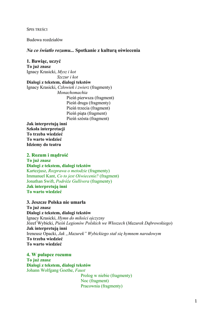 SPIS TREŚCI Budowa rozdziałów Na co światło rozumu... Spotkanie z kulturą oświecenia 1. Bawiąc, uczyć To już znasz Ignacy Krasicki, Mysz i kot Szczur i kot Dialogi z tekstem, dialogi tekstów Ignacy Krasicki, Człowiek i zwierz (fragmenty) Monachomachia Pieśń pierwsza (fragment) Pieśń druga (fragmenty) Pieśń trzecia (fragment) Pieśń piąta (fragment) Pieśń szósta (fragment) Jak interpretują inni Szkoła interpretacji To trzeba wiedzieć To warto wiedzieć Idziemy do teatru 2. Rozum i mądrość To już znasz Dialogi z tekstem, dialogi tekstów Kartezjusz, Rozprawa o metodzie (fragmenty) Immanuel Kant, Co to jest Oświecenie? (fragment) Jonathan Swift, Podróże Gullivera (fragmenty) Jak interpretują inni To warto wiedzieć 3. Jeszcze Polska nie umarła To już znasz Dialogi z tekstem, dialogi tekstów Ignacy Krasicki, Hymn do miłości ojczyzny Józef Wybicki, Pieśń Legionów Polskich we Włoszech (Mazurek Dąbrowskiego) Jak interpretują inni Ireneusz Opacki, Jak „Mazurek” Wybickiego stał się hymnem narodowym To trzeba wiedzieć To warto wiedzieć 4. W pułapce rozumu To już znasz Dialogi z tekstem, dialogi tekstów Johann Wolfgang Goethe, Faust Prolog w niebie (fragmenty) Noc (fragment) Pracownia (fragmenty) 1 Faust – cały dramat Jak interpretują inni Józef Tischner, Bóle rozczarowanych (fragment) To warto wiedzieć Dialog z tradycją Leszek Kołakowski, O wolności (fragmenty) Rafał Olbiński, Płytka analogia Wisława Szymborska, Głos w sprawie pornografii Przemyśl na nowo Trzeba przemyśleć, trzeba zapamiętać Miej serce i patrzaj w serce. Spotkanie z kulturą romantyzmu: Adam Mickiewicz 1. Miłość romantyczna To już znasz Dialogi z tekstem, dialogi tekstów Adam Mickiewicz, Romantyczność Trzech Budrysów (ballada litewska) IV część Dziadów (fragmenty) Jak interpretują inni Marta Piwińska, Miłość romantyczna (fragment) To trzeba wiedzieć To warto wiedzieć 2. Romantyczne krajobrazy To już znasz Dialogi z tekstem, dialogi tekstów Adam Mickiewicz, Stepy akermańskie Widok gór ze stepów Kozłowa Bakczysaraj Jak interpretują inni Alina Witkowska, [Nowatorstwo „Sonetów krymskich”] To warto wiedzieć 3. Dramat władzy i wolności To już znasz Dialogi z tekstem, dialogi tekstów Adam Mickiewicz, III część Dziadów Scena IX. Noc Dziadów (fragmenty) Prolog (fragment) Scena I (fragment) Szkoła interpretacji Adam Mickiewicz, III część Dziadów Scena II. Improwizacja (fragmenty) Scena V (fragment) Jak interpretują inni Dariusz Kosiński, Teatra polskie. Historie (fragment) To trzeba wiedzieć To warto wiedzieć 2 Idziemy do kina 4. Ocalająca siła pamięci To już znasz Dialogi z tekstem, dialogi tekstów Adam Mickiewicz, Pan Tadeusz – cały utwór [Spowiedź Jacka Soplicy] [Porządek przy stole] [Śniadanie] [Bigos] [Muchy] [Mrówki] [Zachód słońca] [Polonez] Tomasz Różycki Dwanaście stacji Stacja trzecia: Pierogi (fragment) Jak interpretują inni To trzeba wiedzieć To warto wiedzieć Dialog z tradycją Maria Janion, Zmierzch paradygmatu (fragmenty) Bronisław Linke, Autobus Witold Gombrowicz, Trans-Atlantyk (fragment) Przemyśl na nowo Trzeba przemyśleć, trzeba zapamiętać Jednak zostanie po mnie ta siła fatalna… Spotkanie z kulturą romantyzmu. Juliusz Słowacki, Zygmunt Krasiński 1. Melancholia To już znasz Dialogi z tekstem, dialogi tekstów Juliusz Słowacki, Godzina myśli (fragment) John Keats, Oda do melancholii Jak interpretują inni Stanisław Barańczak, „Gdybym mógł tak nieprzerwanie” (fragment) To warto wiedzieć 2. Romantyczne wędrowanie To już znasz Dialogi z tekstem, dialogi tekstów Juliusz Słowacki, Rozłączenie Listy do matki (fragmenty) Hymn Jak interpretują inni To trzeba wiedzieć To warto wiedzieć 3. Dusza anielska w czerepie rubasznym 3 To już znasz Dialogi z tekstem, dialogi tekstów Juliusz Słowacki, Kordian Akt II (fragment) Akt III (fragment) Kordian – cały utwór Grób Agamemnona (fragmenty) Testament mój Jak interpretują inni Mieczysław Inglot, [Kordian – imperatyw wolności] Maria Kalinowska, Słowackiego greckie sny o Polsce (fragmenty) To trzeba wiedzieć To warto wiedzieć Szkoła interpretacji Idziemy do teatru 4. Romantyczni i rozważni To już znasz Dialogi z tekstem, dialogi tekstów Juliusz Słowacki, Fantazy Akt I. Scena IV (fragment) Akt I. Scena VII (fragment) Akt I. Scena XIV (fragment) Jak interpretują inni Wacław Borowy, Uwagi o „Fantazym” (fragmenty) To warto wiedzieć 5. Poezja i rewolucja To już znasz Dialogi z tekstem, dialogi tekstów Zygmunt Krasiński, Nie-Boska komedia Część pierwsza (fragment) Część trzecia (fragment) Część czwarta (fragment) Jak interpretują inni Maria Janion, [Krasińskiego wizja rewolucji] To trzeba wiedzieć To warto wiedzieć Dialog z tradycją Kocham Julka. Z Aliną Kowalczykową rozmawia Justyna Sobolewska Edward Hopper, Niedziela Jacek Kaczmarski, Mury Przemyśl na nowo Trzeba przemyśleć, trzeba zapamiętać Odpowiednie dać rzeczy słowo. Spotkanie z kulturą późnego romantyzmu. Cyprian Norwid 1. Naród, społeczeństwo, człowiek 4 To już znasz Dialogi z tekstem, dialogi tekstów Cyprian Norwid, Moja piosnka [II] Moja ojczyzna Język-ojczysty List do Michaliny z Dziekońskich Zaleskiej (fragment) Jak interpretują inni To trzeba wiedzieć To warto wiedzieć 2. Sztuka w nowoczesnym świecie To już znasz Dialogi z tekstem, dialogi tekstów Cyprian Norwid, „Ad leones!” (fragmenty) Promethidion (fragmenty) Za wstęp (Ogólniki) Szkoła interpretacji Jak interpretują inni Alina Witkowska, Artystyczna siła ironii Norwida (fragment) Sztuka i rzeczywistość (fragment) Michał Głowiński, „Odpowiednie dać rzeczy słowo” (fragmenty) To warto wiedzieć Idziemy do kina 3. Ironia wiersza, ironia zdarzenia To już znasz Dialogi z tekstem, dialogi tekstów Cyprian Norwid, Ostatni despotyzm Fraszka Jak interpretują inni To warto wiedzieć Dialog z tradycją Jan Paweł II, Pami