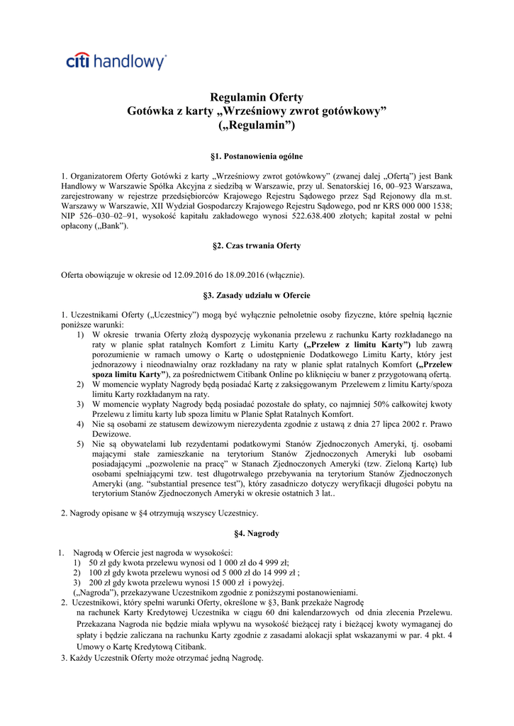 Regulamin Oferty Gotówka z karty „Wrześniowy zwrot gotówkowy” („Regulamin”) §1. Postanowienia ogólne 1. Organizatorem Oferty Gotówki z karty „Wrześniowy zwrot gotówkowy” (zwanej dalej „Ofertą”) jest Bank Handlowy w Warszawie Spółka Akcyjna z siedzibą w Warszawie, przy ul. Senatorskiej 16, 00–923 Warszawa, zarejestrowany w rejestrze przedsiębiorców Krajowego Rejestru Sądowego przez Sąd Rejonowy dla m.st. Warszawy w Warszawie, XII Wydział Gospodarczy Krajowego Rejestru Sądowego, pod nr KRS 000 000 1538; NIP 526–030–02–91, wysokość kapitału zakładowego wynosi 522.638.400 złotych; kapitał został w pełni opłacony („Bank”). §2. Czas trwania Oferty Oferta obowiązuje w okresie od 12.09.2016 do 18.09.2016 (włącznie). §3. Zasady udziału w Ofercie 1. Uczestnikami Oferty („Uczestnicy”) mogą być wyłącznie pełnoletnie osoby fizyczne, które spełnią łącznie poniższe warunki: 1) W okresie trwania Oferty złożą dyspozycję wykonania przelewu z rachunku Karty rozkładanego na raty w planie spłat ratalnych Komfort z Limitu Karty („Przelew z limitu Karty”) lub zawrą porozumienie w ramach umowy o Kartę o udostępnienie Dodatkowego Limitu Karty, który jest jednorazowy i nieodnawialny oraz rozkładany na raty w planie spłat ratalnych Komfort („Przelew spoza limitu Karty”), za pośrednictwem Citibank Online po kliknięciu w baner z przygotowaną ofertą. 2) W momencie wypłaty Nagrody będą posiadać Kartę z zaksięgowanym Przelewem z limitu Karty/spoza limitu Karty rozkładanym na raty. 3) W momencie wypłaty Nagrody będą posiadać pozostałe do spłaty, co najmniej 50% całkowitej kwoty Przelewu z limitu karty lub spoza limitu w Planie Spłat Ratalnych Komfort. 4) Nie są osobami ze statusem dewizowym nierezydenta zgodnie z ustawą z dnia 27 lipca 2002 r. Prawo Dewizowe. 5) Nie są obywatelami lub rezydentami podatkowymi Stanów Zjednoczonych Ameryki, tj. osobami mającymi stałe zamieszkanie na terytorium Stanów Zjednoczonych Ameryki lub osobami posiadającymi ,,pozwolenie na pracę” w Stanach Zjednoczonych Ameryki (tzw. Zieloną Kartę) lub osobami spełniającymi tzw. test długotrwałego przebywania na terytorium Stanów Zjednoczonych Ameryki (ang. “substantial presence test”), który zasadniczo dotyczy weryfikacji długości pobytu na terytorium Stanów Zjednoczonych Ameryki w okresie ostatnich 3 lat.. 2. Nagrody opisane w §4 otrzymują wszyscy Uczestnicy. §4. Nagrody Nagrodą w Ofercie jest nagroda w wysokości: 1) 50 zł gdy kwota przelewu wynosi od 1 000 zł do 4 999 zł; 2) 100 zł gdy kwota przelewu wynosi od 5 000 zł do 14 999 zł ; 3) 200 zł gdy kwota przelewu wynosi 15 000 zł i powyżej. („Nagroda”), przekazywane Uczestnikom zgodnie z poniższymi postanowieniami. 2. Uczestnikowi, który spełni warunki Oferty, określone w §3, Bank przekaże Nagrodę na rachunek Karty Kredytowej Uczestnika w ciągu 60 dni kalendarzowych od dnia zlecenia Przelewu. Przekazana Nagroda nie będzie miała wpływu na wysokość bieżącej raty i bieżącej kwoty wymaganej do spłaty i będzie zaliczana na rachunku Karty zgodnie z zasadami alokacji spłat wskazanymi w par. 4 pkt. 4 Umowy o Kartę Kredytową Citibank. 3. Każdy Uczestnik Oferty może otrzymać jedną Nagrodę. 1. 4. Nagrody będą przekazywane w postaci określonej w niniejszym Regulaminie, bez możliwości wypłaty ich równowartości w gotówce lub zamiany na inną nagrodę rzeczową. §5. Reklamacje 1. Bank przyjmuje skargi i reklamacje dotyczące Oferty, od Klientów w formie: a) pisemnej – złożonej osobiście w Oddziale Banku w godzinach pracy Oddziału, albo przesłanej na adres Citi Handlowy, Departament Obsługi Reklamacji i Zapytań Klientów, ul. Goleszowska 6, 01-249 Warszawa, b) ustnie – telefonicznie albo osobiście do protokołu podczas wizyty Klienta w Oddziale Banku; c) w formie elektronicznej – na adres poczty elektronicznej Banku, przez Citibank Online po zalogowaniu w zakładce „Kontakt z bankiem” oraz na stronie www.citibank.pl korzystając z formularza reklamacyjnego. 2. Aktualne dane kontaktowe umożliwiające złożenie skargi i reklamacji są dostępne na stronie internetowej Banku (www.citibank.pl). 3. Na żądanie Klienta Bank potwierdza wpływ skargi i reklamacji w formie pisemnej lub w inny sposób uzgodniony z Klientem. 4. Klient ma możliwość złożenia skargi lub reklamacji przez pełnomocnika dysponującego pełnomocnictwem udzielonym w formie pisemnej notarialnie poświadczonej, notarialnej bądź udzielonym przez Klienta w Oddziale Banku w zwykłej formie pisemnej w obecności pracownika Banku. 5. Złożenie skargi lub reklamacji niezwłocznie po powzięciu przez Klienta zastrzeżeń ułatwi i przyśpieszy rzetelne jej rozpatrzenie przez Bank chyba, że okoliczność ta nie ma wpływu na sposób procedowania ze skargą bądź reklamacją. 6. Bank może zażądać od Klienta przedstawienia informacji i dokumentów uzupełniających, o ile ich przedstawienie jest niezbędne do rozpatrzenia skargi bądź reklamacji. 7. W celu umożliwienia szybkiego i efektywnego rozpatrzenia skargi lub reklamacji, zaleca się aby reklamacja zawierała opis zdarzenia, którego dotyczy, wskazanie uchybienia, które jest jej przedmiotem, podanie nazwiska pracownika obsługującego Klienta (lub okoliczności pozwalających na jego identyfikację), a w przypadku poniesienia szkody, określenie w sposób wyraźny roszczenia Klienta z tytułu zaistniałych nieprawidłowości. 8. O wyniku rozpatrzenia skargi lub reklamacji, Klient zostanie poinformowany bez zbędnej zwłoki, jednak nie później niż w terminie 30 dni od daty otrzymania reklamacji przez Bank. 9. W szczególnie skomplikowanych przypadkach, uniemożliwiających rozpatrzenie skargi lub reklamacji i udzielenie odpowiedzi w terminie, o którym mowa w pkt 3 powyżej, Bank w informacji przekazywanej Klientowi: a) wyjaśni przyczynę opóźnienia; b) wskazuje okolic