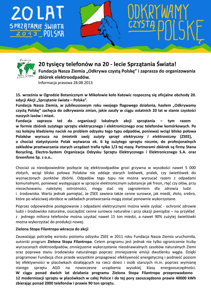 20 tysięcy telefonów na 20 - lecie Sprzątania Świata! Fundacja Nasza Ziemia „Odkrywa czystą Polskę” i zaprasza do organizowania zbiórek elektroodpadów. Informacja prasowa 28.08.2013 15. września w Ogrodzie Botanicznym w Mikołowie koło Katowic rozpoczną się oficjalne obchody 20. edycji Akcji „Sprzątanie świata – Polska”. Fundacja Nasza Ziemia, w jubileuszowym roku swojego flagowego działania, hasłem „Odkrywamy czystą Polskę” zachęca do odkrywania zmian, jakie zaszły w ciągu ostatnich 20 lat w stanie czystości naszych lasów i miast. Fundacja zaprasza też do organizacji lokalnych akcji sprzątania – tym razem w formie zbiórek zużytego sprzętu elektrycznego i elektronicznego oraz telefonów komórkowych. Po raz kolejny kładziemy nacisk na problem odzysku tego typu odpadów, ponieważ wciąż blisko połowa Polaków wyrzuca na śmietnik swój zużyty sprzęt elektryczny i elektroniczny (ZSEE), a chociaż statystycznie Polak wytwarza ok. 6 kg zużytego sprzętu rocznie, do profesjonalnych zakładów przetwarzania starych urządzeń trafia tylko 1/3 tej masy. Partnerami zbiórek są firmy Stena Recycling, Electro-System Organizacja Odzysku Sprzętu Elektrycznego i Elektronicznego S.A. oraz Greenfone Sp. z o.o.. Chociaż za nieodpowiednie pozbycie się elektroodpadów grozi grzywna w wysokości nawet 5 000 złotych, wciąż blisko połowa Polaków nie oddaje starych lodówek, pralek, czy świetlówek do wyznaczonych punktów zbiórki. Odpadów tego typu nie można wyrzucać razem z odpadami komunalnymi, ponieważ występujące w sprzęcie elektronicznym substancje jak freon, rtęć czy ołów, przy niezachowaniu należytej ostrożności, mogą stać się zagrożeniem dla zdrowia ludzi i środowiska. Warto jednak pamiętać, że ZSEE zawiera także cenne surowce, jak miedź, złoto, srebro, które po właściwej obróbce w zakładach przetwarzania mogą zostać ponownie wykorzystane. Poprzez odpowiednie postępowanie z odpadami elektrycznymi można wiele zyskać - ochronić zdrowie ludzi i środowisko naturalne, oszczędzić cenne surowce naturalne i przy okazji pieniądze – na przykład z jednego miliona telefonów można uzyskać nawet 15 ton miedzi, a nawet 90% zużytej świetlówki można wykorzystać do produkcji nowej. Zielona Stopa Filantropa wkracza do akcji Zauważając potrzebę wzrostu poziomu odzysku ZSEE w 2011 roku Fundacja Nasza Ziemia uruchomiła, autorski program Zielona Stopa Filantropa. Celem programu jest jednak nie tylko ograniczenie liczby wyrzucanych elektroodpadów, zmniejszenie wykorzystanie nieodnawialnych zasobów naturalnych Ziemi oraz poprawa stanu środowiska naturalnego poprzez zmniejszenie emisji dwutlenku węgla. Dzięki programowi Fundacja chce przede wszystkim propagować efektywność energetyczną i podnieść poziom tej efektywności w placówkach działających na rzecz dzieci i osób starszych m.in. poprzez wymianę starego sprzętu AGD na nowoczesne urządzenia wysokiej klasy energooszczędności. W ciągu ponad dwóch lat działania programu Zielona Stopa Filantropa przeprowadzono 12 modernizacji sprzętu w placówkach w całej Polsce i do tej pory zaoszczędzono prawie 40000 kWh zbierając ponad 2000 telefonów i prawie 90 ton sprzętu. Zbierzmy 20 tysięcy telefonów na 20 – lecie! Z okazji okrągłego jubileuszu akcji „Sprzątanie świata – Polska” Fundacja Nasza Ziemia postawiła sobie wyzwanie zebrania równie okrągłej liczby telefonów komórkowych na rzecz Zielonej Stopy Filantropa. Fundacja wraz z Greenfone Sp. z o.o zapraszają do aktywnego włączenia się do akcji Sprzątanie świata i organizowania lokalnych zbiórek niepotrzebnych telefonów komórkowych. Zbiórki mogą organizować szkoły, firmy, organizacje pozarządowe, które po zgłoszeniu się do zbiórki, otrzymają za darmo karton na telefony. Po zakończonej zbiórce (minimum 6 telefonów) aparaty są również za darmo odbierane przez kuriera zamówionego przez Greenfone Sp. z o.o. Osoby prywatne również mogą wziąć udział w zbiórce – wystarczy, ze wyślą dobrze zapakowane telefony na koszt firmy Greenfone Sp. z o.o. . Szczegóły na stronie www.teledar.pl . Więcej informacji o zbiórkach i programie Zielona Stopa Filantropa można uzyskać u koordynatorki: [email protected] . Zbiórki elektroodpadów ze Stena Recycling – 21 września Już po raz trzeci Fundacja Nasza Ziemia, we współpracy ze Stena Recycling, organizuje serię zbiórek elektroodpadów w weekend Sprzątania świata, w centrach handlowych zarządzanych przez Inter IKEA Centre Group Poland. Tym razem zapraszamy do przynoszenia starych suszarek, telewizorów i wszystkich innych sprzętów działąjących na prąd do specjalnych punktów zlokalizowanych w Warszawie (Park Handlowy Janki i Park Handlowy Targówek), Łodzi (Centrum Handlowe Port Łódź), Wrocławiu (Park Handlowy Bielany), Gdańsku (Park Handlowy Matarnia), Poznań (Prark Handlowy Pranowo), Katowic (Park Handlowy Rawa). Lokalne Zbiórki elekroodpadów Zbiórki mogą się również odbyć poza wyżej wymienionymi lokalizacjami – zapraszamy do ich organizacji! Wszystkie zainteresowane instytucje, placówki edukacyjne, firmy czy stowarzyszenie zachęcamy do organizacji zbiórek lokalnych. Wystarczy zgłosić zainteresowanie organizacją takiej zbiórki do Fundacji, która wspólnie z partnerami akcji odbierze zgromadzony sprzęt. Zgłoszenia zbiórek zbierane są do 6. września sierpnia pod adresem: [email protected] . Dochód z zebranych ZSEE zostanie przekazany na program "Zielona Stopa Filantropa", którego głównym celem jest zwiększanie efektywności energetycznej poprzez wymianę starych sprzętów AGD na nowoczesne i energooszczędne urządzenia w placówkach służących kształceniu i wychowaniu dzieci. Więcej informacji o programie i jego efektach można znaleźć na stronie www.teledar.pl. Partnerem lokalnych zbiórek jest Electro-System Organizacja Odzysku Sprzętu Elekt
