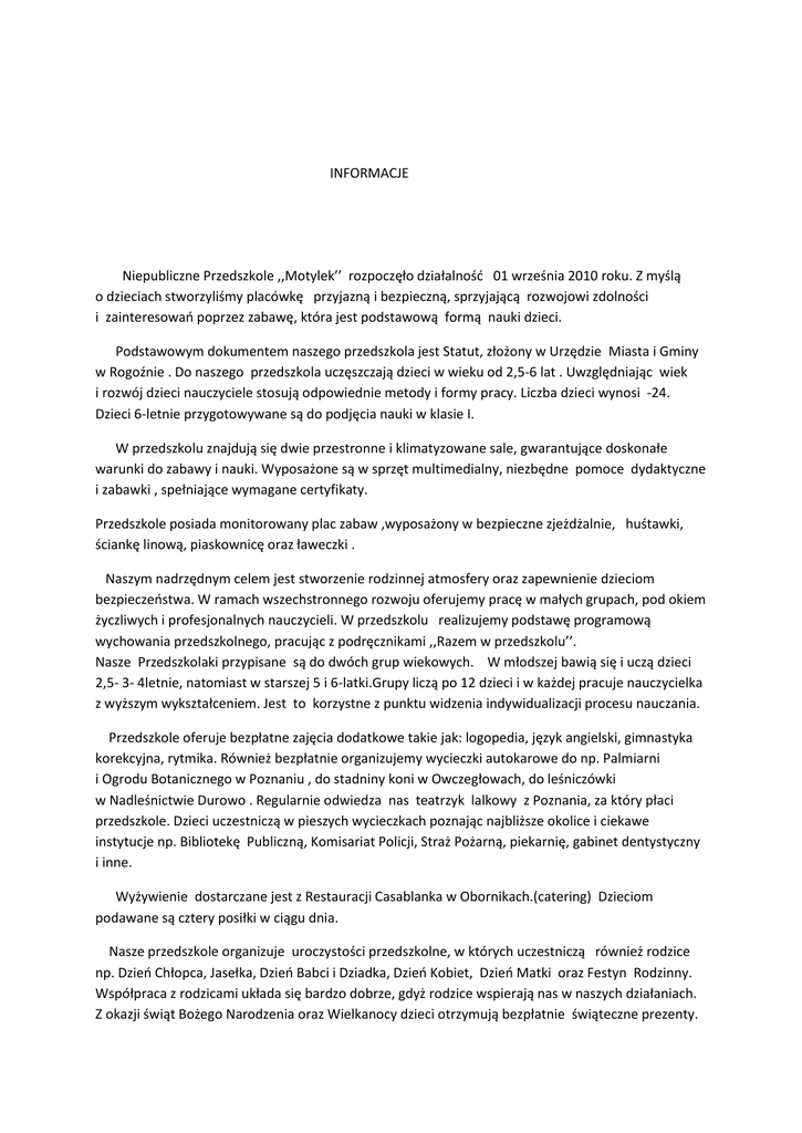 INFORMACJE Niepubliczne Przedszkole ,,Motylek’’ rozpoczęło działalność 01 września 2010 roku. Z myślą o dzieciach stworzyliśmy placówkę przyjazną i bezpieczną, sprzyjającą rozwojowi zdolności i zainteresowań poprzez zabawę, która jest podstawową formą nauki dzieci. Podstawowym dokumentem naszego przedszkola jest Statut, złożony w Urzędzie Miasta i Gminy w Rogoźnie . Do naszego przedszkola uczęszczają dzieci w wieku od 2,5-6 lat . Uwzględniając wiek i rozwój dzieci nauczyciele stosują odpowiednie metody i formy pracy. Liczba dzieci wynosi -24. Dzieci 6-letnie przygotowywane są do podjęcia nauki w klasie I. W przedszkolu znajdują się dwie przestronne i klimatyzowane sale, gwarantujące doskonałe warunki do zabawy i nauki. Wyposażone są w sprzęt multimedialny, niezbędne pomoce dydaktyczne i zabawki , spełniające wymagane certyfikaty. Przedszkole posiada monitorowany plac zabaw ,wyposażony w bezpieczne zjeżdżalnie, huśtawki, ściankę linową, piaskownicę oraz ławeczki . Naszym nadrzędnym celem jest stworzenie rodzinnej atmosfery oraz zapewnienie dzieciom bezpieczeństwa. W ramach wszechstronnego rozwoju oferujemy pracę w małych grupach, pod okiem życzliwych i profesjonalnych nauczycieli. W przedszkolu realizujemy podstawę programową wychowania przedszkolnego, pracując z podręcznikami ,,Razem w przedszkolu’’. Nasze Przedszkolaki przypisane są do dwóch grup wiekowych. W młodszej bawią się i uczą dzieci 2,5- 3- 4letnie, natomiast w starszej 5 i 6-latki.Grupy liczą po 12 dzieci i w każdej pracuje nauczycielka z wyższym wykształceniem. Jest to korzystne z punktu widzenia indywidualizacji procesu nauczania. Przedszkole oferuje bezpłatne zajęcia dodatkowe takie jak: logopedia, język angielski, gimnastyka korekcyjna, rytmika. Również bezpłatnie organizujemy wycieczki autokarowe do np. Palmiarni i Ogrodu Botanicznego w Poznaniu , do stadniny koni w Owczegłowach, do leśniczówki w Nadleśnictwie Durowo . Regularnie odwiedza nas teatrzyk lalkowy z Poznania, za który płaci przedszkole. Dzieci uczestniczą w pieszych wycieczkach poznając najbliższe okolice i ciekawe instytucje np. Bibliotekę Publiczną, Komisariat Policji, Straż Pożarną, piekarnię, gabinet dentystyczny i inne. Wyżywienie dostarczane jest z Restauracji Casablanka w Obornikach.(catering) Dzieciom podawane są cztery posiłki w ciągu dnia. Nasze przedszkole organizuje uroczystości przedszkolne, w których uczestniczą również rodzice np. Dzień Chłopca, Jasełka, Dzień Babci i Dziadka, Dzień Kobiet, Dzień Matki oraz Festyn Rodzinny. Współpraca z rodzicami układa się bardzo dobrze, gdyż rodzice wspierają nas w naszych działaniach. Z okazji świąt Bożego Narodzenia oraz Wielkanocy dzieci otrzymują bezpłatnie świąteczne prezenty. Przedszkole bierze udział w różnych akcjach środowiskowych na terenie Rogoźna. Dzieci przygotowują też występy artystyczne prezentowane dla mieszkańców naszego miasta np. na Jarmarku św. Wita oraz Dnia Dziecka organizowanym przez Rogozińskie Centrum Kultury . Przedszkole posiada swoja stronę internetową , na której umieszczane są najważniejsze informacje i wydarzenia z życia przedszkola oraz galeria zdjęć . (www.przedszkole-motylek.edu.pl)