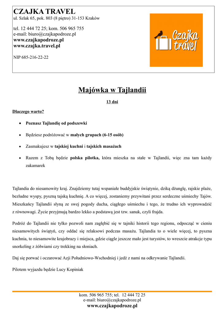 CZAJKA TRAVEL ul. Szlak 65, pok. 803 (8 piętro) 31-153 Kraków tel. 12 444 72 25; kom. 506 965 755 e-mail: [email protected] www.czajkapodroze.pl www.czajka.travel.pl NIP 685-216-22-22 Majówka w Tajlandii 13 dni Dlaczego warto? Poznasz Tajlandię od podszewki Będziesz podróżować w małych grupach (6-15 osób) Zasmakujesz w tajskiej kuchni i tajskich masażach Razem z Tobą będzie polska pilotka, która mieszka na stałe w Tajlandii, więc zna tam każdy zakamarek Tajlandia do niesamowity kraj. Znajdziemy tutaj wspaniałe buddyjskie świątynie, dziką dżunglę, rajskie plaże, bezludne wyspy, pyszną tajską kuchnię. A co więcej, zostaniemy przywitani przez serdeczne uśmiechy Tajów. Mieszkańcy Tajlandii słyną ze swej pogody ducha, ciągłego uśmiechu i tego, że trudno ich wyprowadzić z równowagi. Życie przyjmują bardzo lekko a podstawą jest tzw. sanuk, czyli frajda. Podróż do Tajlandii nie tylko pozwoli nam zagłębić się w tajniki historii tego regionu, odpocząć w cieniu niesamowitych świątyń, czy oddać się relaksowi podczas masażu. Tajlandia to o wiele więcej, to pyszna kuchnia, to niesamowite krajobrazy i miejsca, gdzie ciągle jeszcze mało jest turystów, to wreszcie atrakcje typu snorkeling z żółwiami czy trekking na słoniach. Daj się porwać i oczarować Azji Południowo-Wschodniej i jedź z nami na odkrywanie Tajlandii. Pilotem wyjazdu będzie Lucy Kopiniak kom. 506 965 755; tel. 12 444 72 25 e-mail: [email protected] www.czajkapodroze.pl PROGRAM 1 dzień: Wylot z Polski do Bangkoku. 2 dzień: BANGKOK Przylot do Bangkoku, transfer do hotelu, zakwaterowanie i czas wolny na odpoczynek po locie. Wieczorem wyprawa w szalone zakamarki uliczne miasta. Pierwsze wrażenia podczas tradycyjnego masażu tajskiego. Najlepsze sea food w mieście. Odkrywanie tajskiej kuchni ulicznej i życia nocnego miasta. Rajdy tuktukami. Nocleg w Bangkoku. 3 dzień: BANGKOK Dzień zaczniemy od wycieczki na Targ Wodny, jeden z największych w Tajlandii i ostatnich bastionów tradycji tajskiej - handlu na łódkach. Po drodze zatrzymamy się na targu, który funkcjonuje od niemalże 100 lat. Targ na torach. Codziennie przejeżdża przez targ pociąg, gdzie w tym czasie straganiki składają się w kilka sekund po czym rozkładają się od nowa. Szkoła przetrwania :) Następnie przejedziemy do Kanchanaburi, miasta i prowincji w której znajduje się znany z powieści i z filmu "Most na Rzece Kwai". Zwiedzimy muzeum Kolei Śmierci. Będzie też czas na pyszne tajskie jedzenie i zakupy. Po powrocie do Bangkoku dla chętnych tajski masaż stóp i lokalne wieczorne restauracyjki. Nocleg w Bangkoku. 4 dzień: BANGKOK – CHIANG MAI Wycieczka do najważniejszych świątyń w Bangkoku. Zaczniemy od Świątyni Szmaragdowego Buddy, gdzie poznamy legendy związane z posążkiem. Następnie udamy się do Świątyni Leżącego Buddy w której znajduje się największy posąg Buddy odpoczywającego w Bangkoku. Na koniec poznamy historię Świątyni Świtu, symbolu Bangkoku. Popołudniu transfer na stację kolejową skąd wyruszymy na północ, do byłego Królestwa Lanna. Będziemy podróżować nocnym pociągiem w kuszetkach. 5 dzień: CHIANG MAI Wcześnie rano przyjazd do miasta Chiang Mai, stolicy byłego Królestwa Lanna. Po śniadaniu i porannej kawie, ruszymy do naszego hotelu aby się zameldować i odpocząć chwilę. Popołudniu wycieczka do jednej kom. 506 965 755; tel. 12 444 72 25 e-mail: [email protected] www.czajkapodroze.pl z najciekawszych świątyń, na górze Doi Suthep. Z tą świątynią jest związana pewna legenda o białym słoniu. Nie bez przyczyny wszak wybudowano takie miejsce. Nocleg w Chiang Mai. 6 dzień: CHIANG MAI - CHIANG RAI - CHIANG MAI Całodzienna wyprawa do Chiang Rai, do Złotego Trójkąta oraz wioski plemion górskich. Zobaczymy między innymi Świątynię Wat Rong Khun, nazywaną Białą Świątynią. To niesamowita współczesna architektura sakralna. Wieczorem powrót Chiang Mai na nocleg. 7 dzień: CHIANG MAI – DOI INTHANON - CHIANG MAI Całodzienna wyprawa do Parku Narodowego Doi Inthanon, tam zakosztujemy pięknych plenerów i krajobrazów górskich. Doi Inthanon to najwyższy szczyt w Tajlandii, który liczy 2565 m n.p.m. i należy do pasma górskiego, które ciągnie się aż z Himalajów. Szczyt nazwano na cześć ostatniego władcy w Chiang Mai, który zmarł na przełomie XIX i XX wieku, a którego szczątki leżą pochowane w małym białym chedi w pobliżu szczytu. Na szczycie znajduje się jeszcze inne chedi, ale o tym już na wycieczce. Wieczorem powrót do hotelu w Chiang Mai na nocleg 8 dzień: CHIANG MAI - AYUTTHAYA Rano dla chętnych warsztaty do wyboru: - szkoła gotowania tajskich potraw, 4- godzinny kurs pozwoli na poznanie podstawowych przypraw używanych w tajskiej kuchni. Niezwykle mocne smaki i zapachy. Najbardziej popularne potrawy. - kurs masażu tajskiego, który pozwoli odkryć jego tajniki i metody relaksu. Nauczysz się między innymi, jak masować plecy, jakie stosować olejki i zioła do tajskiego masażu. W jaki sposób zrelaksować umęczone stopy i nogi oraz podstawy tradycyjnego tajskiego masażu ciała. Popołudniu transfer na stację kolejową i przejazd pociągiem nocnym na południe do Ayutthaya. Będziemy podróżować w kuszetkach. 9 dzień: AYUTTHAYA - BANGKOK Przyjazd do Ayutthaya, następnie krótki relaks. Wschód słońca nad ruinami miasta kamieni, poranna dobra kawa i śniadanie, które pozwoli nam ruszyć na zwiedzanie byłej stolicy Syjamu. Ayutthya znajduje się na liście UNESCO. Popłyniemy rzeką Królewską do Bang Pa In, pałacu letniego, pamiętającego czasy Ayutthaya, kom. 506 965 755; tel. 12 444 72 25 e-mail: [email protected] www.czajkapodroze.pl a rozbudowanego przez Króla Rama V, z obecnej dynastii. Następnie przejazd do Bangkoku. Wieczorem dla chętnych relaksujący masaż. Nocleg w Bangkoku. 10 dzień: BANGKOK – wyspa KOH CHANG Przejazd na malowniczą wyspę Koh Chang, g