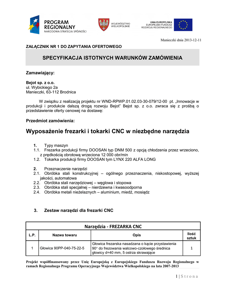 Manieczki dnia 2013-12-11 ZAŁĄCZNIK NR 1 DO ZAPYTANIA OFERTOWEGO SPECYFIKACJA ISTOTNYCH WARUNKÓW ZAMÓWIENIA Zamawiający: Bejot sp. z o.o. ul. Wybickiego 2a Manieczki, 63-112 Brodnica W związku z realizacją projektu nr WND-RPWP.01.02.03-30-079/12-00 pt. „Innowacje w produkcji i produkcie dalszą drogą rozwoju Bejot” Bejot sp. z o.o. zwraca się z prośbą o przedstawienie oferty cenowej na dostawę: Przedmiot zamówienia: Wyposażenie frezarki i tokarki CNC w niezbędne narzędzia 1. Typy maszyn 1.1. Frezarka produkcji firmy DOOSAN typ DNM 500 z opcją chłodzenia przez wrzeciono, z prędkością obrotową wrzeciona 12 000 obr/min 1.2. Tokarka produkcji firmy DOOSAN tym LYNX 220 ALFA LONG 2. Przeznaczenie narzędzi 2.1. Obróbka stali konstrukcyjnej – ogólnego przeznaczenia, niskostopowej, wyższej jakości, automatowa 2.2. Obróbka stali narzędziowej – węglowa i stopowa 2.3. Obróbka stali specjalnej – nierdzewna i kwasoodporna 2.4. Obróbka metali nieżelaznych – aluminium, miedź, mosiądz 3. Zestaw narzędzi dla frezarki CNC Narzędzia - FREZARKA CNC L.P. 1 Nazwa towaru Głowica 90PP-040-75-22-5 Ilość sztuk Opis Głowica frezarska nasadzana o kącie przystawienia 90 do frezowania walcowo-czołowego średnica głowicy d=40 mm, 5 ostrza skrawające 1 Projekt współfinansowany przez Unię Europejską z Europejskiego Funduszu Rozwoju Regionalnego w ramach Regionalnego Programu Operacyjnego Województwa Wielkopolskiego na lata 2007-2013 1|Strona Głowica frezarska trzpieniowa o kącie przystawienia 90D=25mm, L=117 mm Głowica frezarska trzpieniowa o kącie przystawienia 90 D=20 mm L=150 mm 2 Głowica 90PP-25-60-75-3 3 Głowica 90PP-20-75-150 4 Głowica PP-052-429-3 Głowica frezarska nasadzana o kącie przystawienia 90 do frezowania walcowo-czołowego średnica głowicy d=52 mm, 3 ostrza skrawające 1 5 Głowica KAF -042-508-5 Głowica frezarska nasadzana, na płytki okrągłe do frezowania walcowo-czołowego średnica głowicy d=42 mm, 5 ostrzy skrawających 1 6 Głowica 90PP-12-63-2-120 Głowica frezarska trzpieniowa o kącie przystawienia 90 do frezowania walcowo-czołowego średnica głowicy d=12 mm, 2 ostrza skrawające L=120 mm 1 7 Głowica 90PP-16-63-3-160 Głowica frezarska trzpieniowa o kącie przystawienia 90 do frezowania walcowo-czołowego średnica głowicy d=16 mm, 3 ostrza skrawające L=160 mm 1 8 Głowica BMR02-012-G16-L Głowica trzpieniowa do montażu płytek o zarysie kuli d=12 mm 1 9 Końcówka ściągajaca PS40.L54.DIN-A Śruba zaciągowa stożka (BT40 z CNC) 20 10 Oprawka BT40.A55.D27C Uchwyt służący do montażu głowic nasadzanych na średnicy d=27 mm 1 11 Oprawka BT40.A55.D22C Uchwyt służący do montażu głowic nasadzanych na średnicy d=22 mm 1 12 Oprawka BT40.A120.D22S Uchwyt służący do montażu głowic nasadzanych na średnicy d=22 mm 1 13 Oprawka BT40.A55.D16C Uchwyt służący do montażu głowic nasadzanych na średnicy d=16 mm 1 14 Oprawka BT40.A63.WE12 Uchwyt służący do montażu głowic z chwytem WELDONA D= 12 mm 1 15 Oprawka BT40.A63.WE16 16 Oprawka BT40.A63.WE20 17 Oprawka BT40.A60.WE25 18 Oprawka BT40.A70.ER32 19 Oprawka BT40.A100.ER32 20 Komplet tulejek rozprężnych ER32.KPL.18TUL Uchwyt służący do montażu głowic z chwytem WELDONA D= 16 mm Uchwyt służący do montażu głowic z chwytem WELDONA D= 20 mm Uchwyt służący do montażu głowic z chwytem WELDONA D= 25 mm Uchwyt do montażu tulejek rozprężnych ER32 A=70 mm Uchwyt do montażu tulejek rozprężnych ER32 A=100 mm Komplet tulejek rozprężnych ER32 zakres montażu od D=2 mm do D=20 mm 21 Klucz CH32S Klucz do montażu tulejek ER32 w uchwyt podstawowy 1 22 Oprawka BT40.A95.D13UW Trzpień z uchwytem wiertarskim bezkluczykowym zakres mocowania od1-13 mm 1 1 1 1 1 1 7 1 1 Projekt współfinansowany przez Unię Europejską z Europejskiego Funduszu Rozwoju Regionalnego w ramach Regionalnego Programu Operacyjnego Województwa Wielkopolskiego na lata 2007-2013 2|Strona 23 24 25 26 27 28 4. Podstawka montażowa TBAX40OU Imadło maszynowe precyzyjne pojedyncze FPZB 150/200 Wkładki pryzmowe do FPZ150 Imadło maszynowe precyzyjne podwójne FPZB 125/2x100 Wkładki pryzmowe do FPZ125 Zestaw montażowy DM-0208 (M16/18) Uchwyt warsztatowy demontażu narzędzi 1 Szerokość szczęk 150 mm, L - całkowita 420 mm 2 Wkładki do imadła FPZB 150/200 2 Szerokość szczęk 125 mm, L - całkowita 520 mm 1 Wkładki do imadła FPZB 125/2x100 1 Zestaw służący do montażu detalu obrabianego z maszyną 1 Zestaw narzędzi dla tokarki CNC Narzędzia - TOKARKA CNC Opis Ilość sztuk 1. Oprawka tokarska DWLNL 2525 M08 Oprawka tokarska zewnętrzna lewa do obróbki zgrubnej o przekroju trzonka 25x25. Mocowanie płytki z górnym zaciskiem do wszystkich rodzajów płytek ISO rozmiar 08 1 2. Oprawka tokarska MTJNL 2525 M16 Oprawka tokarska zewnętrzna lewa do obróbki zgrubnej o przekroju trzonka 25x25. Mocowanie płytki z górnym dociskiem do wszystkich rodzajów płytek ISO rozmiar 16 1 3. Oprawka tokarska SVJCL 2525 M16 Oprawka tokarska zewnętrzna prawa do obróbki wykończeniowej o przekroju trzonka 25x25. Mocowanie płytki śrubą 1 4. Oprawka tokarska SDJCL 2525 M11 Oprawka tokarska zewnętrzna lewa do obróbki wykończeniowej o przekroju trzonka 25x25. Mocowanie płytki śrubą 1 5. Oprawka tokarska AL25-3 Oprawka tokarska zewnętrzna prawa do nacinania gwintów o przekroju trzonka 25x25mm. Mocowanie płytki śrubą, płytka rozmiar 16 1 6. Oprawka tokarska AVR 20-3 Oprawka tokarska wewnętrzna prawa do nacinania gwintów o przekroju trzonka Ø20,0mm. Mocowanie płytki śrubą, 1 L.P. Nazwa towaru Projekt współfinansowany przez Unię Europejską z Europejskiego Funduszu Rozwoju Regionalnego w ramach Regionalnego Programu Operacyjnego Województwa Wielkopolskiego na lata 2007-2013 3|Strona 7. Oprawka tokarska S25S MTFNL Oprawka tokarska do toczenia wewnętrznego lewa o przekroju trzonka Ø25,0mm. Długość całkowita L=250mm Mocowanie płytki z górnym dociskiem do wszystkich