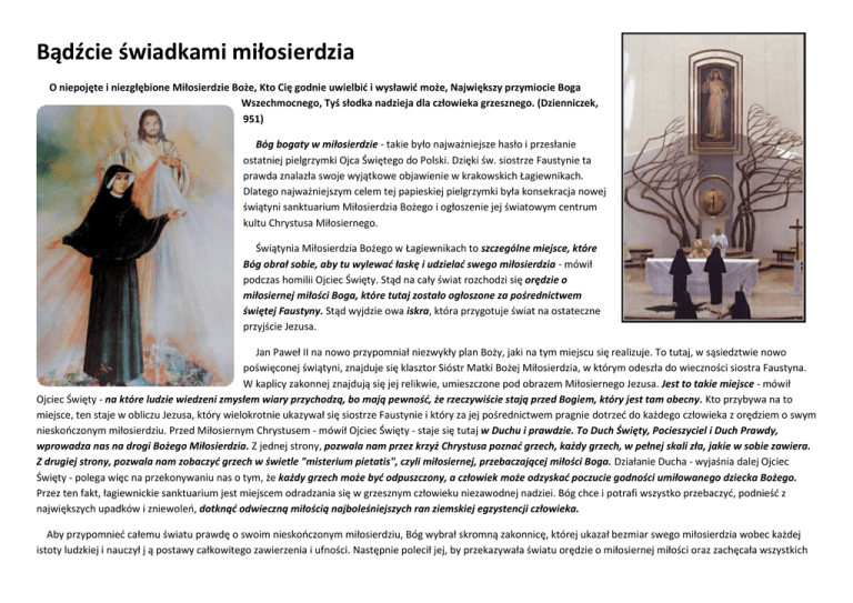 Bądźcie świadkami miłosierdzia O niepojęte i niezgłębione Miłosierdzie Boże, Kto Cię godnie uwielbić i wysławić może, Największy przymiocie Boga Wszechmocnego, Tyś słodka nadzieja dla człowieka grzesznego. (Dzienniczek, 951) Bóg bogaty w miłosierdzie - takie było najważniejsze hasło i przesłanie ostatniej pielgrzymki Ojca Świętego do Polski. Dzięki św. siostrze Faustynie ta prawda znalazła swoje wyjątkowe objawienie w krakowskich Łagiewnikach. Dlatego najważniejszym celem tej papieskiej pielgrzymki była konsekracja nowej świątyni sanktuarium Miłosierdzia Bożego i ogłoszenie jej światowym centrum kultu Chrystusa Miłosiernego. Świątynia Miłosierdzia Bożego w Łagiewnikach to szczególne miejsce, które Bóg obrał sobie, aby tu wylewać łaskę i udzielać swego miłosierdzia - mówił podczas homilii Ojciec Święty. Stąd na cały świat rozchodzi się orędzie o miłosiernej miłości Boga, które tutaj zostało ogłoszone za pośrednictwem świętej Faustyny. Stąd wyjdzie owa iskra, która przygotuje świat na ostateczne przyjście Jezusa. Jan Paweł II na nowo przypomniał niezwykły plan Boży, jaki na tym miejscu się realizuje. To tutaj, w sąsiedztwie nowo poświęconej świątyni, znajduje się klasztor Sióstr Matki Bożej Miłosierdzia, w którym odeszła do wieczności siostra Faustyna. W kaplicy zakonnej znajdują się jej relikwie, umieszczone pod obrazem Miłosiernego Jezusa. Jest to takie miejsce - mówił Ojciec Święty - na które ludzie wiedzeni zmysłem wiary przychodzą, bo mają pewność, że rzeczywiście stają przed Bogiem, który jest tam obecny. Kto przybywa na to miejsce, ten staje w obliczu Jezusa, który wielokrotnie ukazywał się siostrze Faustynie i który za jej pośrednictwem pragnie dotrzeć do każdego człowieka z orędziem o swym nieskończonym miłosierdziu. Przed Miłosiernym Chrystusem - mówił Ojciec Święty - staje się tutaj w Duchu i prawdzie. To Duch Święty, Pocieszyciel i Duch Prawdy, wprowadza nas na drogi Bożego Miłosierdzia. Z jednej strony, pozwala nam przez krzyż Chrystusa poznać grzech, każdy grzech, w pełnej skali zła, jakie w sobie zawiera. Z drugiej strony, pozwala nam zobaczyć grzech w świetle "misterium pietatis", czyli miłosiernej, przebaczającej miłości Boga. Działanie Ducha - wyjaśnia dalej Ojciec Święty - polega więc na przekonywaniu nas o tym, że każdy grzech może być odpuszczony, a człowiek może odzyskać poczucie godności umiłowanego dziecka Bożego. Przez ten fakt, łagiewnickie sanktuarium jest miejscem odradzania się w grzesznym człowieku niezawodnej nadziei. Bóg chce i potrafi wszystko przebaczyć, podnieść z największych upadków i zniewoleń, dotknąć odwieczną miłością najboleśniejszych ran ziemskiej egzystencji człowieka. Aby przypomnieć całemu światu prawdę o swoim nieskończonym miłosierdziu, Bóg wybrał skromną zakonnicę, której ukazał bezmiar swego miłosierdzia wobec każdej istoty ludzkiej i nauczył j ą postawy całkowitego zawierzenia i ufności. Następnie polecił jej, by przekazywała światu orędzie o miłosiernej miłości oraz zachęcała wszystkich ludzi do ufności wobec Miłosiernego Zbawiciela. Jezus, który wielokrotnie objawiał się siostrze Faustynie, ukazał jej tajemnice swego Serca, które jest przepełnione pragnieniem miłowania dusz i przebaczania im nawet największych grzechów, pod jednym tylko warunkiem, że zwrócą się do Niego z ufnością poprzez akt szczerej modlitwy, skruchy i w sakramencie pojednania. W celu obudzenia w nas postawy zaufania, poleca namalować obraz z napisem: "Jezu, ufam Tobie". Pragniemy oczyma duszy wpatrywać się w oczy miłosiernego Jezusa - powiedział Papież w Łagiewnikach - aby w głębi Jego spojrzenia znaleźć odbicie własnego życia oraz światło łaski, którą już po wielekroć otrzymaliśmy i którą Bóg zachowuje dla nas na każdy dzień i na dzień ostateczny. Dalej, Jezus wyznacza taki moment w ciągu dnia, w którym szczególnie udziela się nam w tajemnicy swego miłosierdzia: godzina trzecia po południu. Ilekroć usłyszysz, jak zegar bije trzecią godzinę, zanurzaj się cała w miłosierdziu moim, uwielbiając i wysławiając je; wzywaj jego wszechmocy dla świata całego, a szczególnie dla biednych grzeszników, bo w tej chwili zostało na oścież otwarte dla wszelkiej duszy (Dzienniczek, 1572). Innym razem, Jezus dyktuje specjalną modlitwę - koronkę - zapewniając, że przez odmawianie tej koronki podoba mi się dać wszystko, o co mnie prosić będą... jeżeli to będzie zgodne z wolą moją (Dzienniczek, 1541,1731). Ojciec Święty mówił w Łagiewnikach, że na wszystkich kontynentach z głębin ludzkiego cierpienia zdaje się wznosić wołanie o miłosierdzie. Tam, gdzie panuje nienawiść i chęć odwetu, gdzie wojna przynosi ból i śmierć niewinnych, potrzeba łaski miłosierdzia, które koi ludzkie umysły i serca, i rodzi pokój. Gdzie brak szacunku dla życia i godności człowieka, potrzeba miłosiernej miłości Boga, w której świetle odsłania się niewypowiedziana wartość każdego ludzkiego istnienia. Potrzeba miłosierdzia, aby wszelka niesprawiedliwość na świecie znalazła kres w blasku prawdy. Dlatego dziś w tym sanktuarium, chcę dokonać uroczystego aktu zawierzenia świata Bożemu miłosierdziu. Czynię to z gorącym pragnieniem, aby orędzie o miłosiernej miłości Boga, które tu zostało ogłoszone przez pośrednictwo św. Faustyny, dotarło do wszystkich mieszkańców ziemi i napełniało ich serca nadzieją. Niech to przesłanie rozchodzi się z tego miejsca na całą naszą umiłowaną Ojczyznę i na cały świat. Niech się spełnia zobowiązująca obietnica Pana Jezusa, że stąd ma wyjść "iskra, która przygotuje świat na ostateczne Jego przyjście" (por. Dzienniczek, 1732). Trzeba tę iskrę Bożej łaski rozniecać. Trzeba przekazywać światu ogień miłosierdzia. W miłosierdz