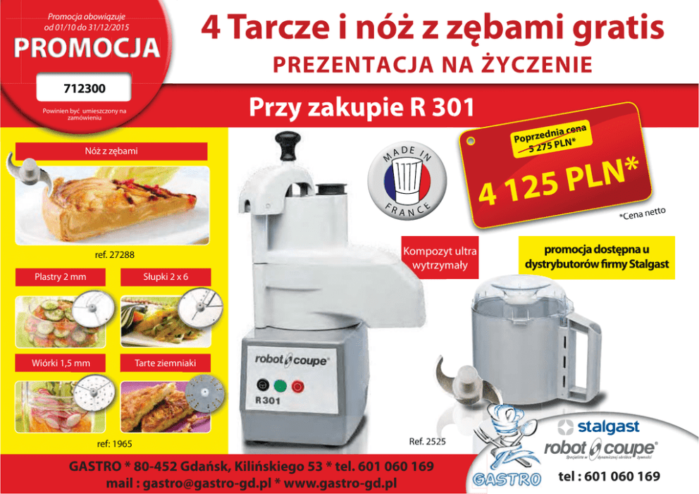 4 Tarcze i nóż z zębami gratis Promocja obowiązuje od 01/10 do 31/12/2015 PREZENTACJA NA ŻYCZENIE 712300 Przy zakupie R 301 Powinien być umieszczony na zamówieniu Nóż z zębami M A DE IN FR Kompozy Kompozyt ultra wytrzymały wytrzym ref. 27288 Plastry 2 mm Słupki 2 x 6 Wiórki 1,5 mm Tarte ziemniaki ref: 1965 E AN C na dnia ce e z r p o P LN* 5 275 P * N L P 4 125 etto *Cena n promocja dostępna u dystrybutorów firmy Stalgast Ref. 2525 52 25 Specjalista w GASTRO * 80-452 Gdańsk, Kilińskiego 53 * tel. 601 060 169 mail : [email protected] * www.gastro-gd.pl dynamicznej obro’bce z·ywnos’ci tel : 601 060 169 OPCJE Wiele sposobów krojenia Gładki nóż dostępny w wersji standardowej Nóże Nóż gładki: 6 rodzajów plastrów: od 1 mm do 6 mm • drobne i grube mielenie • sosy i zawiesiny 1 rodzaj plastrów falistych: 2 мм Nóż z nacięciami: • zioła i przyprawy 10 rodzajów wiórków: od 1,5 mm do 9 mm Nóż z zębami: 6 rodzajów słupków: od 2 x 2 mm do 8 x 8 mm • rozdrabnianie • wyrabianie ciasta