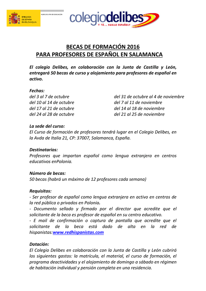 BECAS DE FORMACIÓN 2016 PARA PROFESORES DE ESPAÑOL EN SALAMANCA El colegio Delibes, en colaboración con la Junta de Castilla y León, entregará 50 becas de curso y alojamiento para profesores de español en activo. Fechas: del 3 al 7 de octubre del 10 al 14 de octubre del 17 al 21 de octubre del 24 al 28 de octubre del 31 de octubre al 4 de noviembre del 7 al 11 de noviembre del 14 al 18 de noviembre del 21 al 25 de noviembre La sede del curso: El Curso de formación de profesores tendrá lugar en el Colegio Delibes, en la Avda de Italia 21, CP: 37007, Salamanca, España. Destinatarios: Profesores que impartan español como lengua extranjera en centros educativos enPolonia. Número de becas: 50 becas (habrá un máximo de 12 profesores cada semana) Requisitos: - Ser profesor de español como lengua extranjera en activo en centros de la red pública o privados en Polonia. - Documento sellado y firmado por el director que acredite que el solicitante de la beca es profesor de español en su centro educativo. - E mail de confirmación o captura de pantalla que acredite que el solicitante de la beca está dado de alta en la red de hispanistas:www.redhispanistas.com Dotación: El Colegio Delibes en colaboración con la Junta de Castilla y León cubrirá los siguientes gastos: la matrícula, el material, el curso de formación, el programa deactividades y el alojamiento de domingo a sábado en régimen de habitación individual y pensión completa en una residencia.