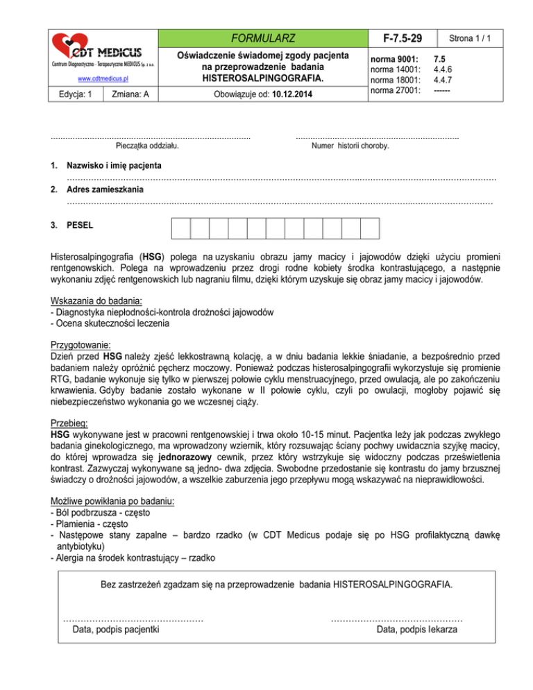 FORMULARZ www.cdtmedicus.pl Edycja: 1 F-7.5-29 Oświadczenie świadomej zgody pacjenta na przeprowadzenie badania HISTEROSALPINGOGRAFIA. Zmiana: A Obowiązuje od: 10.12.2014 ………………………………………………………………………. Pieczątka oddziału. norma 9001: norma 14001: norma 18001: norma 27001: Strona 1 / 1 7.5 4.4.6 4.4.7 ------ …………………………………………………………. Numer historii choroby. 1. Nazwisko i imię pacjenta ……………………………………………………………………………………………….…………………………………………… 2. Adres zamieszkania ………………………………….……………………………………………………………………………..………………………… 3. PESEL Histerosalpingografia (HSG) polega na uzyskaniu obrazu jamy macicy i jajowodów dzięki użyciu promieni rentgenowskich. Polega na wprowadzeniu przez drogi rodne kobiety środka kontrastującego, a następnie wykonaniu zdjęć rentgenowskich lub nagraniu filmu, dzięki którym uzyskuje się obraz jamy macicy i jajowodów. Wskazania do badania: - Diagnostyka niepłodności-kontrola drożności jajowodów - Ocena skuteczności leczenia Przygotowanie: Dzień przed HSG należy zjeść lekkostrawną kolację, a w dniu badania lekkie śniadanie, a bezpośrednio przed badaniem należy opróżnić pęcherz moczowy. Ponieważ podczas histerosalpingografii wykorzystuje się promienie RTG, badanie wykonuje się tylko w pierwszej połowie cyklu menstruacyjnego, przed owulacją, ale po zakończeniu krwawienia. Gdyby badanie zostało wykonane w II połowie cyklu, czyli po owulacji, mogłoby pojawić się niebezpieczeństwo wykonania go we wczesnej ciąży. Przebieg: HSG wykonywane jest w pracowni rentgenowskiej i trwa około 10-15 minut. Pacjentka leży jak podczas zwykłego badania ginekologicznego, ma wprowadzony wziernik, który rozsuwając ściany pochwy uwidacznia szyjkę macicy, do której wprowadza się jednorazowy cewnik, przez który wstrzykuje się widoczny podczas prześwietlenia kontrast. Zazwyczaj wykonywane są jedno- dwa zdjęcia. Swobodne przedostanie się kontrastu do jamy brzusznej świadczy o drożności jajowodów, a wszelkie zaburzenia jego przepływu mogą wskazywać na nieprawidłowości. Możliwe powikłania po badaniu: - Ból podbrzusza - często - Plamienia - często - Następowe stany zapalne – bardzo rzadko (w CDT Medicus podaje się po HSG profilaktyczną dawkę antybiotyku) - Alergia na środek kontrastujący – rzadko Bez zastrzeżeń zgadzam się na przeprowadzenie badania HISTEROSALPINGOGRAFIA. ………………………………………… Data, podpis pacjentki ……………………………………… Data, podpis lekarza