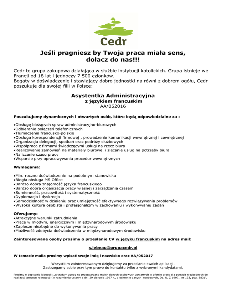 Jeśli pragniesz by Twoja praca miała sens, dołacz do nas!!! Cedr to grupa zakupowa działająca w służbie instytucji katolickich. Grupa istnieje we Francji od 18 lat i jednoczy 7 500 członków. Bogaty w doświadczenie i stawiający dobro jednostki na równi z dobrem ogółu, Cedr poszukuje dla swojej filii w Polsce: Asystentka Administracyjna z językiem francuskim AA/052016 Poszukujemy dynamicznych i otwartych osób, które będą odpowiedzialne za : •Obsługę bieżących spraw administracyjno-biurowych •Odbieranie połączeń telefonicznych •Tłumaczenia francusko-polskie •Obsługa korespondencji firmowej , prowadzenie komunikacji wewnętrznej i zewnętrznej •Organizacja delegacji, spotkań oraz podróży służbowych •Współpraca z firmami świadczącymi usługi na rzecz biura •Realizowanie zamówień na materiały biurowe, i zlecanie usług na potrzeby biura •Naliczanie czasu pracy •Wsparcie przy opracowywaniu procedur wewnętrznych Wymagania: •Min. roczne doświadczenie na podobnym stanowisku •Biegła obsługa MS Office •Bardzo dobra znajomość języka francuskiego •Bardzo dobra organizacja pracy własnej i zarządzania czasem •Sumienność, pracowitość i systematyczność •Dyplomacja i dyskrecja •Samodzielność w działaniu oraz umiejętność efektywnego rozwiązywania problemów •Wysoka kultura osobista i profesjonalizm w zachowaniu i wykonywaniu zadań Oferujemy: •Atrakcyjne warunki zatrudnienia •Pracę w młodym, energicznym i międzynarodowym środowisku •Zaplecze niezbędne do wykonywania pracy •Możliwość zdobycia doświadczenia w międzynarodowym środowisku Zainteresowane osoby prosimy o przesłanie CV w języku francuskim na adres mail: [email protected] W temacie maila prosimy wpisać swoje imię i nazwisko oraz AA/052017 Wszystkim zainteresowanym dziękujemy za przesłanie swoich aplikacji. Zastrzegamy sobie przy tym prawo do kontaktu tylko z wybranymi kandydatami. Prosimy o dopisanie klauzuli: „Wyrażam zgodę na przetwarzane moich danych osobowych zawartych w ofercie pracy dla potrzeb niezbędnych do realizacji procesu rekrutacji (w rozumieniu ustawy z dn. 29 sierpnia 1997 r., o ochronie danych osobowych, Dz. U. Z 1997., nr 133, poz. 883)”.