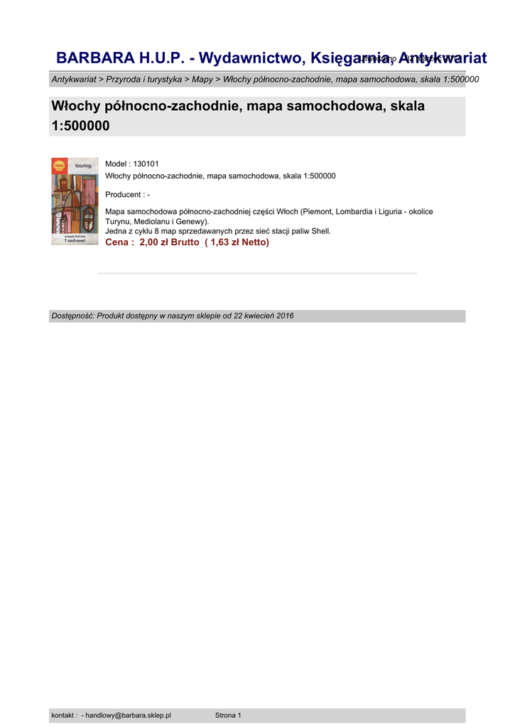 Utworzono Antykwariat : 02 marzec 2017 BARBARA H.U.P. - Wydawnictwo, Księgarnia, Antykwariat > Przyroda i turystyka > Mapy > Włochy północno-zachodnie, mapa samochodowa, skala 1:500000 Włochy północno-zachodnie, mapa samochodowa, skala 1:500000 Model : 130101 Włochy północno-zachodnie, mapa samochodowa, skala 1:500000 Producent : Mapa samochodowa północno-zachodniej części Włoch (Piemont, Lombardia i Liguria - okolice Turynu, Mediolanu i Genewy). Jedna z cyklu 8 map sprzedawanych przez sieć stacji paliw Shell. Cena : 2,00 zł Brutto ( 1,63 zł Netto) Dostępność: Produkt dostępny w naszym sklepie od 22 kwiecień 2016 kontakt : - [email protected] Strona 1