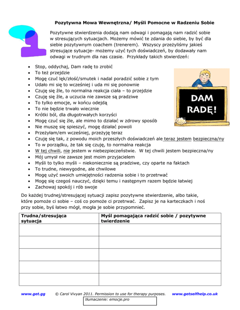 Pozytywna Mowa Wewnętrzna/ Myśli Pomocne w Radzeniu Sobie Pozytywne stwierdzenia dodają nam odwagi i pomagają nam radzić sobie w stresujących sytuacjach. Możemy mówić te zdania do siebie, by być dla siebie pozytywnym coachem (trenerem). Wszyscy przeżyliśmy jakieś stresujące sytuacje- możemy użyć tych doświadczeń, by dodawały nam odwagi w trudnym dla nas czasie. Przykłady takich stwierdzeń: Stop, oddychaj, Dam radę to zrobić To też przejdzie Mogę czuć lęk/złość/smutek i nadal poradzić sobie z tym Udało mi się to wcześniej i uda mi się ponownie Czuję się źle, to normalna reakcja ciała – to przejdzie Czuję się źle, a uczucia nie zawsze są pradziwe To tylko emocje, w końcu odejdą To nie będzie trwało wiecznie Krótki ból, dla długotrwałych korzyści Mogę czuć się źle, ale mimo to działać w zdrowy sposób Nie muszę się spieszyć, mogę działać powoli Przeżyłam/em wcześniej, przeżyję teraz Czuję się tak, z powodu moich przeszłych doświadczeń ale teraz jestem bezpieczna/ny To w porządku, że tak się czuję, to normalna reakcja W tej chwili, nie jestem w niebezpieczeństwie. W tej chwili jestem bezpieczna/ny Mój umysł nie zawsze jest moim przyjacielem Myśli to tylko myśli – niekoniecznie są pradziwe, czy oparte na faktach To trudne, niewygodne, ale chwilowe Mogę użyć swoich umiejętności radzenia sobie i to przetrwać Mogę się czegoś nauczyć, dzięki temu i następnym razem będzie łatwiej Zachowaj spokój i rób swoje Do każdej trudnej/stresującej sytuacji zapisz pozytywne stwierdzenie, albo takie, które pomoże ci sobie – coś co pomoże ci przetrwać. Zapisz je na karteczkach i noś przy sobie, byś łatwo mógł, mogła je sobie przypomnieć. Trudna/stresująca sytuacja www.get.gg Myśl pomagająca radzić sobie / pozytywne twierdzenie © Carol Vivyan 2011. Permission to use for therapy purposes. tłumaczenie: emocje.pro www.getselfhelp.co.uk