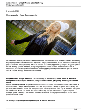Aktualności - Urząd Miasta Częstochowy Oficjalny portal miejski 8 września 2014 Mogę wszystko - Agata Dziarmagowska Do niedawna szerzej nieznana częstochowianka, uczennica liceum. Wzięła udział w wiosennej edycji programu X-Factor i chociaż odpadła z niego przed finałem, to tak naprawdę okazała się jego prawdziwą zwyciężczynią. Jeszcze w maju ukazał się jej pierwszy singiel „Mogę wszystko, nic nie muszę”, potem teledysk, który ma już ponad milion odsłon. podpisany kontrakt z Wytwórnią Warner Music Poland zakłada promocję płyty młodej wokalistki nie tylko w polsce, ale i w krajach europy Środkowo-Wschodniej. Magda Fijołek: Minęło zaledwie kilka miesięcy, a zrobiło się Ciebie pełno w mediach: teledyski w muzycznych kanałach, singiel w radiu Eska, programy telewizyjne i rzesza fanów. Agata Dziarmagowska: To prawda! Uświadomiłam to sobie w momencie, kiedy siedziałam w domu z mamą i nagle zobaczyłam na Eska TV mój teledysk. Wtedy przyszło mi do głowy, że jeszcze pół roku temu nawet nie pomyślałabym, że będę widzieć swój klip w telewizji. Wszystko tak szybko się dzieje, że nawet nie mam czasu, aby się tym nacieszyć. Ciągle robię coś nowego, gram koncerty i nie dociera do mnie do końca, że moje piosenki będą znane także poza granicami Polski. To dlatego nagrałaś piosenkę i teledysk w dwóch wersjach... 1/3 Aktualności - Urząd Miasta Częstochowy Oficjalny portal miejski Tak, ja bardzo lubię tę angielską („Drop Drop”). Śpiewanie po polsku jest dla mnie czymś nowym. Nagrywanie piosenki „Mogę wszystko, nic nie muszę” było dla mnie niemal eksperymentem. Od zawsze śpiewałam tylko po angielsku. Podświadomie bałam się śpiewania po polsku, dlatego byłam dumna, że wreszcie przełamałam w sobie tę barierę. Kiedy usłyszałam po raz pierwszy tekst tej piosenki, zastanowiło mnie, ile w nim jest Ciebie, czy się z nim utożsamiasz? Nigdy nie zdecydowałabym się na nagranie piosenki, której nie czułabym w stu procentach. Piosenka jest nie tyle o mnie, ile o młodych ludziach. Wybranie jej jako mojego pierwszego singla było bardzo świadomą decyzją. Mocno utożsamiam się z tym tekstem, napisanym przez Janusza Onufrowicza. Kiedy piosenka pojawiła się w internecie, pojawiło się pod nią dużo negatywnych komentarzy, zabolało? Pewnie. Każdy chce być akceptowany. Jednak każda osoba, która staje się osobą publiczną jest narażona na krytykę tego, co robi. Na początku bardzo się wczuwałam i przeżywałam te negatywy. Na szczęście wspiera mnie rodzina i znajomi. Nauczyłam się nie czytać komentarzy i nie zastanawiać się nad tym, czemu niektórzy ludzie mnie nie lubią. Po prostu idę do przodu i robię swoje. A może ta duża dawka hejtu wynika z tego, że jesteś charakterystyczna, wyróżniasz się w tłumie, masz silną osobowość. Ludzie tego nie lubią. Nie należę do cichych myszek, to fakt. Ale ci, którzy mnie znają, mogą potwierdzić, że bywam normalną dziewczyną. Mam spore grono znajomych, więc nie jest ze mną tak źle (śmiech). I do tego jest cała grupa fanów, którzy dodają sił w trudnych momentach! Co ze szkołą? Przecież masz 17 lat i chodzisz do liceum, a czas promocji singla nałożył się na równie gorący okres w szkole - koniec roku szkolnego. Chodzę do Liceum im. R. Traugutta w Częstochowie. Zdałam do drugiej klasy. Dużo godzin opuściłam w drugim semestrze, ale dzięki pomocy mojego wychowawcy i całego grona pedagogicznego ogarnęłam tę sytuację. Pozytywnie zaskoczyło mnie to, że mam do czynienia ze szkołą, która nie podcina skrzydeł. Pomagali też koledzy z klasy. Zdarzało się niejednokrotnie, że kiedy pisałam na grupie swojej klasy na Facebooku prośbę o pomoc, od razu pojawiały się podpowiedzi, kiedy jest jaki sprawdzian i z czego się przygotować. Nie spodziewałam się tego i dziękuję za to! Tragutt jest szkołą otwartych i kreatywnych ludzi. 2/3 Aktualności - Urząd Miasta Częstochowy Oficjalny portal miejski Czego możemy spodziewać się po Twojej płycie? Moja płyta będzie zbiorem utworów w różnych gatunkach muzycznych. Najogólniej: pop z elementami rapu i być może reggae? Będą na niej piosenki zarówno w języku angielskim, jak i polskim. Nie są to moje kompozycje, na razie wszystkiego się uczę. Jestem obecna na każdym etapie ich powstawania, chłonę tę wiedzę jak gąbka. Wiem, że kiedyś przyjdzie czas, kiedy tę wiedzę wykorzystam. Producentem płyty będzie Szwed - Mark Tysper. Udział w X-Factorze to nie był przypadek, z muzyką wiążesz swoje życie od dziecka... Taaak, wszystko zaczęło się od tego, że kupiłam sobie z własnych oszczędności grę karaoke. Siedziałam przy niej godzinami, pobijałam rekordy, a najczęściej śpiewałam piosenki Michael’a Jacksona. Już w szkole podstawowej przyszło mi do głowy, aby wystartować w jakimś konkursie, zachęcała mnie do tego także moja nauczycielka. Oglądałam programy telewizyjne, które dawały możliwość zaistnienia. I dlatego wystartowałam w jednej z edycji Mam Talent, a na wiosnę w X-Factor. Czułaś się faworytką programu? Tak kreowały Cię przecież niektóre media... Absolutnie nie. Nie byłam faworytką programu, tym bardziej Ewy Farnej. Czułam się w programie zupełnym freakiem, kosmitą. Pozostałe uczestniczki wyglądały inaczej ode mnie, trzymały się razem i bardzo wszystko przeżywały. Ja starałam się nie ponieść emocjom, nie płakałam nawet w najtrudniejszych momentach. Nie chciałam robić show i pożywki dla mediów. Dlatego podchodziłam do tego programu z dystansem, na chłodno. To była walka o swoje marzenie. Jeśli się przegrywa, to trzeba to zrobić z podniesioną głową. Wyszłam z programu silniejsza, nauczył mnie on pokory. I jak pokazał czas, nie ma tego złego... Cieszę się, że wykorzystałam swoją szansę, a teraz nie jestem kojarzona tylko jako półfinalistka X-Fac