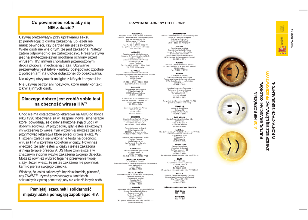 Choć nie ma ostatecznego lekarstwa na AIDS od końca roku 1996 stosowane są w Hiszpanii nowe, silne terapie które powodują, że osoby zakażone żyją długo i w dobrym zdrowiu. W przypadku, gdy jesteś zakażony/a im wcześniej to wiesz, tym wcześniej możesz zacząć przyjmować lekarstwa które poleci ci twój lekarz. W Hiszpanii zaleca się wykonanie testu na obecność wirusa HIV wszystkim kobietom w ciąży. Powinnaś wiedzieć, że gdy jesteś w ciąży i jesteś zakażona istnieją terapie przeciw AIDS które zmniejszają w znacznym stopniu ryzyko zakażenia twojego dziecka. Możesz również wybrać legalne przerwanie twojej ciąży. Jeżeli wiesz, że jesteś zakażona nie powinnaś karmić piersią swojego dziecka. Wiedząc, że jesteś zakażony/a będziesz bardziej pilnować, aby ZAWSZE używać prezerwatywy w kontaktach seksualnych z pełną penetracją aby nie zakazić innych osób. Pamiętaj, szacunek i solidarność międzyludzka pomagają zapobiegać HIV. W KONTAKTACH SEKSUALNYCH. Dlaczego dobrze jest zrobić sobie test na obecność wirusa HIV? AIDS NIE ROZRÓŻNIA Używaj prezerwatyw przy uprawianiu seksu (z penetracją) z osobą zakażoną lub jeżeli nie masz pewności, czy partner nie jest zakażony. Wiele osób nie wie o tym, że jest zakażona. Należy zatem odpowiednio się zabezpieczyć. Prezerwatywa jest najskuteczniejszym środkiem ochrony przed wirusem HIV, innymi chorobami przenoszonymi drogą płciową i niechcianą ciążą. Używanie prezerwatyw jest łatwe - należy postępować zgodnie z poleceniami na ulotce dołączonej do opakowania. Nie używaj strzykawek ani igieł, z których korzystali inni. Nie używaj ostrzy ani nożyków, które miały kontakt z krwią innych osób. ZABEZPIECZ SIĘ UŻYWAJĄC PREZERWATYWY PRZYDATNE ADRESY I TELEFONY KULTUR, GRANIC ANI KOLORÓW. Co powinieneś robić aby się NIE zakazić? Co to jest AIDS? AIDS to choroba wywołana przez wirus zwany wirusem HIV lub wirusem AIDS. Ten wirus atakuje system odpornościowy powodując, że zapadamy częściej na infekcje i różnego typu nowotwory. Osoba która ma wirusa HIV jest osobą zakażoną. Osoba zakażona może czuć się zdrowo i nie domyślać się, że jest nosicielem wirusa HIV. Jeżeli osoba ta nie będzie jednak leczona, nawet po 10 latach od zakażenia może się u niej rozwinąć choroba. Pomimo, że choroba jeszcze się nie rozwinęła, nosiciel zakaża inne osoby, jeśli nie stosuje właściwych zabezpieczeń. Aby dowiedzieć się czy jesteś zakażony/a należy wykonać zwykłe badanie krwi. Ten test można wykonać w każdym ośrodku zdrowia bez konieczności płacenia ani podawania nazwiska. Poproś o informację pod numerami telefonu które podajemy ci na ostatniej stronie. Ponad 33 miliony osób na świecie jest zakażonych wirusem HIV. Hiszpania jest jednym z państw Europy z największą liczbą zakażonych. Wirus nie wybiera granic, płci, rasy ani wieku - zagraża wszystkim, ale tylko od nas zależy, czy zdołamy się przed nim uchronić. Przede wszystkim trzeba wiedzieć: Jak jest przenoszony? Co musisz zrobić, aby się nie zakazić? AIDS Jak jest przenoszony wirus HIV? Przez kontakty seksualne bez prezerwatywy przy penetracji dopochwowej, analnej lub oralnej, pomiędzy mężczyznami i kobietami lub pomiędzy mężczyznami. BEZ AIDS Jak NIE jest przenoszony wirus HIV? Mieszkając, pracując lub spotykając się z osobą zakażoną. Chodząc do tej samej szkoły co dziewczynka lub chłopczyk zakażony. Podając rękę, obejmując się lub całując. Podczas używania strzykawek, z których wcześniej korzystały osoby zakażone. Śpiąc w tym samym łóżku. Mając kontakty seksualne bez petentracji. Użwając przedmiotów do cięcia takich jak igły do tatuażu lub do piercing’u, nożyki lub brzytwy do golenia, które miały kontakt z krwią osoby zakażonej. Ciężarne nosicielki wirusa HIV mogą zarazić dziecko podczas ciąży, porodu i karmienia. Jeżeli zdarzyła ci się, któraś z tych sytuacji lub jeżeli jesteś w ciąży, zalecane jest, abyś zrobił/a sobie test na obecność wirusa HIV. Dowiedź się. Dzieląc sztućce, jedząc z tego samego talerza lub pijąc z tej samej szklanki. Używając publicznych toalet, basenów lub pryszniców. Przez ukąszenie przez komara, ani przez ugryzienie przez zwierzęta domowe. W Hiszpanii również nie ma ryzyka przy otrzymywaniu ani przy oddawaniu krwi. W codziennym życiu nie ma ryzyka zakażenia się wirusem HIV.