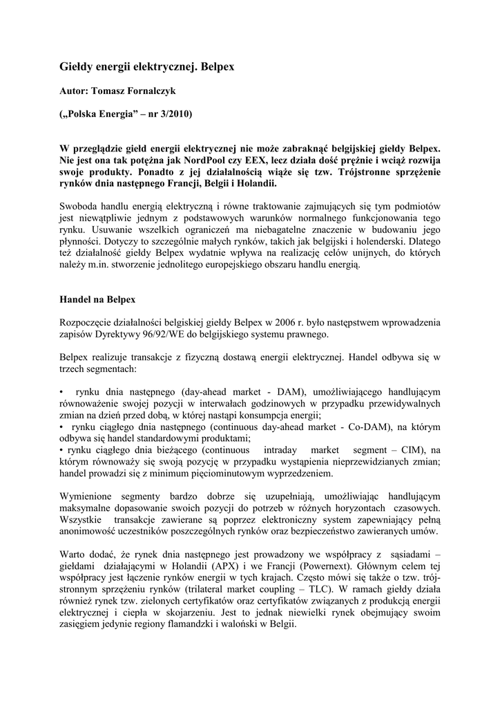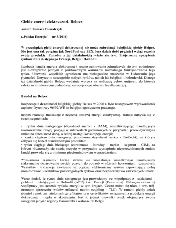 Giełdy energii elektrycznej. Belpex Autor: Tomasz Fornalczyk („Polska Energia” – nr 3/2010) W przeglądzie giełd energii elektrycznej nie może zabraknąć belgijskiej giełdy Belpex. Nie jest ona tak potężna jak NordPool czy EEX, lecz działa dość prężnie i wciąż rozwija swoje produkty. Ponadto z jej działalnością wiąże się tzw. Trójstronne sprzężenie rynków dnia następnego Francji, Belgii i Holandii. Swoboda handlu energią elektryczną i równe traktowanie zajmujących się tym podmiotów jest niewątpliwie jednym z podstawowych warunków normalnego funkcjonowania tego rynku. Usuwanie wszelkich ograniczeń ma niebagatelne znaczenie w budowaniu jego płynności. Dotyczy to szczególnie małych rynków, takich jak belgijski i holenderski. Dlatego też działalność giełdy Belpex wydatnie wpływa na realizację celów unijnych, do których należy m.in. stworzenie jednolitego europejskiego obszaru handlu energią. Handel na Belpex Rozpoczęcie działalności belgiskiej giełdy Belpex w 2006 r. było następstwem wprowadzenia zapisów Dyrektywy 96/92/WE do belgijskiego systemu prawnego. Belpex realizuje transakcje z fizyczną dostawą energii elektrycznej. Handel odbywa się w trzech segmentach: • rynku dnia następnego (day-ahead market - DAM), umożliwiającego handlującym równoważenie swojej pozycji w interwałach godzinowych w przypadku przewidywalnych zmian na dzień przed dobą, w której nastąpi konsumpcja energii; • rynku ciągłego dnia następnego (continuous day-ahead market - Co-DAM), na którym odbywa się handel standardowymi produktami; • rynku ciągłego dnia bieżącego (continuous intraday market segment – CIM), na którym równoważy się swoją pozycję w przypadku wystąpienia nieprzewidzianych zmian; handel prowadzi się z minimum pięciominutowym wyprzedzeniem. Wymienione segmenty bardzo dobrze się uzupełniają, umożliwiając handlującym maksymalne dopasowanie swoich pozycji do potrzeb w różnych horyzontach czasowych. Wszystkie transakcje zawierane są poprzez elektroniczny system zapewniający pełną anonimowość uczestników poszczególnych rynków oraz bezpieczeństwo zawieranych umów. Warto dodać, że rynek dnia następnego jest prowadzony we współpracy z sąsiadami – giełdami działającymi w Holandii (APX) i we Francji (Powernext). Głównym celem tej współpracy jest łączenie rynków energii w tych krajach. Często mówi się także o tzw. trójstronnym sprzężeniu rynków (trilateral market coupling – TLC). W ramach giełdy działa również rynek tzw. zielonych certyfikatów oraz certyfikatów związanych z produkcją energii elektrycznej i ciepła w skojarzeniu. Jest to jednak niewielki rynek obejmujący swoim zasięgiem jedynie regiony flamandzki i waloński w Belgii. Połączenie rynków Mechanizm trójstronnego sprzężenia rynków (TLC) zainicjowany został wraz z powstaniem giełdy Belpex. Jego organizatorami były giełdy energii we Francji, Holandii i Belgii oraz operatorzy systemów przesyłowych tych państw (Elia – Belgia, TenneT – Holandia, RTE – Francja). Podstawowym zadaniem przyjętego rozwiązania jest koordynowanie cen, a także optymalizacja zdolności przesyłowych pomiędzy poszczególnymi systemami. Sprzężenie rynków dotyczy tylko segmentu rynku dnia następnego. Działanie mechanizmu związanego ze sprzężeniem rynków dnia następnego zdeterminowane jest dwoma czynnikami: cenami energii elektrycznej oraz ewentualnymi kosztami związanymi z transgranicznym jej przesyłem pomię dzy systemami. Ceny ustala się wspólnie dla trzech rynków, są więc jednakowe. Ewentualne różnice wynikają z kosztów związanych z transmisją energii przez granice. Pojawiają się one tylko wówczas, gdy transgraniczne możliwości przesyłowe są w pełni wykorzystane. Jeśli połączenia dysponują wolnymi zdolnościami, dodatkowych kosztów nie ma. Jednocześnie zaznaczyć należy, że klienci z państw objętych obszarem wspólnego rynku, zawierając transakcje na rynku dnia następnego, automatycznie dokonują rezerwacji i zakupu zdolności przesyłowych. Biorąc pod uwagę powyższe czynniki, w skrajnych przypadkach mogą wystąpić trzy różne ceny (w każdym z obszarów cenowych) na obszarze objętym wspólnym rynkiem, jednak najczęściej ceny są jednakowe. Przyjęte rozwiązanie poprawia płynność poszczególnych rynków oraz udostępnia wolne moce przesyłowe wszystkim użytkownikom na równych zasadach, bez konieczności prowadzenia dodatkowego postępowania. Mimo sprzężenia wszystkie trzy giełdy mogą funkcjonować niezależnie, praktycznie bez żadnych zmian organizacyjnych. Uczestnicy, właściciele i nadzór Na koniec 2008 r. giełda Belpex mogła pochwalić się przynajmniej 34 bezpośrednimi użytkownikami i trzema firmami brokerskimi, działającymi w imieniu innych konsumentów lub wytwórców energii elektrycznej. Dokładna liczba uczestników nie jest publikowana – nie wszyscy z nich zgadzają się na ujawnianie swoich danych. Jeśli chodzi zaś o strukturę właścicielską giełdy Belpex, nie jest ona tak rozbudowana jak w przypadku giełdy Powernext. Większościowym udziałowcem jest Elia – belgiski operator systemu przesyłowego. Pozostałe udziały podzielili między siebie w równych ilościach: giełdy APX i Powernext oraz operatorzy sieci przesyłowych we Francji i Holandii – RTE oraz TenneT. Kapitał giełdy Belpex szacowany jest na 3 mln euro. Nadzór nad działalnością giełdy sprawują dwie niezależne instytucje: Komisja Regulacji Energii Elektrycznej i Gazu (Commission de Regulation de l’Electricite et du Gaz – CREG) oraz Komisja Bankowości, Finansów i Ubezpieczeń (La Commission Bancaire, Financiere et des Assurances – CBFA). Druga z wymienionych instytucji odpowiedzialna jest za nadzorowanie działalności większości instytucji finansowych w Belgii oraz ochronę konsumentów usług finansowych. CREG z kolei pełni funk