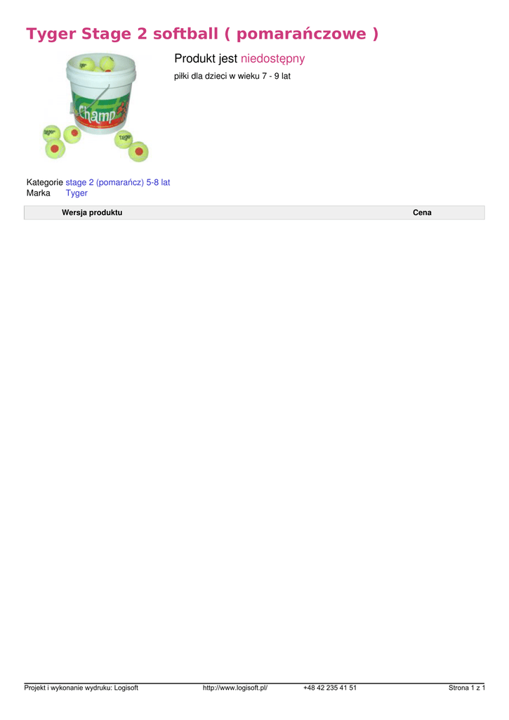 Tyger Stage 2 softball ( pomarańczowe ) Produkt jest niedostępny piłki dla dzieci w wieku 7 - 9 lat Kategorie stage 2 (pomarańcz) 5-8 lat Marka Tyger Wersja produktu Projekt i wykonanie wydruku: Logisoft Powered by TCPDF (www.tcpdf.org) Cena http://www.logisoft.pl/ +48 42 235 41 51 Strona 1 z 1