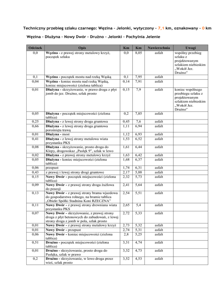 Techniczny przebieg szlaku czarnego: Węzina – Jelonki, wytyczony – 7,1 km, oznakowany – 0 km Węzina – Dłużyna – Nowy Dwór – Drużno – Jelonki – Pochylnia Jelenie Odcinek Opis 0,0 Węzina - z prawej strony metalowy krzyż, początek szlaku 0,1 0,04 0,01 0,05 0,25 0,66 0,01 0,41 0,08 0,02 0,05 0,06 0,43 0,15 0,09 0,13 0,11 0,07 0,01 0,01 0,06 0,51 0,01 0,2 Km 0,0 Km 8,05 Nawierzchnia asfalt Węzina - początek mostu nad rzeką Wąską Węzina - koniec mostu nad rzeką Wąską, koniec miejscowości (zielona tablica) Dłużyna - skrzyżowanie, w prawo droga z płyt jomb do jez. Drużno, szlak prosto 0,1 0,14 7,95 7,91 asfalt asfalt 0,15 7,9 asfalt Dłużyna - początek miejscowości (zielona tablica) Dłużyna - z lewej strony droga gruntowa Dłużyna - z lewej strony droga gruntowa porośnięta trawą Dłużyna - most Dłużyna - z lewej strony metalowa wiata przystanku PKS Dłużyna - skrzyżowanie, prosto droga do Klepy, drogowskaz „Pasłęk 9”, szlak w lewo Dłużyna - z prawej strony metalowy krzyż Dłużyna - koniec miejscowości (zielona tablica) przepust z prawej i lewej strony drogi gruntowe Nowy Dwór - początek miejscowości (zielona tablica) Nowy Dwór - z prawej strony droga żużlowa do posesji Nowy Dwór - z prawej strony brama wjazdowa do gospodarstwa rolnego, na bramie tablica „Obiekt Spółki Stadnina Koni RZECZNA” Nowy Dwór - z prawej strony drewniana wiata przystanku PKS Nowy Dwór - skrzyżowanie, z prawej strony droga z płyt betonowych do zabudowań, z lewej strony droga z jomb w pola, szlak prosto Nowy Dwór - z prawej strony metalowy krzyż Nowy Dwór - przepust Nowy Dwór - koniec miejscowości (zielona tablica) Drużno - początek miejscowości (zielona tablica) Drużno - skrzyżowanie, prosto droga do Pasłęka, szlak w prawo Drużno - skrzyżowanie, w lewo droga przez wieś, szlak prosto 0,2 7,85 asfalt 0,45 1,11 7,6 6,94 asfalt asfalt 1,12 1,53 6,93 6,52 asfalt asfalt 1,61 6,44 asfalt 1,63 1,68 6,42 6,37 asfalt asfalt 1,74 2,17 2,32 6,31 5,88 5,73 asfalt asfalt asfalt 2,41 5,64 asfalt 2,54 5,51 asfalt 2,65 5,4 asfalt 2,72 5,33 asfalt 2,73 2,74 2,8 5,32 5,31 5,25 asfalt asfalt asfalt 3,31 4,74 asfalt 3,32 4,73 asfalt 3,52 4,53 asfalt Uwagi wspólny przebieg szlaku z projektowanym szlakiem niebieskim „Wokół Jez. Drużno” koniec wspólnego przebiegu szlaku z projektowanym szlakiem niebieskim „Wokół Jez. Drużno” Odcinek Opis 0,08 Drużno - z lewej strony ostatni budynek wsi (obora) 0,36 most nad rzeką Miła 0,2 początek niewielkiego zadrzewienia 0,19 koniec zadrzewienia 0,59 skrzyżowanie, w prawo droga do Karczowizny, szlak w lewo na most nad Kanałem Elbląskim 0,01 początek mostu nad Kanałem Elbląskim 0,03 koniec mostu nad Kanałem Elbląskim 0,3 skrzyżowanie, w prawo droga do zabudowań Rodowa, szlak prosto 0,09 zmiana nawierzchni drogi 0,28 zmiana nawierzchni drogi 0,11 z lewej strony początek terenu zalesionego 0,2 z lewej strony koniec terenu zalesionego 0,02 Jelonki - z prawej strony dom nr 87 0,47 Jelonki - z lewej strony droga gruntowa 0,43 Jelonki - skrzyżowanie, w prawo droga do Rychlik, w lewo do Pasłęka, szlak w lewo 0,21 0,04 0,05 0,14 0,07 0,01 0,16 0,05 0,03 0,17 0,2 0,04 Jelonki - z lewej strony droga gruntowa porośnięta trawą Jelonki - z prawej strony dawny Club Rancho Jelonki - z prawej strony droga z płyt betonowych do ujęcia wody Jelonki - z lewej strony droga gruntowa do zabudowań, początek zabudowy Jelonki - z prawej strony drewniana wiata przystanku PKS Jelonki N/Ż, tablica „Jelonki pole namiotowe” Jelonki - z prawej strony droga gruntowa Jelonki - początek mostu nad Kanałem Elbląskim Jelonki - koniec mostu nad Kanałem Elbląskim, z lewej strony droga z płyt betonowych do Pochylni Całuny Jelonki - most nad rzeką Klepina Jelonki - skrzyżowanie, prosto do Pasłęka, szlak w prawo Jelonki - most nad rzeką Klepina Jelonki - parking nad Kanałem Elbląskim, koniec szlaku Zestawienie rodzajów nawierzchni droga asfaltowa droga żużlowa droga szutrowa droga kamienista – – – – 6,15 km 1,23 km 0,39 km 0,28 km Opracowanie Krzysztof Mieczkowski Km 3,6 Km 4,45 Nawierzchnia asfalt 3,96 4,16 4,35 4,94 4,09 3,89 3,7 3,11 asfalt asfalt asfalt asfalt 4,95 4,98 5,28 3,1 3,07 2,77 asfalt asfalt droga szutrowa 5,37 5,65 5,76 5,96 5,98 6,45 6,88 2,68 2,4 2,29 2,09 2,07 1,6 1,17 7,09 0,96 7,13 7,18 0,92 0,87 asfalt asfalt 7,32 0,73 asfalt 7,39 0,66 asfalt 7,4 7,56 0,65 0,49 asfalt asfalt 7,61 0,44 asfalt 7,64 7,81 0,41 0,24 asfalt asfalt 8,01 8,05 0,04 0,0 asfalt asfalt Uwagi droga szutrowa droga kamienista droga żużlowa droga żużlowa droga żużlowa droga żużlowa droga żużlowa wspólny przebieg szlaku ze szlakiem zielonym Elbląg Iława asfalt koniec wspólnego przebiegu szlaku ze szlakiem zielonym Elbląg - Iława
