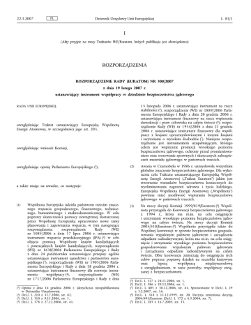 22.3.2007 PL Dziennik Urzędowy Unii Europejskiej L 81/1 I (Akty przyjęte na mocy Traktatów WE/Euratom, których publikacja jest obowiązkowa) ROZPORZĄDZENIA ROZPORZĄDZENIE RADY (EURATOM) NR 300/2007 z dnia 19 lutego 2007 r. ustanawiający instrument współpracy w dziedzinie bezpieczeństwa jądrowego 15 listopada 2006 r. ustanawiające instrument na rzecz stabilności (5), rozporządzenie (WE) nr 1889/2006 Parlamentu Europejskiego i Rady z dnia 20 grudnia 2006 r. ustanawiające instrument finansowy na rzecz wspierania demokracji i praw człowieka na całym świecie (6), rozporządzenie Rady (WE) nr 1934/2006 z dnia 21 grudnia 2006 r. ustanawiające instrument finansowy dla współpracy z krajami uprzemysłowionymi i innymi krajami i terytoriami o wysokim dochodzie (7). Niniejsze rozporządzenie jest instrumentem uzupełniającym, którego celem jest wspieranie promocji wysokiego poziomu bezpieczeństwa jądrowego, ochrony przed promieniowaniem oraz stosowanie sprawnych i skutecznych zabezpieczeń materiału jądrowego w państwach trzecich. RADA UNII EUROPEJSKIEJ, uwzględniając Traktat ustanawiający Europejską Wspólnotę Energii Atomowej, w szczególności jego art. 203, uwzględniając wniosek Komisji, uwzględniając opinię Parlamentu Europejskiego (1), (2) Awaria w Czarnobylu w 1986 r. uzmysłowiła wszystkim globalne znaczenie bezpieczeństwa jądrowego. Dla wykonania celu Traktatu ustanawiającego Europejską Wspólnotę Energii Atomowej („Traktat Euratom”) jakim jest stworzenie warunków bezpieczeństwa koniecznych do wyeliminowania zagrożeń zdrowia i życia ludzkiego, Europejska Wspólnota Energii Atomowej („Wspólnota”) powinna mieć możliwość wspierania bezpieczeństwa jądrowego w państwach trzecich. (3) Na mocy decyzji Komisji 1999/819/Euratom (8) Wspólnota przystąpiła do Konwencji bezpieczeństwa jądrowego z 1994 r., która ma m.in. na celu osiągnięcie i utrzymanie wysokiego poziomu bezpieczeństwa jądrowego na całym świecie. Na mocy decyzji Komisji 2005/510/Euratom (9) Wspólnota przystąpiła także do Wspólnej konwencji w sprawie bezpieczeństwa gospodarowania wypalonym paliwem jądrowym i zarządzania odpadami radioaktywnymi, która ma m.in. na celu osiągnięcie i utrzymanie wysokiego poziomu bezpieczeństwa gospodarowania wypalonym paliwem jądrowym i zarządzania odpadami radioaktywnymi na całym świecie. Obie konwencje zmierzają do osiągnięcia tych celów poprzez poprawę działań na szczeblu krajowym oraz lepszą współpracę międzynarodową z uwzględnieniem, w razie potrzeby, współpracy związanej z bezpieczeństwem. a także mając na uwadze, co następuje: (1) Wspólnota Europejska udziela państwom trzecim znacznego wsparcia gospodarczego, finansowego, technicznego, humanitarnego i makroekonomicznego. W celu poprawy skuteczności pomocy zewnętrznej dostarczanej przez Wspólnotę Europejską opracowano nowe ramy planowania i zapewniania wsparcia, w tym następujące rozporządzenia: rozporządzenie Rady (WE) nr 1085/2006 z dnia 17 lipca 2006 r. ustanawiające instrument wsparcia przedakcesyjnego (IPA) (2) w celu objęcia pomocą Wspólnoty krajów kandydujących i potencjalnych krajów kandydujących, rozporządzenie (WE) nr 1638/2006 Parlamentu Europejskiego i Rady z dnia 24 października ustanawiające przepisy ogólne ustanawiające instrument sąsiedztwa i partnerstwa europejskiego (3), rozporządzenie (WE) nr 1905/2006 Parlamentu Europejskiego i Rady z dnia 18 grudnia 2006 r. ustanawiające instrument finansowy dla rozwoju instrurozporządzenie (WE) mentu współpracy (4), nr 1717/2006 Parlamentu Europejskiego i Rady z dnia (1) Opinia z dnia 14 grudnia 2006 r. (dotychczas nieopublikowana w Dzienniku Urzędowym). (2) Dz.U. L 210 z 31.7.2006, str. 82. (3) Dz.U. L 310 z 9.11.2006, str. 1. (4) Dz.U. L 378 z 27.12.2006, str. 41. (5) Dz.U. L 327 z 24.11.2006, str. 1. (6) Dz.U. L 386 z 29.12.2006, str. 1. (7) Dz.U. L 405 z 30.12.2006, str. 41. Sprostowanie w Dz.U. L 29 z 3.2.2007, str. 16. (8) Dz.U. L 318 z 11.12.1999, str. 20. Decyzja zmieniona decyzją 2004/491/Euratom (Dz.U. L 172 z 6.5.2004, str. 7). (9) Dz.U. L 185 z 16.7.2005, str. 33. L 81/2 PL Dziennik Urzędowy Unii Europejskiej (4) Zgodnie z rozdziałem 10 Traktatu Euratom Wspólnota prowadzi już ścisłą współpracę z Międzynarodową Agencją Energii Atomowej (IAEA), zarówno w odniesieniu do zabezpieczeń jądrowych (dla realizacji celów wynikających z rozdziału 7 tytułu drugiego Traktatu Euratom), jak i w związku z bezpieczeństwem jądrowym. (5) Istnieje szczególna potrzeba ponawiania przez Wspólnotę wysiłków we wspieraniu stosowania skutecznych zabezpieczeń materiałów jądrowych w państwach trzecich, na podstawie własnych działań Wspólnoty w dziedzinie zabezpieczeń w obrębie Unii Europejskiej. (6) Istnieje szczególna potrzeba działania na podstawie doświadczeń nabytych w ramach programów Tacis i Phare, włączając w to prace odpowiednich grup eksperckich, zwłaszcza w kwestii odpowiedzialności cywilno-prawnej w zakresie zagadnień jądrowych. (7) Zachodzi potrzeba finansowania środków towarzyszących wspomagających realizację celów niniejszego rozporządzenia, w tym szkoleń, badań i pomocy w realizacji międzynarodowych konwencji i traktatów. Pożądane jest koordynowanie działań prowadzonych na mocy takich konwencji i traktatów z działaniami wspólnotowymi. (8) Oprócz międzynarodowych konwencji i traktatów niektóre państwa członkowskie zawarły umowy dwustronne dotyczące zapewniania pomocy technicznej. (9) W swej rezolucji z 18 czerwca 1992 r. w sprawie technicznych problemów związanych z bezpieczeństwem jądrowym Rada „podkreśla szczególne znaczenie, jakie przypisuje bezpieczeństwu jądrowemu w Europie, i w związku z tym zwraca się do państw członkowskich i Komisji o przyjęcie podstawowego i priorytetowego celu współpracy Wspólnoty w dziedzinie energii jądrowej, w szczególności z inny