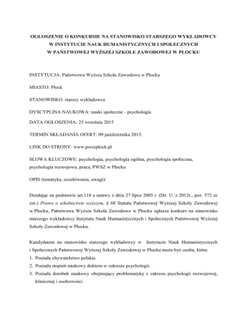 OGŁOSZENIE O KONKURSIE NA STANOWISKO STARSZEGO WYKŁADOWCY W INSTYTUCIE NAUK HUMANISTYCZNYCH I SPOŁECZNYCH W PAŃSTWOWEJ WYŻSZEJ SZKOLE ZAWODOWEJ W PŁOCKU INSTYTUCJA: Państwowa Wyższa Szkoła Zawodowa w Płocku MIASTO: Płock STANOWISKO: starszy wykładowca DYSCYPLINA NAUKOWA: nauki społeczne - psychologia DATA OGŁOSZENIA: 25 września 2015 TERMIN SKŁADANIA OFERT: 09 października 2015. LINK DO STRONY: www.pwszplock.pl SŁOWA KLUCZOWE: psychologia, psychologia ogólna, psychologia społeczna, psychologia rozwojowa, praca, PWSZ w Płocku OPIS (tematyka, oczekiwania, uwagi): Działając na podstawie art.118 a ustawy z dnia 27 lipca 2005 r. (Dz. U. z 2012r., poz. 572 ze zm.) Prawo o szkolnictwie wyższym, § 68 Statutu Państwowej Wyższej Szkoły Zawodowej w Płocku, Państwowa Wyższa Szkoła Zawodowa w Płocku ogłasza konkurs na stanowisko starszego wykładowcy Instytutu Nauk Humanistycznych i Społecznych Państwowej Wyższej Szkoły Zawodowej w Płocku. Kandydatem na stanowisko starszego wykładowcy w Instytucie Nauk Humanistycznych i Społecznych Państwowej Wyższej Szkoły Zawodowej w Płocku może być osoba, która: 1. Posiada obywatelstwo polskie. 2. Posiada stopień naukowy doktora w zakresie psychologii. 3. Posiada dorobek naukowy obejmujący problematykę z zakresu psychologii rozwojowej, klinicznej i osobowości. 4. Ma doświadczenie w pracy ze studentami w zakresie prowadzenia zajęć dydaktycznych na Uczelni – minimum 3 lata. 5. Ma doświadczenie w zakresie koordynowania praktykami studenckimi. 6. Posiada dyplom nauczyciela mianowanego. 7. Posiada minimum 8 lat stażu pracy na stanowisku psychologa. 8. Ma doświadczenie w promowaniu prac podyplomowych. 9. Ma doświadczenie w konstruowaniu programów kształcenia na kierunku pedagogika. 10. Nie była skazana prawomocnym wyrokiem za umyślne przestępstwo lub przestępstwo skarbowe. 11. Korzysta z pełni praw publicznych. Zgłoszenie kandydata winno zawierać: 1. Pisemne zgłoszenie przystąpienia do konkursu na stanowisko starszego wykładowcy Instytutu Nauk Humanistycznych i Społecznych w Państwowej Wyższej Szkole Zawodowej w Płocku w zakresie dyscypliny naukowej: psychologia. 2. Informację o dotychczasowym przebiegu pracy zawodowej. 3. Wykaz publikacji kandydata z podaniem wydawnictwa, roku publikacji i ilości stron. 4. Poświadczone za zgodność z oryginałem kopie dokumentów potwierdzających: a) Przebieg pracy zawodowej. b) Posiadany stopień naukowy. 5. Oświadczenie informujące o spełnianiu wymagań określonych w art. 109 ust. 1 ustawy Prawo o szkolnictwie wyższym. 6. Aktualne zaświadczenie lekarskie o braku przeciwwskazań zdrowotnych do pracy na ww. stanowisku wydane przez lekarza przeprowadzającego badania profilaktyczne wystawione po dniu ukazania się niniejszego ogłoszenia. 7. Poświadczoną za zgodność z oryginałem kopię dowodu osobistego lub innego dokumentu potwierdzającego tożsamość. 8. Oświadczenie o wyrażeniu zgody na przetwarzanie danych osobowych w ramach konkursu na stanowisko starszego wykładowcy w Instytucie Nauk Humanistycznych i Społecznych PWSZ w Płocku, zgodnie z ustawą z dn. 29 sierpnia 1997 r. o ochronie danych osobowych (Dz. U. Nr 133, poz. 883 z późn. zm.). Dokumenty należy składać w zamkniętej kopercie z dopiskiem „Konkurs na stanowisko starszego wykładowcy w zakresie dyscypliny naukowej: psychologia w Instytucie Nauk Humanistycznych i Społecznych Państwowej Wyższej Szkoły Zawodowej w Płocku”, na adres: Sekretariat Kanclerza i Kwestora Państwowej Wyższej Szkoły Zawodowej w Płocku, 09-402 Płock, Plac Dąbrowskiego 2 lub składać osobiście na adres: Sekretariat Kanclerza i Kwestora Państwowej Wyższej Szkoły Zawodowej w Płocku, 09-402 Płock, Plac Dąbrowskiego 2, pokój 202 II piętro, w godz. 7:30-15:30 Termin składania zgłoszeń do konkursu upływa z dniem 09 października 2015 r.