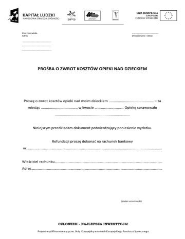 Imię i nazwisko Adres ……..……………………………….. (miejscowośd i data) .…………………………………………. …………………………………………… ……………………………………………. PROŚBA O ZWROT KOSZTÓW OPIEKI NAD DZIECKIEM Proszę o zwrot kosztów opieki nad moim dzieckiem ............................................ – za miesiąc ..................................., w kwocie …………………………. Opiekę sprawowało .......................................................................... Niniejszym przedkładam dokument potwierdzający poniesienie wydatku. Refundacji proszę dokonad na rachunek bankowy nr………………………………………………………………………………................................................... Właściciel rachunku…………………………………………………………………………………………………….. Adres…………………………………………………………………………………………………………………………… (podpis uczestniczki) CZŁOWIEK - NAJLEPSZA INWESTYCJA! Projekt współfinansowany przez Unię Europejską w ramach Europejskiego Funduszu Społecznego