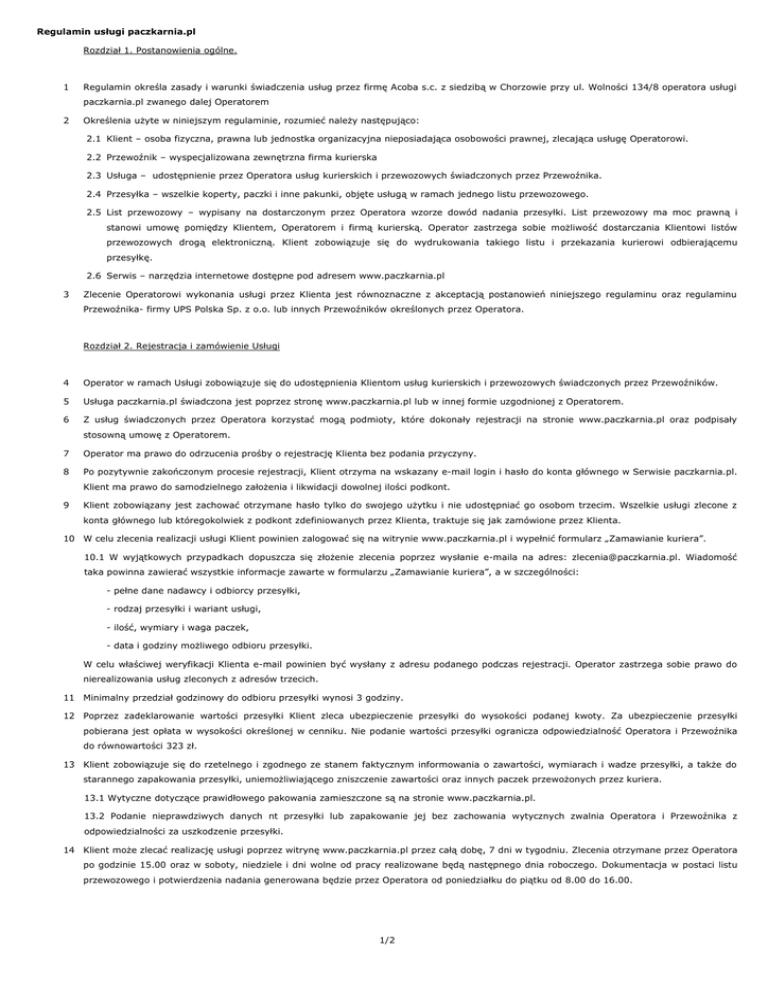 Regulamin usługi paczkarnia.pl Rozdział 1