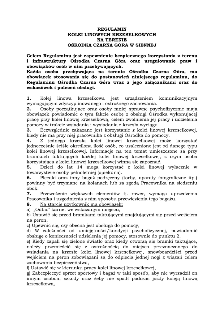 REGULAMIN KOLEI LINOWYCH KRZESEŁKOWYCH NA TERENIE OŚRODKA CZARNA GÓRA W SIENNEJ Celem Regulaminu jest zapewnienie bezpiecznego korzystania z terenu i infrastruktury Ośrodka Czarna Góra oraz uregulowanie praw i obowiązków osób w nim przebywających. Każda osoba przebywająca na terenie Ośrodka Czarna Góra, ma obowiązek stosowania się do postanowień niniejszego regulaminu, do Regulaminu Ośrodka Czarna Góra wraz z jego załącznikami oraz do wskazówek i poleceń obsługi. 1. Kolej linowa krzesełkowa jest urządzeniem komunikacyjnym wymagającym zdyscyplinowanego i ostrożnego zachowania. 2. Osoby początkujące oraz osoby mniej sprawne psychofizycznie mają obowiązek powiadomić o tym fakcie osobę z obsługi Ośrodka wykonującej pracę przy kolei linowej krzesełkową, celem zwolnienia jej pracy i udzielenia pomocy w trakcie wsiadania i wysiadania z krzesła wyciągu. 3. Bezwzględnie zakazane jest korzystanie z kolei linowej krzesełkowej, kiedy nie ma przy niej pracownika z obsługi Ośrodka do pomocy. 4. Z jednego krzesła kolei linowej krzesełkowej może korzystać jednocześnie ściśle określona ilość osób, co uzależnione jest od danego typu kolei linowej krzesełkowej. Informacje na ten temat umieszczone są przy bramkach taktujących każdej kolei linowej krzesełkowej, z czym osoba korzystająca z kolei linowej krzesełkowej winna się zapoznać. 5. Dzieci do lat 14 mogą korzystać z kolei linowej wyłącznie w towarzystwie osoby pełnoletniej (opiekuna). 6. Plecaki oraz inny bagaż podręczny (torby, aparaty fotograficzne itp.) powinny być trzymane na kolanach lub za zgodą Pracownika na siedzeniu obok. 7. Przewożenie większych elementów tj. rower, wymaga uprzedzenia Pracownika i uzgodnienia z nim sposobu przewiezienia tego bagażu. 8. Na starcie użytkownik ma obowiązek: a) „Odbić” karnet we wskazanym miejscu, b) Ustawić się przed bramkami taktującymi znajdującymi się przed wejściem na peron, c) Upewnić się, czy obecna jest obsługa do pomocy, d) W zależności od umiejętności/kondycji psychofizycznej, powiadomić obsługę o konieczności udzielenia jej pomocy, stosownie do punktu 2, e) Kiedy zapali się zielone światło oraz kiedy otworzą się bramki taktujące, należy przemieścić się z ostrożnością do miejsca przeznaczonego do wsiadania na krzesło kolei linowej krzesełkowej, snowboardziści przed wejściem na peron zobowiązani są do odpięcia jednej nogi z wiązań celem zachowania bezpieczeństwa, f) Ustawić się w kierunku pracy kolei linowej krzesełkowej, g) Zabezpieczyć sprzęt sportowy i bagaż w taki sposób, aby nie wyrządził on innym osobom szkody oraz żeby nie spadł podczas jazdy koleją linową krzesełkową, h) Spocząć na nadjeżdżającym krześle kolei linowej krzesełkowej, zgodnie z przeznaczonymi do tego miejscami, i) Po wyjeździe z peronu należy drążek zabezpieczający niezwłocznie opuścić oraz oprzeć nogi na podnóżku, j) Upewnić się, czy drążek zabezpieczający jest prawidłowo umieszczony (powinien opierać się na krześle kolei linowej krzesełkowej), 9. Podczas jazdy koleją linową krzesełkową należy zachować należytą ostrożność i postępować w sposób niezagrażający życiu, zdrowiu oraz bezpieczeństwu własnemu i innych osób. Bezwzględnie zakazane jest: a) Kołysanie krzesłem kolei linowej krzesełkowej, b) Podnoszenie drążka zabezpieczającego, c) Wyrzucanie śmieci oraz innych przedmiotów, tj. sprzęt sportowy, plecaki, bagaż, papierosy, d) Stawanie na krześle kolei linowej krzesełkowej, e) Wychylanie się oraz chwytanie gałęzi drzew, f) Ewakuowanie się we własnym zakresie w przypadku zatrzymania się kolei linowej krzesełkowej, 10. Przy wjeździe do peronu kolei linowej krzesełkowej należy: a) Przygotować siebie, sprzęt sportowy oraz bagaż do wysiadania, b) Unieść drążek zabezpieczający, c) Oczekiwać na dojazd do miejsca oznaczonego do wysiadania, gdzie należy opuścić krzesło kolei linowej krzesełkowej oraz kierować się zgodnie ze znakami lub poleceniem obsługi Ośrodka do wyjścia, d) Użytkownicy z wpiętymi nartami lub innym sprzętem sportowym, dojeżdżają po opuszczeniu kanapy do końca peronu górnego tak, aby następni nadjeżdżający użytkownicy mogli bezpiecznie opuścić krzesło kolei linowej krzesełkowej, e) Wyładowaniem bagażu znajdującego się na osobnej kanapie zajmuje się pracownik Ośrodka Czarna Góra, 11. Użytkownik ma obowiązek powiadomić obsługę Ośrodka o dostrzeżonych wypadkach na stokach, przeszkodach w prawidłowym funkcjonowaniu wyciągów, kolei linowych krzesełkowych, awariach itp. 12. Na terenie całego ośrodka obowiązuje Ustawa o bezpieczeństwie i ratownictwie w górach i na zorganizowanych terenach narciarskich z dnia 18 sierpnia 2011 r. [Dz.U. 2011, nr 208, poz. 1241]. 13. Niniejszy Regulamin wchodzi w życie z dniem ogłoszenia. Regulamin ogłasza się przez wywieszenie w ogólnie dostępnych miejscach na terenie Ośrodka oraz na stronie internetowej Czarna Góra S.A.: www.czarnagora.pl