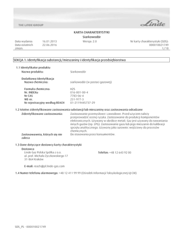KARTA CHARAKTERYSTYKI Siarkowodór Data wydania: Data ostatnich zmian: 16.01.2013 22.06.2016 Wersja: 2.0 Nr karty charakterystyki (SDS): 000010021749 1/18 SEKCJA 1: Identyfikacja substancji/mieszaniny i identyfikacja przedsiębiorstwa 1.1 Identyfikator produktu Nazwa produktu: Siarkowodór Dodatkowa Identyfikacja Nazwa chemiczna: siarkowodór (w postaci gazowej) Formuła chemiczna: Nr. INDEXu Nr CAS WE-nr. Nr rejestracyjny według REACH H2S 016-001-00-4 7783-06-4 231-977-3 01-2119445737-29 1.2 Istotne zidentyfikowane zastosowania substancji lub mieszaniny oraz zastosowania odradzane Zidentyfikowane zastosowania: Zastosowawnia, których się nie zaleca Zastosowanie przemysłowe i zawodowe. Przed użyciem należy przeprowadzić ocenę ryzyka. Zastosowanie do produkcji komponentów elektronicznych. Używany w obróbce metali. Gaz jest używany do nawaniania innych gazów (np. LPG). Zastosowanie gazu lub jego mieszanin do kalibracji sprzętu analitycznego. Używany jako surowiec wejściowy do procesów chemicznych. Do stosowania przez konsumentów. 1.3 Dane dotyczące dostawcy karty charakterystyki Dostawca Linde Gaz Polska Spółka z o.o. ul. prof. Michała Życzkowskiego 17 31-864 Kraków Telefon: +48 12 643 92 00 E-mail: [email protected] 1.4 Numer telefonu alarmowego: +48 12 411 99 99 (Ośrodek Informacji Toksykologicznej UJ CM) SDS_PL - 000010021749 KARTA CHARAKTERYSTYKI Siarkowodór Data wydania: Data ostatnich zmian: 16.01.2013 22.06.2016 Wersja: 2.0 Nr karty charakterystyki (SDS): 000010021749 2/18 SEKCJA 2: Identyfikacja zagrożeń 2.1 Klasyfikacja substancji lub mieszaniny Klasyfikacja zgodnie z Dyrektywą 67/548/EEC lub 1999/45/EC, z późniejszymi zmianami. F+; R12 T+; R26 N; R50 Pełny tekst wszystkich zwrotów R podano w punkcie 16. Klasyfikacja zgodnie z Rozporządzeniem (WE) Nr 1272/2008, z późniejszymi zmianami. Zagrożenia Fizyczne Gaz łatwopalny Kategoria 1 H220: Skrajnie łatwopalny gaz. Gazy pod ciśnieniem Gaz skroplony H280: Zawiera gaz pod ciśnieniem; ogrzanie grozi wybuchem. Kategoria 2 H330: Wdychanie grozi śmiercią. Kategoria 3 H335: Może powodować podrażnienie dróg oddechowych. Kategoria 1 H400: Działa bardzo toksycznie na organizmy wodne. Zagrożenia dla Zdrowia Toksyczność ostra (Wdychanie - gaz) Toksičnost za specifični ciljni organ Enkratna izpostavljenost Zagrożenia dla Środowiska Ostre zagrożenie dla środowiska wodnego 2.2 Elementy Oznakowania Zawiera: siarkowodór (w postaci gazowej) Hasło Ostrzegawcze: Niebezpieczeństwo Zwroty wskazujące rodzaj zagrożenia: H220: Skrajnie łatwopalny gaz. H280: Zawiera gaz pod ciśnieniem; ogrzanie grozi wybuchem. H330: Wdychanie grozi śmiercią. H335: Może powodować podrażnienie dróg oddechowych. H400: Działa bardzo toksycznie na organizmy wodne. SDS_PL - 000010021749 KARTA CHARAKTERYSTYKI Siarkowodór Data wydania: Data ostatnich zmian: 16.01.2013 22.06.2016 Wersja: 2.0 Nr karty charakterystyki (SDS): 000010021749 3/18 Ostrzeżenie Zapobieganie: P210: Przechowywać z dala od źródeł ciepła, gorących powierzchni, źródeł iskrzenia, otwartego ognia i innych źródeł zapłonu. Nie palić. P260: Nie wdychać gazu/par P273: Unikać uwolnienia do środowiska. Reagowanie: P304+P340+P315: W PRZYPADKU DOSTANIA SIĘ DO DRÓG ODDECHOWYCH: wyprowadzić lub wynieść poszkodowanego na świeże powietrze i zapewnić mu warunki do swobodnego oddychania. Natychmiast zasięgnąć porady/zgłosić się pod opiekę lekarza. P377: W przypadku płonięcia wyciekającego gazu: Nie gasić, jeżeli nie można bezpiecznie zahamować wycieku. P381: Wyeliminować wszystkie źródła zapłonu, jeżeli jest to bezpieczne. Magazynowanie: P403: Przechowywać w dobrze wentylowanym miejscu. P405: Przechowywać pod zamknięciem. Usunięcie odpadów: Żadnych. 2.3 Inne zagrożenia: Kontakt z parującą cieczą może powodować odmrożenie albo zamarznięcie skóry. SEKCJA 3: Skład/informacja o składnikach 3.1 Substancje Nazwa chemiczna Nr. INDEXu: Nr CAS: WE-nr.: Nr rejestracyjny według REACH: Czystość: Nazwa handlowa: siarkowodór (w postaci gazowej) 016-001-00-4 7783-06-4 231-977-3 01-2119445737-29 100% Czystość substancji w niniejszej sekcji została zastosowana tylko do celów klasyfikacyjnych i nie przedstawia rzeczywistej czystości substancji w stanie dostarczanym, dla której należy zapoznać się z inną dokumentacją. - SEKCJA 4: Środki pierwszej pomocy Uwagi ogólne: Zabezpieczając się izolującym aparatem oddechowym przenieść ofiarę do nieskażonego obszaru. Utrzymywać ofiarę w cieple i spokoju. Wezwać lekarza. W przypadku zaniku oddechu zastosować sztuczne oddychanie. 4.1 Opis środków pierwszej pomocy Wdychanie: SDS_PL - 000010021749 Zabezpieczając się izolującym aparatem oddechowym przenieść ofiarę do nieskażonego obszaru. Utrzymywać ofiarę w cieple i spokoju. Wezwać lekarza. W przypadku zaniku oddechu zastosować sztuczne oddychanie. KARTA CHARAKTERYSTYKI Siarkowodór Data wydania: Data ostatnich zmian: 16.01.2013 22.06.2016 Wersja: 2.0 Nr karty charakterystyki (SDS): 000010021749 4/18 Kontakt z oczami: Niezwłocznie przemyć oko wodą. Wyjąć soczewki kontaktowe, jeżeli są i można je łatwo usunąć. Nadal płukać. Płukać dokładnie dużą ilością wody przez 15 minut. Zasięgnąć niezwłocznie porady lekarskiej. W przypadku braku natychmiastowej pomocy lekarskiej, płukać przez dodatkowe 15 minut. Kontakt ze Skórą: Kontakt z parującą cieczą może powodować odmrożenie albo zamarznięcie skóry. Spożycie: Spożycie nie jest uważane za potencjalną drogę narażenia. 4.2 Najważniejsze ostre i opóźnione objawy oraz skutki narażenia: Substancja może powodować zgon przy kontakcie przez wdychanie. Kontakt ze skroplonym gazem może spowodować urazy (odmrożenie) ze względu na szybkie chłodzenie w wyniku parowania. 4.3 Wskazania dotyczące wszelkiej natychmiastowej pomocy lekarskiej i szczególnego postępowania z poszkodowanym Zagrożenia: Substancja moż