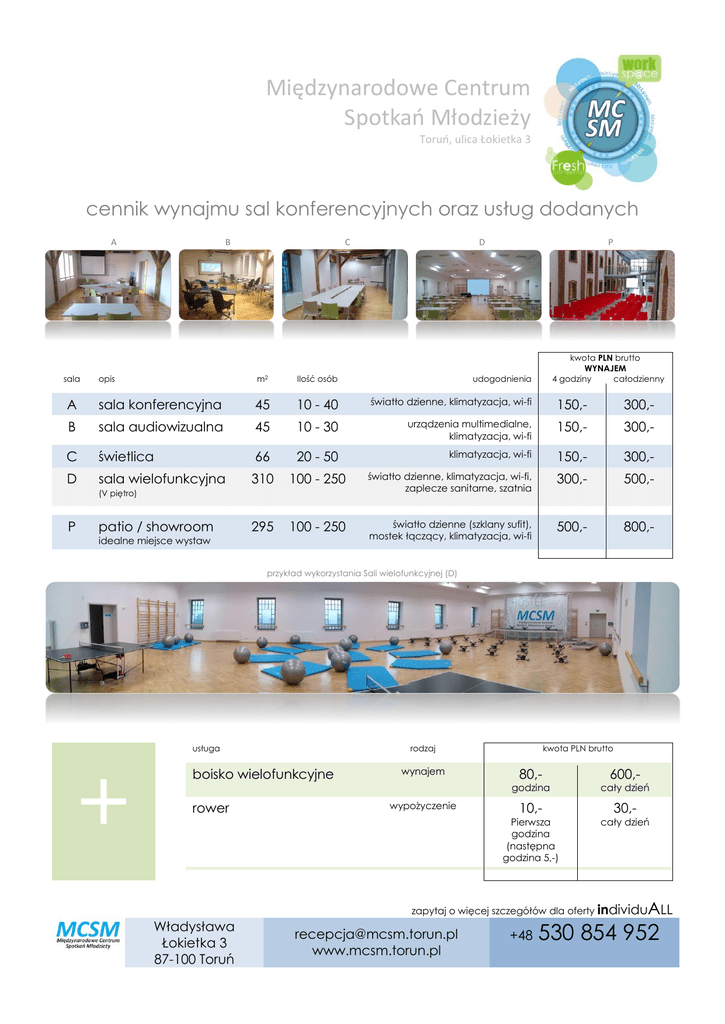 Międzynarodowe Centrum Spotkań Młodzieży Toruń, ulica Łokietka 3 cennik wynajmu sal konferencyjnych oraz usług dodanych A sala A B C D P kwota PLN brutto WYNAJEM 4 godziny całodzienny opis m2 Ilość osób udogodnienia sala konferencyjna 45 10 - 40 światło dzienne, klimatyzacja, wi-fi 150,- 300,- 150,- 300,- B sala audiowizualna 45 10 - 30 urządzenia multimedialne, klimatyzacja, wi-fi C świetlica 66 20 - 50 klimatyzacja, wi-fi 150,- 300,- D sala wielofunkcyjna 310 100 - 250 światło dzienne, klimatyzacja, wi-fi, zaplecze sanitarne, szatnia 300,- 500,- 295 100 - 250 światło dzienne (szklany sufit), mostek łączący, klimatyzacja, wi-fi 500,- 800,- (V piętro) P patio / showroom idealne miejsce wystaw przykład wykorzystania Sali wielofunkcyjnej (D) + usługa rodzaj boisko wielofunkcyjne rower wynajem wypożyczenie kwota PLN brutto 80,- 600,- godzina cały dzień 10,- 30,- Pierwsza godzina (następna godzina 5,-) cały dzień ALL zapytaj o więcej szczegółów dla oferty individu Władysława Łokietka 3 87-100 Toruń [email protected] www.mcsm.torun.pl +48 530 854 952