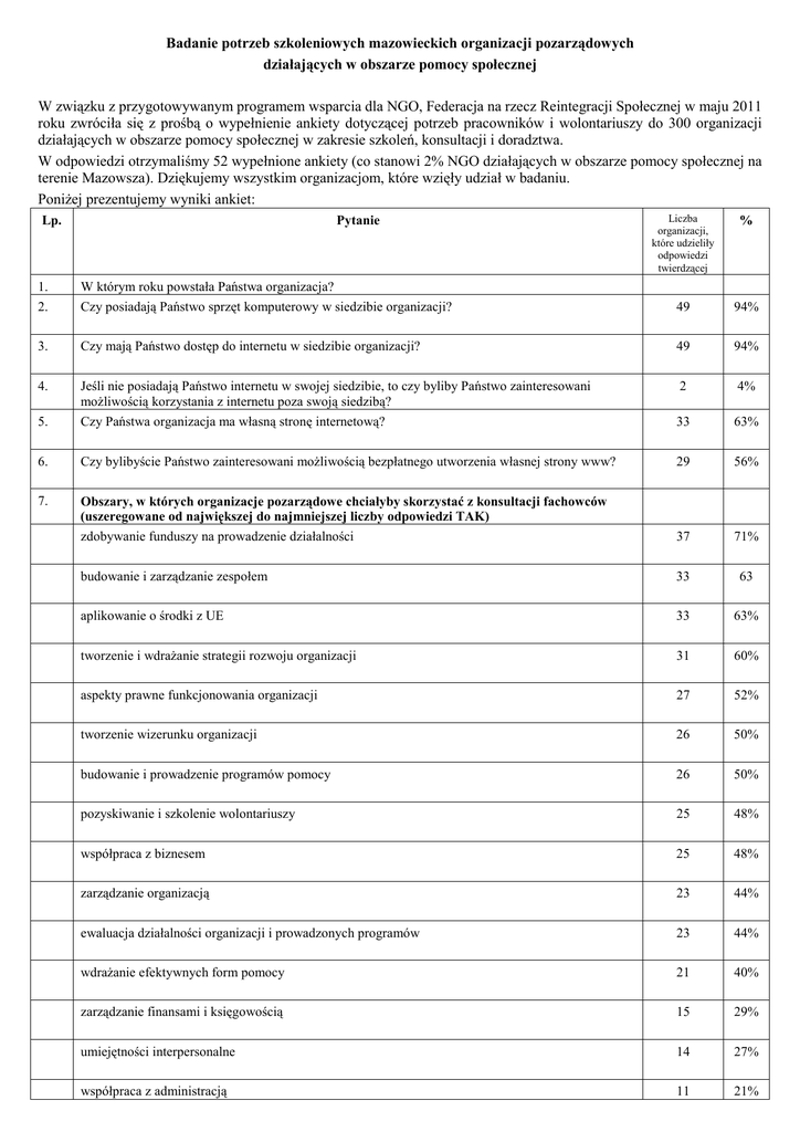 Badanie potrzeb szkoleniowych mazowieckich organizacji pozarządowych działających w obszarze pomocy społecznej W związku z przygotowywanym programem wsparcia dla NGO, Federacja na rzecz Reintegracji Społecznej w maju 2011 roku zwróciła się z prośbą o wypełnienie ankiety dotyczącej potrzeb pracowników i wolontariuszy do 300 organizacji działających w obszarze pomocy społecznej w zakresie szkoleń, konsultacji i doradztwa. W odpowiedzi otrzymaliśmy 52 wypełnione ankiety (co stanowi 2% NGO działających w obszarze pomocy społecznej na terenie Mazowsza). Dziękujemy wszystkim organizacjom, które wzięły udział w badaniu. PoniŜej prezentujemy wyniki ankiet: Lp. Pytanie Liczba organizacji, które udzieliły odpowiedzi twierdzącej % 1. W którym roku powstała Państwa organizacja? 2. Czy posiadają Państwo sprzęt komputerowy w siedzibie organizacji? 49 94% 3. Czy mają Państwo dostęp do internetu w siedzibie organizacji? 49 94% 4. Jeśli nie posiadają Państwo internetu w swojej siedzibie, to czy byliby Państwo zainteresowani moŜliwością korzystania z internetu poza swoją siedzibą? 2 4% 5. Czy Państwa organizacja ma własną stronę internetową? 33 63% 6. Czy bylibyście Państwo zainteresowani moŜliwością bezpłatnego utworzenia własnej strony www? 29 56% 7. Obszary, w których organizacje pozarządowe chciałyby skorzystać z konsultacji fachowców (uszeregowane od największej do najmniejszej liczby odpowiedzi TAK) zdobywanie funduszy na prowadzenie działalności 37 71% budowanie i zarządzanie zespołem 33 63 aplikowanie o środki z UE 33 63% tworzenie i wdraŜanie strategii rozwoju organizacji 31 60% aspekty prawne funkcjonowania organizacji 27 52% tworzenie wizerunku organizacji 26 50% budowanie i prowadzenie programów pomocy 26 50% pozyskiwanie i szkolenie wolontariuszy 25 48% współpraca z biznesem 25 48% zarządzanie organizacją 23 44% ewaluacja działalności organizacji i prowadzonych programów 23 44% wdraŜanie efektywnych form pomocy 21 40% zarządzanie finansami i księgowością 15 29% umiejętności interpersonalne 14 27% współpraca z administracją 11 21% 8. internet i komputeryzacja 9 17% inne - - Tematyka szkoleń, jaką zainteresowani są pracownicy i wolontariusze organizacji pozarządowych (uszeregowane od największej do najmniejszej liczby odpowiedzi TAK) diagnoza potrzeb i problemów społeczności lokalnej 37 71% budowanie zespołu i współpraca w zespole 35 67% praca z rodziną zmarginalizowaną 34 65% diagnoza potrzeb i problemów odbiorców pomocy 31 60% budowanie indywidualnych programów pomocy 27 52% budowanie strategii rozwoju organizacji 26 50% fundrising 25 48% pisanie projektów 25 48% komunikacja interpersonalna 25 48% interwencja kryzysowa 25 48% rozliczanie projektów i sprawozdawczość 25 48% pozyskiwanie i szkolenie wolontariuszy 25 48% negocjacje 23 44% planowanie rozwoju zawodowego i osobistego 23 44% tworzenie programów profilaktycznych 23 44% monitoring i ewaluacja działań 23 44% promocja organizacji w środowisku lokalnym i mediach 21 40% prawa człowieka i standardy etyczne w pomocy 19 36% zarządzanie organizacją 19 36% budowanie lokalnych strategii rozwiązywania problemów społecznych 17 33% aktywizowanie i pozyskiwanie nowych członków organizacji 17 33% praca z grupą subkulturową 16 31% prawne aspekty funkcjonowania organizacji 16 31% - - Inne