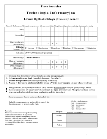 Praca kontrolna Technologia Informacyjna Liceum Ogólnokształcące (trzyletnie), sem. II Wypełnić drukowanymi literami, komputerowo lub czarnym/niebieskim piórem/długopisem, wpisując jeden znak w kratkę Imię: Nazwisko: Data urodzenia: (dd-mm-rrrr) Oddział: (zaznacz ) – Łozowa – Krochmalna 1 9 Ogrodowa Gdańska Lermontowa Zamknięta Rok szk.: 2007 / 2008 (semestr jesienny) Prowadzący: Tomasz Stasiak Data wykonania: (dd-mm-rrrr) Data przyjęciaa: (dd-mm-rrrr) – – 2 0 0 7 – – 2 0 0 7 Opracuj dwa dowolnie wybrane tematy spośród następujących: 1. Arkusz przeliczania liczb (wypełnij dołączony formularz). 2. Zestaw komputerowy (wypełnij dołączony formularz). 3. Napisz w dowolnym edytorze tekstów swoje CV i list motywacyjny (dołącz własny wydruk). ! Przygotowaną pracę należy w całości spiąć na stałe zszywaczem w lewym górnym rogu. Prace łączone spinaczem lub oddawane w koszulkach nie będą przyjmowane. Akceptowane będą jedynie prace samodzielne (niedozwolone są plagiaty, odbitki ksero itp.) Kryteria oceniania: łącznie można uzyskać maks.5 pkt. 0-1 pkt – niedostateczny 2 pkt – dopuszczający 3 pkt – dostateczny 4 pkt – dobry 5 pkt – bardzo dobry Za każdy opracowany temat można zdobyć maks. 1 pkt. Za oddanie pracy w terminie maks. 3 pkt. Recenzja: Praca wykonana właściwie. Spełnia wymogi dopuszczenia słuchacza do egzaminu semestralnego zgodnie z rozporządzeniem Ministra Edukacji Narodowej i Sportu z dnia 7.09.2004 r. (z późn. Zm.) w sprawie oceniania i klasyfikacji oraz przeprowadzania egzaminów. Podpis: wypełnia egzaminator Punkty: Ocena Podpis 1 Zagadnienia na egzamin z technologii informacyjnej dla liceum ogólnokształcącego, sem. II POZYCYJNE SYSTEMY LICZENIA – 1. 2. 3. 4. 5. System binarny System szesnastkowy Binarna reprezentacja liczb ujemnych Operacje arytmetyczne na bitach – dodawanie Kod ASCII BUDOWA KOMPUTERA – 6. Podstawowe elementy komputera. 7. Podzespoły płyty głównej 8. Złącza płyty głównej 9. Procesory – producenci, nazwy handlowe 10. Procesory – parametry (taktowanie, pamięć Cache, liczba rdzeni, gniazdo) 11. Zadania pamięci 12. Rodzaje pamięci 13. Pamięci – parametry (rodzaj złącza, pojemność) 14. Chipsety 15. Urządzenia zewnętrzne dołączane do komputera i ich zadania 16. Klawiatury 17. Monitory (rodzaje, parametry) 18. Skanery 19. Drukarki (rodzaje, właściwości) 20. Gniazda wyjściowe komputera (interfejsy) 21. Interfejsy – port szeregowy 22. Interfejsy – port równoległy 23. Interfejsy – port USB 24. Interfejsy – port FireWire 25. Pamięci masowe – stacja dysków elastycznych 26. Pamięci masowe – dysk twardy (oznaczenia) 27. Pamięci masowe - HDD (parametry, złącza) 28. Napędy optyczne – rodzaje 29. Napędy optyczne – parametry 30. Napędy optyczne - złącza EDYTOR TEKSTU 31. Parametry strony dokumentu 32. Parametry akapitu 33. Przypisy. 34. Tabulatory. 35. Kolumny 36. Symbole. 37. Parametry czcionki 38. Sposoby tworzenia tabel 39. Formatowanie tabel 40. Style w dokumencie 41. Szablony 42. Tworzenie i zastosowanie korespondencji seryjnej 43. Tworzenie CV i listów motywacyjnych SYSTEM OPERACYJNY, OBSŁUGA INTERNETU 44. Instalacja, aktualizacja systemu Windows 45. Klasyfikacja oprogramowania ze względu na jego funkcje. 46. Podstawowe elementy systemu graficznego Windows. 47. Podstawowe operacje na plikach i folderach. 48. Elementy konfiguracji systemu z Panelu sterowania. 49. Usługi dostępne w Internecie. 50. Zakładanie bezpłatnego konta pocztowego 51. E-commerce 52. Internet w telefonach komórkowych 53. ftp i jego podstawowe komendy. 54. domeny internetowe 55. Konfiguracja programu pocztowego, rodzaje kont pocztowych. 56. Zasady wyszukiwania informacji w Internecie. 57. Wyszukiwarki i katalogi tematyczne 58. Przykłady i działanie komunikatorów internetowych. 59. Sposoby wysyłania i odbierania sms-ów przy pomocy Internetu. 60. Grupy dyskusyjne 2 1. ARKUSZ PRZELICZANIA LICZB Wykonaj wszystkie poniższe zadania i uzupełnij puste kratki wpisując w każdą z nich tylko jeden znak: 1. Dodaj do siebie dzień i miesiąc własnej daty urodzenia. Tak otrzymaną liczbę dziesiętną zamień na dwójkową, np. osoba urodzona 15 stycznia 1970 zamienia liczbę 16(10) (15+1=16) Odpowiedź: 2. Zapisz obok siebie kolejno dzień i miesiąc własnej daty urodzenia (miesiąc w postaci dwóch cyfr). Tak uzyskaną liczbę dziesiętną zamień na szesnastkową, np. osoba urodzona 15 stycznia 1970 zamienia liczbę 1501(10) Odpowiedź: 3. Pierwsza cyfra liczby szesnastkowej jest równa ostatniej cyfrze Twojego roku urodzenia. Druga cyfra liczby szesnastkowej jest zależna od miesiąca urodzenia – odpowiedniki przedstawia tabela: Miesiąc ur. Cyfra 1 1 2 3 3 5 4 7 5 9 6 A 7 B 8 C 9 D 10 E 11 F 12 2 Trzecia cyfra liczby szesnastkowej jest zależna od dnia urodzenia – odpowiedniki przedstawia tabela: Dzień ur. Cyfra 1-4 A 5-8 B 9-13 C 14-18 D 19-25 E 26-31 F Tak uzyskaną liczbę szesnastkową zamień na: a) dziesiętną Odpowiedź: b) dwójkową Odpowiedź: np. osoba urodzona 15 stycznia 1970 zamienia liczbę 01D(16) 3 2. ZESTAW KOMPUTEROWY Z dostępnych na rynku elementów komputerowych złóż zestaw komputerowy przeznaczony do konkretnego zastosowania. W uwagach wytłumacz swój wybór. Wypełnić czytelnie, komputerowo lub drukowanymi literami, czarnym/niebieskim piórem/długopisem. Wszelkie dane niejednoznaczne będą interpretowane na niekorzyść autora. Lp. Rodzaj podzepołu1 Producent / model, typ2 Cena Cechy, właściwości, parametry3 ( w PLN, brutto) Uwagi4: 1 np. procesor, pamięć, dysk twardy, karta graficzna itd. itp np. AMD, Celeron D351, Seagate ST5467, ATI, HP d125xi itd. itp. 3 W zależności od podzespołu podać: częstotliwość zegara, szyny FSB, rozmiar, pojemność, rodzaj chipsetu, rodzaj rdzenia, typ złącza/gniazda, wielkość, technologię wykonania, inne cechy, itd. itp. 4 np. przeznaczenie zestawu (biuro, dom, praco