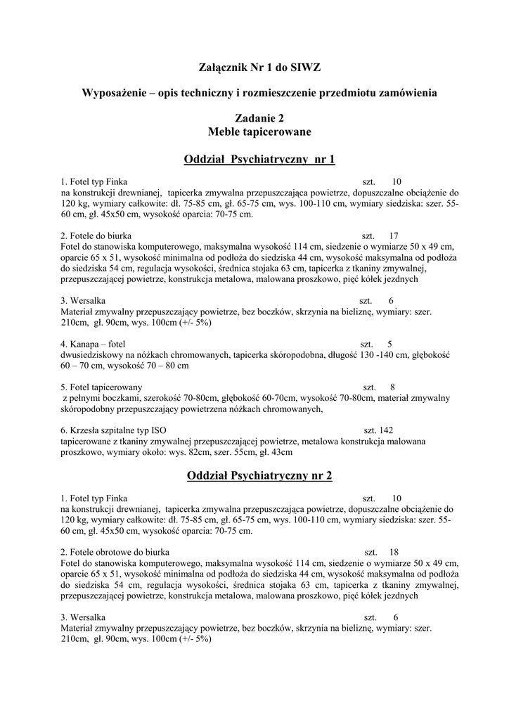 Załącznik Nr 1 do SIWZ WyposaŜenie – opis techniczny i rozmieszczenie przedmiotu zamówienia Zadanie 2 Meble tapicerowane Oddział Psychiatryczny nr 1 1. Fotel typ Finka szt. 10 na konstrukcji drewnianej, tapicerka zmywalna przepuszczająca powietrze, dopuszczalne obciąŜenie do 120 kg, wymiary całkowite: dł. 75-85 cm, gł. 65-75 cm, wys. 100-110 cm, wymiary siedziska: szer. 5560 cm, gł. 45x50 cm, wysokość oparcia: 70-75 cm. 2. Fotele do biurka szt. 17 Fotel do stanowiska komputerowego, maksymalna wysokość 114 cm, siedzenie o wymiarze 50 x 49 cm, oparcie 65 x 51, wysokość minimalna od podłoŜa do siedziska 44 cm, wysokość maksymalna od podłoŜa do siedziska 54 cm, regulacja wysokości, średnica stojaka 63 cm, tapicerka z tkaniny zmywalnej, przepuszczającej powietrze, konstrukcja metalowa, malowana proszkowo, pięć kółek jezdnych 3. Wersalka szt. 6 Materiał zmywalny przepuszczający powietrze, bez boczków, skrzynia na bieliznę, wymiary: szer. 210cm, gł. 90cm, wys. 100cm (+/- 5%) 4. Kanapa – fotel szt. 5 dwusiedziskowy na nóŜkach chromowanych, tapicerka skóropodobna, długość 130 -140 cm, głębokość 60 – 70 cm, wysokość 70 – 80 cm 5. Fotel tapicerowany szt. 8 z pełnymi boczkami, szerokość 70-80cm, głębokość 60-70cm, wysokość 70-80cm, materiał zmywalny skóropodobny przepuszczający powietrzena nóŜkach chromowanych, 6. Krzesła szpitalne typ ISO szt. 142 tapicerowane z tkaniny zmywalnej przepuszczającej powietrze, metalowa konstrukcja malowana proszkowo, wymiary około: wys. 82cm, szer. 55cm, gł. 43cm Oddział Psychiatryczny nr 2 1. Fotel typ Finka szt. 10 na konstrukcji drewnianej, tapicerka zmywalna przepuszczająca powietrze, dopuszczalne obciąŜenie do 120 kg, wymiary całkowite: dł. 75-85 cm, gł. 65-75 cm, wys. 100-110 cm, wymiary siedziska: szer. 5560 cm, gł. 45x50 cm, wysokość oparcia: 70-75 cm. 2. Fotele obrotowe do biurka szt. 18 Fotel do stanowiska komputerowego, maksymalna wysokość 114 cm, siedzenie o wymiarze 50 x 49 cm, oparcie 65 x 51, wysokość minimalna od podłoŜa do siedziska 44 cm, wysokość maksymalna od podłoŜa do siedziska 54 cm, regulacja wysokości, średnica stojaka 63 cm, tapicerka z tkaniny zmywalnej, przepuszczającej powietrze, konstrukcja metalowa, malowana proszkowo, pięć kółek jezdnych 3. Wersalka szt. 6 Materiał zmywalny przepuszczający powietrze, bez boczków, skrzynia na bieliznę, wymiary: szer. 210cm, gł. 90cm, wys. 100cm (+/- 5%) 4. Foteliki szt. 14 małe na nóŜkach chromowych, z pełnymi boczkami ma kółkach, szerokość 70-80cm, głębokość 60-70cm, wysokość 70-80cm, materiał zmywalny skóropodobny przepuszczający powietrze 5. Kanapa – fotel szt. 8 dwusiedziskowy na nóŜkach chromowanych, tapicerka skóropodobna, długość 130 -140 cm, głębokość 60 – 70 cm, wysokość 70 – 80 cm 6. Krzesła szpitalne typ ISO szt. 145 tapicerowane z tkaniny zmywalnej przepuszczającej powietrze, metalowa konstrukcja malowana proszkowo, wymiary około: wys. 82cm, szer. 55cm, gł. 43cm Obszar diagnostyczny dorosłych 1. Fotel do biurka szt. 4 Aluminiowa podstawa, poszycie z poliestrowej siatki, pneumatyczna regulacja wysokości siedzi ska z wysokim oparciem, z podłokietnikami 2. Krzesło szpitalne typ ISO szt. 11 tapicerowane z tkaniny zmywalnej przepuszczającej powietrze, metalowa konstrukcja malowana proszkowo, wymiary około: wys. 82cm, szer. 55cm, gł. 43cm Dzienny Oddział Psychiatryczny Pokój wypoczynkowy (1.86) 1. Tapczan jednoosobowy 200 x 90 x 40 szt. 4 Tapicerowany, z tkaniny zmywalnej, przepuszczającej powietrze, w kolorze beŜowym, na konstrukcji drewnianej z płyty laminowanej 2. Krzesło szpitalne typ ISO szt. 2 tapicerowane z tkaniny zmywalnej przepuszczającej powietrze, metalowa konstrukcja malowana proszkowo, wymiary około: wys. 82cm, szer. 55cm, gł. 43cm Pokój wypoczynkowy (1.87) 3. Tapczan jednoosobowy 200 x 90 x 40 szt. 4 tapicerowany z tkaniny zmywalnej przepuszczającej powietrze, w kolorze beŜowym, na konstrukcji drewnianej z płyty laminowanej 4. Krzesło szpitalne typ ISO szt. 2 tapicerowane z tkaniny zmywalnej przepuszczającej powietrze, metalowa konstrukcja malowana proszkowo, wymiary około: wys. 82cm, szer. 55cm, gł. 43cm Sala terapeutyczna (1.89) 5. Fotele tapicerowane typu Finka szt. 3 na konstrukcji drewnianej, tapicerka zmywalna przepuszczająca powietrze, dopuszczalne obciąŜenie do 120 kg, wymiary całkowite: dł. 75-85 cm, gł. 65-75 cm, wys. 100-110 cm, wymiary siedziska: szer. 5560 cm, gł. 45x50 cm, wysokość oparcia: 70-75 cm. 6. Krzesło szpitalne typ ISO szt. 9 tapicerowane z tkaniny zmywalnej przepuszczającej powietrze, metalowa konstrukcja malowana proszkowo, wymiary około: wys. 82cm, szer. 55cm, gł. 43cm 7. Fotel do stanowiska komputerowego szt. 3 maksymalna wysokość 114 cm, siedzenie o wymiarze 50 x 49 cm, oparcie 65 x 51, wysokość minimalna od podłoŜa do siedziska 44 cm, wysokość maksymalna od podłoŜa do siedziska 54 cm, regulacja wysokości, średnica stojaka 63 cm, tapicerka z tkaniny zmywalnej, przepuszczającej powietrze, konstrukcja metalowa, malowana proszkowo, pięć kółek jezdnych Sala terapeutyczna (1.88) 8. Krzesło szpitalne typ ISO szt. 8 tapicerowane z tkaniny zmywalnej przepuszczającej powietrze, metalowa konstrukcja malowana proszkowo, wymiary około: wys. 82cm, szer. 55cm, gł. 43cm 9. Fotele tapicerowane typu Finka szt. 3 na konstrukcji drewnianej, tapicerka zmywalna przepuszczająca powietrze, dopuszczalne obciąŜenie do 120 kg, wymiary całkowite: dł. 75-85 cm, gł. 65-75 cm, wys. 100-110 cm, wymiary siedziska: szer. 5560 cm, gł. 45x50 cm, wysokość oparcia: 70-75 cm. 10. Fotel do stanowiska komputerowego szt. 1 maksymalna wysokość 114 cm, siedzenie o wymiarze 50 x 49 cm, oparcie 65 x 51, wysokość minimalna od podłoŜa do siedziska 44 cm, wysokość maksymalna od podłoŜa do siedziska 54 cm, regulacja wysokości, średnica stojaka 63 cm, tapicerka z tkaniny zmywalnej, pr