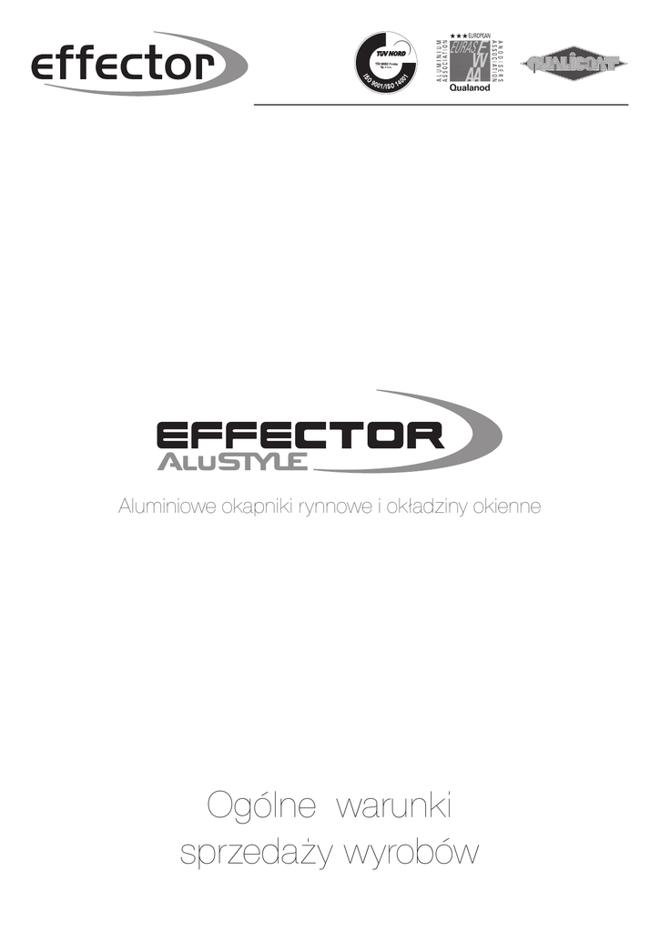 Aluminiowe okapniki rynnowe i okładziny okienne Ogólne warunki sprzedaży wyrobów 1. Zakres stosowania ogólnych warunków sprzedaży. 1. Niniejsze ogólne warunki sprzedaży określają warunki wykonania przez firmę Effector S.A. z siedzibą we Włoszczowie sprzedaży i dostawy wyrobów na rzecz Kupującego, jak również inne zobowiązania stron wynikające ze współpracy handlowej. 2. Użyte w niniejszych Ogólnych Warunkach Sprzedaży określania oznaczają: a) „Sprzedawca” - Effector S.A. z siedzibą we Włoszczowie, przy ul. Młynarskiej 29. b) „Kupujący” - osoba fizyczna, prawna, jednostka organizacyjna nie posiadająca osobowości prawnej, która dokonuje zakupu wyrobów na cele związane z prowadzoną działalnością gospodarczą. c) „OWS” – niniejsze Ogólne Warunki Sprzedaży, które mają zastosowanie do każdej zawartej umowy współpracy, cennika, oferty, uzgodnień handlowych w zakresie realizacji dostaw na terenie Rzeczypospolitej Polskiej i obowiązują obie strony Umowy, jeśli nie uzgodnią one pisemnie wyraźnie odmiennych postanowień. Wszelkie zmiany, dodatkowe uzgodnienia, zawieszenia lub wypowiedzenia warunków wymagają pisemnej zgody Sprzedawcy. d) „Wyroby” – wyroby gotowe znajdujące się w aktualnej ofercie handlowej Sprzedawcy. e) „Wyroby niestandardowe” - wyroby nie znajdujące się w aktualnej ofercie handlowej Sprzedawcy, a których wykonania podjął się Sprzedawca w ramach indywidualnych pisemnych uzgodnień z Kupującym. f) „Cena” – wartość netto Wyrobów, wskazana w aktualnie obowiązującym cenniku lub w indywidualnej wycenie dokonanej przez Sprzedawcę. g) „Minimum logistyczne” – określona w OWS wielkość zamówienia, od wartości którego Sprzedawca zobowiązany jest dokonać transportu wyrobów na swój koszt. Do wyliczenia wartości zamówienia przyjmuje się cenę netto zamówionych Wyrobów z uwzględnieniem udzielonych Kupującemu rabatów. 3. OWS stanowią integralną część umowy współpracy pomiędzy Sprzedawcą a Kupującym, która zostaje zawarta przez podpisanie przez strony umowy współpracy wg standardów i wzorów opracowanych przez Sprzedawcę. Umowa jest wiążąca dla stron z chwilą doręczenia Sprzedawcy, podpisanej przez Kupującego umowy współpracy i akceptacji warunków OWS. Podpisanie przez Kupującego umowy współpracy stanowi przyjęcie niniejszych OWS, z wyłączeniem tych postanowień umownych, które strony na piśmie uzgodniły inaczej. 2. Zamówienia. 1. Zamówienia składane są przez Kupującego w formie pisemnej pocztą elektroniczną lub faksem. 2. Zamówienie musi zawierać dane Kupującego, szczegółowe informacje dotyczące zamawianego wyrobu, ilość i pożądany termin wykonania oraz inne dane dotyczące pożądanych przez Kupującego warunków realizacji zamówienia. 3. O ile strony nie ustaliły inaczej, po przyjęciu zamówienia, Sprzedawca zobowiązuje się do jego realizacji w terminie ustalonym poprzez indywidualne pisemne uzgodnienia z Kupującym. Jeżeli brak takich uzgodnień, termin realizacji zostanie podany przez Sprzedawcę. 4. W przypadku wyrobów niestandardowych okres realizacji zamówienia będzie ustalany indywidualnie między Stronami. 5. W przypadku, gdy warunki zamówienia nie mogą zostać przyjęte, Sprzedawca zawiadamia o tym Kupującego drogą elektroniczną lub faksem w terminie do 3 dni roboczych od daty otrzymania zamówienia, określając własne propozycje realizacji zamówienia. Brak odpowiedzi Kupującego na propozycję Sprzedawcy wiąże się z wstrzymaniem realizacji zamówienia. W przypadku dokonania przez Kupującego zmian w przesłanej przez Sprzedawcę propozycji realizacji zamówienia, Kupujący ma obowiązek powiadomić pisemnie Sprzedawcę o dokonanych zmianach. Zgłoszenia uwag przez Kupującego, uważa się za złożenie nowego zamówienia, przy czym postanowienia zdań poprzedzających stosuje się odpowiednio. 6. Kupujący ma prawo wycofać lub zmienić złożone zamówienie wyłącznie za pisemną zgodą Sprzedawcy i tylko w przypadku jeżeli realizacja zamówienia jeszcze nie została rozpoczęta. W przypadku jeżeli Kupujący zdecyduje się na przerwanie zamówienia w trakcie jego realizacji, Sprzedawca jest uprawniony do określenia poziomu poniesionych kosztów i obciążenia nimi Kupującego. 7. Dla celów prawidłowego określenia przedmiotu zamówienia, Sprzedawca może opracować i przekazać Kupującemu (także w formie elektronicznej w postaci zakładki na stronie internetowej) wzór zamówienia, w którym określone zostaną wszystkie istotne warunki zamówienia zgodnie z obowiązującymi w przedsiębiorstwie Sprzedawcy procedurami i wymogami. 8. Do zawarcia umowy sprzedaży dochodzi, gdy Strony zgodnie z warunkami niniejszego punktu ustalą wszystkie warunki realizacji zamówienia. 9. W terminie do 3 dni od daty złożenia zamówienia, Sprzedawca może odmówić przyjęcia zamówienia do realizacji, o czym poinformuje Kupującego drogą elektroniczną lub faksem, podając przyczynę odmowy. 10. Fakt przyjęcia zamówienia nie wiąże Sprzedawcy w sytuacji, gdy z przyczyn od niego niezależnych, w szczególności z powodu siły wyższej, albo zachowań Kupującego lub osób trzecich (w tym dostawców Sprzedawcy), wykonanie i sprzedaż wyrobów jest niemożliwe lub nadmiernie utrudnione. 11. W przypadku opóźnień w zapłacie wymagalnych należności Sprzedawca ma prawo wstrzymać przyjęcie i/lub realizację kolejnych zamówień do czasu uregulowania należności, co może spowodować wydłużenie terminów ich realizacji, albo odmówić ich wykonania. W takim przypadku złożenie/przyjęcie zamówienia nie wiąże Sprzedawcy. 12. Przyjęcie zamówienia nie wiąże Sprzedawcy również w sytuacji, gdy łączne zobowiązania Kupującego wobec Sprzedawcy przekroczą kwotę przyznanego przez Sprzedawcę, zgodnie z OWS limitu kredytowego. 3. Cena wyrobów. 1. Cenę wyrobu określa cennik indywidualny kl