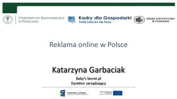 Reklama online w Polsce Katarzyna Garbaciak Baby’s Secret.pl Dyrektor zarządzający www.babyssecret.pl Plan prezentacji 1. 2. 3. 4. 5. 6. 7. Jesteśmy profilem Jaka jest reklama online? Wartość reklamy online w Polsce Cele reklamy online Rodzaje reklam Planujemy kampanię Ocena efektów działań 2 www.babyssecret.pl Kim jesteśmy? • Internet stał się naszym doradcą, przyjacielem, lekarzem • w bazach Google, Facebooka jesteśmy profilem • nie chcemy pokornie słuchać tradycyjnych komunikatów marketingowych 3 www.babyssecret.pl Jaka jest reklama on-line? • dane dotyczące Klientów, ich zachowań są dostępne jak na dłoni, w czasie rzeczywistym • dobry cel, dane, technologia i dobra analiza pozwalają działać efektywnie • zamiast intuicji potrzebujemy analityka, zamiast mediaplanów – tablicy z danymi aktualizowanymi w czasie rzeczywistym BabysSecret Sp. z o.o., ul. Janiny Omańkowskiej 58, 60-465 Poznań, NIP: 7811883356 4 www.babyssecret.pl • niezależnie od tego, czy kampania jest wizerunkowa czy sprzedażowa zawsze trzeba mieć na uwadze cel i zmieniać założenia w czasie rzeczywistym • marka musi użytkownika zabrać w podróż i ciągle mu towarzyszyć • przekaz dopasowany do kanału, w którym się komunikujemy BabysSecret Sp. z o.o., ul. Janiny Omańkowskiej 58, 60-465 Poznań, NIP: 7811883356 www.babyssecret.pl 5 Internet umożliwia łatwe mierzenie i pozwala na lepszą analizę Ciasteczko to bardzo mały plik tekstowy wysyłany przez serwer www i zapisywany na dysku twardym komputera, z którego odwiedzamy stronę internetową. BabysSecret Sp. z o.o., ul. Janiny Omańkowskiej 58, 60-465 Poznań, NIP: 7811883356 6 www.babyssecret.pl 1. 2. 3. 4. gdy Użytkownik wchodzi na stronę, zostaje wysłane wywołanie strony do serwera, na którym się ona znajduje. podczas ładowania witryny w oknie przeglądarki, wykonywany jest skrypt kodu śledzącego ciasteczka (ang. cookies) są czytane następnie zostają wysłane do zabezpieczonego serwera Google, na którym informacje są składowane i modyfikowane. Conversion.pl BabysSecret Sp. z o.o., ul. Janiny Omańkowskiej 58, 60-465 Poznań, NIP: 7811883356 7 www.babyssecret.pl Google Analytics BabysSecret Sp. z o.o., ul. Janiny Omańkowskiej 58, 60-465 Poznań, NIP: 7811883356 8 www.babyssecret.pl odsetek wizyt, podczas których użytkownik opuścił stronę ze strony wejścia odsetek wizyt, które doprowadził do transakcji e-commerce BabysSecret Sp. z o.o., ul. Janiny Omańkowskiej 58, 60-465 Poznań, NIP: 7811883356 9 www.babyssecret.pl Tagowanie kampanii http://grupapracuj.pl/it/?utm_source=Antyweb.pl&utm_medium=referral&utm_content=1200x400px&utm_campaign=Display BabysSecret Sp. z o.o., ul. Janiny Omańkowskiej 58, 60-465 Poznań, NIP: 7811883356 10 www.babyssecret.pl http://grupapracuj.pl/it/?utm_source=Antyweb.pl&utm_medium=referral&utm_content=1200x400px&utm _campaign=Display Źródło kampanii (utm_source) Wymagane. Zmienna utm_source pozwala określić wyszukiwarkę, nazwę newslettera lub inne źródło. Przykład: utm_source=google Medium kampanii (utm_medium) Wymagane. Zmienna utm_medium pozwala określić medium, takie jak e-mail, ruch płatny. Przykład: utm_medium=cpc Treść kampanii (utm_content) Służy do testowania wersji A/B oraz reklam kierowanych na sieć reklamową. Zmienna utm_content pozwala na rozróżnienie reklam lub linków kierujących do tego samego adresu URL. Nazwa kampanii (utm_campaign) Służy do analizy słów kluczowych. Zmienna utm_campaign pozwala na zidentyfikowanie określonej promocji produktu lub kampanii strategicznej. BabysSecret Sp. z o.o., ul. Janiny Omańkowskiej 58, 60-465 Poznań, NIP: 7811883356 11 www.babyssecret.pl Reklama online w Polsce BabysSecret Sp. z o.o., ul. Janiny Omańkowskiej 58, 60-465 Poznań, NIP: 7811883356 12 www.babyssecret.pl Wartość reklamy online W roku 2014 wartość reklamy online miała przekroczyć 2,5 mld zł BabysSecret Sp. z o.o., ul. Janiny Omańkowskiej 58, 60-465 Poznań, NIP: 7811883356 13 www.babyssecret.pl Potencjał z punktu widzenia wybranych branż Finanse • duzi gracze stawiają na działania wizerunkowe (strony główne i poczta dużych portali horyzontalnych) • mniejsi gracze koncentrują się wokół sprofilowanych portali tematycznych • wszyscy wykorzystują także działania efektywnościowe rozliczane za konkretny efekt BabysSecret Sp. z o.o., ul. Janiny Omańkowskiej 58, 60-465 Poznań, NIP: 7811883356 14 www.babyssecret.pl Telekomunikacja • wysoki stopień nasycenia i narzędzia, które wykorzystują duże sklepy internetowe • rozliczenie za wyświetlenie odpowiedniej liczby odsłon konkretnemu użytkownikowi (audience buying) • retargeting i personalizacja BabysSecret Sp. z o.o., ul. Janiny Omańkowskiej 58, 60-465 Poznań, NIP: 7811883356 15 www.babyssecret.pl E-handel • wzrost popularności efektywnościowych form reklamowych – rozliczanych za konkretny efekt BabysSecret Sp. z o.o., ul. Janiny Omańkowskiej 58, 60-465 Poznań, NIP: 7811883356 16 www.babyssecret.pl Kampania reklamowa Kampania reklamowa online jest formą promocji wykorzystującą Internet jako medium. Przykładem reklamy online może być reklama kontekstowa, baner czy e-mail marketing. Kampania reklamowa online jest podobna do każdej inne kampanii, tyle że działania promocyjne są prowadzone w Internecie. BabysSecret Sp. z o.o., ul. Janiny Omańkowskiej 58, 60-465 Poznań, NIP: 7811883356 17 www.babyssecret.pl Przewagi reklamy online • nie trzeba długich przygotowań • może wystartować błyskawicznie po akceptacji media planu • szybkość dotarcia i duży zasięg • możliwość precyzyjnego kierowania przekazu • precyzyjna analiza danych BabysSecret Sp. z o.o., ul. Janiny Omańkowskiej 58, 60-465 Poznań, NIP: 7811883356 18 www.babyssecret.pl Cele kampanii online 1. reakcja bezpośrednia – wywołanie konkretnego działania – odwiedzenie strony WWW, zarejestrowanie się, złożenie zamówienia 2. bran