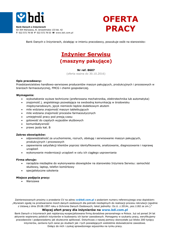 Bank Danych o Inżynierach 02-304 Warszawa, Al. Jerozolimskie 133 lok. 42 T 022 572 78 00 F 022 572 78 03 W www.bdi.com.pl OFERTA PRACY Bank Danych o Inżynierach, działając w imieniu pracodawcy, poszukuje osób na stanowisko: Inżynier Serwisu (maszyny pakujące) Nr ref. 8607 (oferta ważna do 30.10.2016) Opis pracodawcy: Przedstawicielstwo handlowo-serwisowe producentów maszyn pakujących, produkcyjnych i procesowych w branżach farmaceutycznej, FMCG i chemii gospodarczej. Wymagania: wykształcenie wyższe techniczne (preferowana mechatronika, elektrotechnika lub automatyka) znajomość j. angielskiego pozwalająca na swobodną komunikację w środowisku międzynarodowym, język niemiecki będzie dodatkowym atutem mile widziana znajomość maszyn tabletkujących mile widziana znajomość procesów farmaceutycznych umiejętność pracy pod presją czasu gotowość do częstych wyjazdów służbowych komunikatywność prawo jazdy kat. B Zakres obowiązków: odpowiedzialność za uruchomienie, rozruch, obsługę i serwisowanie maszyn pakujących, produkcyjnych i procesowych zapewnienie satysfakcji klientów poprzez identyfikowanie, analizowanie, diagnozowanie i naprawę urządzeń wykonywanie modernizacji urządzeń w celu ich ciągłego usprawniania Firma oferuje: narzędzia niezbędne do wykonywania obowiązków na stanowisko Inżyniera Serwisu: samochód służbowy, laptop, telefon komórkowy specjalistyczne szkolenia Miejsce podjęcia pracy: Warszawa Zainteresowanych prosimy o przesłanie CV na adres [email protected] z podaniem numeru referencyjnego oraz dopiskiem: „Wyrażam zgodę na przetwarzanie moich danych osobowych dla potrzeb niezbędnych do realizacji procesu rekrutacji (zgodnie z Ustawą z dnia 29.08.1997 roku o Ochronie Danych Osobowych; tekst jednolity: Dz.U. z 2014r., poz.1182 ze zm.).” Więcej ofert pracy dla inżynierów na www.bdi.com.pl Bank Danych o Inżynierach jest najstarszą wyspecjalizowana firmą doradztwa personalnego w Polsce. Już od ponad 24 lat aktywnie wspieramy polskich inżynierów w budowaniu ich karier zawodowych. Pomagamy w szukaniu pracy, weryfikujemy pracodawców i podpowiadamy jak skutecznie aplikować. Dotychczas z naszej pomocy skorzystało już blisko 200 tysięcy inżynierów, zarówno tych zaraz po studiach jak i tych posiadających wieloletnie doświadczenie zawodowe. Dołącz do nich i zyskaj sprawdzonego sojusznika na rynku pracy.