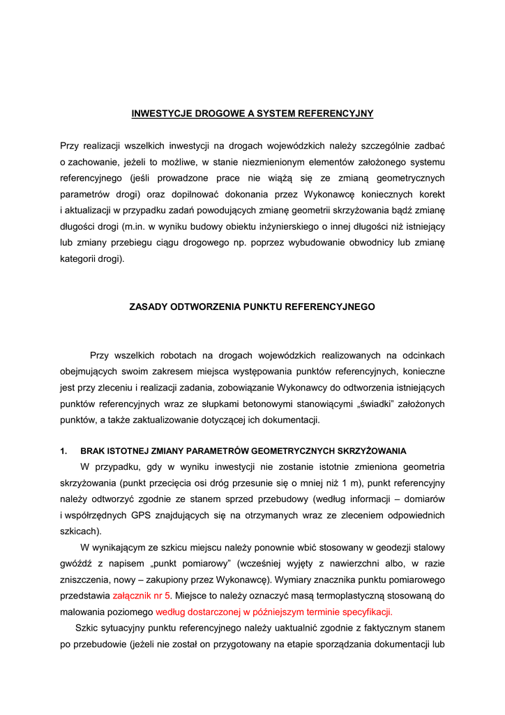 INWESTYCJE DROGOWE A SYSTEM REFERENCYJNY Przy realizacji wszelkich inwestycji na drogach wojewódzkich należy szczególnie zadbać o zachowanie, jeżeli to możliwe, w stanie niezmienionym elementów założonego systemu referencyjnego (jeśli prowadzone prace nie wiążą się ze zmianą geometrycznych parametrów drogi) oraz dopilnować dokonania przez Wykonawcę koniecznych korekt i aktualizacji w przypadku zadań powodujących zmianę geometrii skrzyżowania bądź zmianę długości drogi (m.in. w wyniku budowy obiektu inżynierskiego o innej długości niż istniejący lub zmiany przebiegu ciągu drogowego np. poprzez wybudowanie obwodnicy lub zmianę kategorii drogi). ZASADY ODTWORZENIA PUNKTU REFERENCYJNEGO Przy wszelkich robotach na drogach wojewódzkich realizowanych na odcinkach obejmujących swoim zakresem miejsca występowania punktów referencyjnych, konieczne jest przy zleceniu i realizacji zadania, zobowiązanie Wykonawcy do odtworzenia istniejących punktów referencyjnych wraz ze słupkami betonowymi stanowiącymi „świadki” założonych punktów, a także zaktualizowanie dotyczącej ich dokumentacji. 1. BRAK ISTOTNEJ ZMIANY PARAMETRÓW GEOMETRYCZNYCH SKRZYŻOWANIA W przypadku, gdy w wyniku inwestycji nie zostanie istotnie zmieniona geometria skrzyżowania (punkt przecięcia osi dróg przesunie się o mniej niż 1 m), punkt referencyjny należy odtworzyć zgodnie ze stanem sprzed przebudowy (według informacji – domiarów i współrzędnych GPS znajdujących się na otrzymanych wraz ze zleceniem odpowiednich szkicach). W wynikającym ze szkicu miejscu należy ponownie wbić stosowany w geodezji stalowy gwóźdź z napisem „punkt pomiarowy” (wcześniej wyjęty z nawierzchni albo, w razie zniszczenia, nowy – zakupiony przez Wykonawcę). Wymiary znacznika punktu pomiarowego przedstawia załącznik nr 5. Miejsce to należy oznaczyć masą termoplastyczną stosowaną do malowania poziomego według dostarczonej w późniejszym terminie specyfikacji. Szkic sytuacyjny punktu referencyjnego należy uaktualnić zgodnie z faktycznym stanem po przebudowie (jeżeli nie został on przygotowany na etapie sporządzania dokumentacji lub w przypadku zmian w stosunku do przygotowanego na etapie dokumentacji szkicu). Główną część szkicu stanowi rysunek techniczny obszaru skrzyżowania. Przyjmuje się granicę strefy skrzyżowania na linii prostopadłej do osi jezdni, poprowadzonej z zakończenia łuku wyokrąglającego najbardziej oddalonego od punktu referencyjnego (w przypadku wysepek kanalizujących ruch, także przy rondach – zakres do końca wysepek). Na szkicu muszą się znaleźć: - rysunek pomocniczy przebiegu dróg na skrzyżowaniu z opisem numerów dróg i kierunków narastania kilometraża oraz nazwy ulic, - tabelka z numerem punktu, jego współrzędnymi GPS, nazwą drogi wojewódzkiej oraz dróg pozostałych i nazwą powiatu, - szkic techniczny skrzyżowania z wymiarami. Na szkicu technicznym niezbędne jest zaznaczenie miejsca umieszczenia punktu referencyjnego, minimum 3 domiarów do punktów stałych w terenie oraz lokalizację „świadka”. Należy zaznaczyć osie dróg, kierunek północy, nazwisko autora szkicu i datę jego wykonania, a także powiat, gminę i miejscowość. Konieczne jest określenie skali, w jakiej sporządzono rysunek oraz opisanie (jak na szkicu wyjściowym) kierunków oraz powiązań pomiędzy poprzedzającymi i następującymi punktami referencyjnymi. Ponadto na szkicu należy opisać poszczególne elementy występujące przy jezdni oraz zaznaczyć długości odcinków dróg w strefie skrzyżowania (czyli odległość od punktu referencyjnego do końca przyjętego obszaru skrzyżowania na każdym z wlotów). Na granicy stref na wlotach należy również zaznaczyć szerokości poszczególnych elementów. Dodatkowo należy ponumerować i policzyć powierzchnie elementów skrzyżowania, a następnie zamieścić je w tabeli według załączonego wzoru (załącznik nr 1 – tabela elementów skrzyżowania). Szkic należy wykonać opierając się na załączonych przykładach (załącznik nr 2a i 2b – przykładowy szkic z wymiarami i numeracją elementów). Wzór czystego formularza szkicu skrzyżowania z punktem referencyjnym, jaki należy stosować przedstawia załącznik nr 2c. Szkic należy dostarczyć w formie papierowej w postaci wydruku A4 (lub jeśli szkic w tej skali byłby nieczytelny w formacie A3) oraz w formie elektronicznej w formacie pliku *.DXF lub *.DWG. Dokumentację punktu referencyjnego trzeba uzupełnić o zdjęcia cyfrowe przestawiające stan skrzyżowania po przebudowie. Zdjęcia mają być wykonane z osi każdej krzyżującej się drogi w kierunku punktu referencyjnego, ujmować wlot skrzyżowania i przestawiać wszystkie elementy przekroju. Liczba zdjęć – minimum tyle, ile było na tym skrzyżowaniu przed realizacją zadania. Zdjęcia należy opisać zgodnie z numeracją na szkicu. Rozdzielczość zdjęć – min. 1280 x 960 pixeli. Format zapisu: *.jpg. Zdjęcia należy wykonać w okresie trwania sprzyjających warunków pogodowych (wyklucza się wykonanie zdjęć w czasie opadów deszczu, śniegu, podczas mgły czy w porze zmierzchu itp.). 2. ISTOTNA ZMIANA PARAMETRÓW GEOMETRYCZNYCH SKRZYŻOWANIA W razie, gdy w wyniku inwestycji, ma nastąpić znaczne przesunięcie (powyżej 1 m) miejsca przecięcia się osi dróg, punkt referencyjny należy wyznaczyć na nowo. Nowe miejsce lokalizacji punktu referencyjnego wyznacza się z zasady w punkcie krzyżowania się osi dróg. W przypadku skrzyżowań o przesuniętych wlotach oraz skrzyżowań skanalizowanych o większych wysepkach, oprócz punktu zasadniczego (pierwszy w kolejności narastającego kilometraża na drodze wojewódzkiej), wyznacza się także punkty pomocnicze opisywane za pomocą dużych liter alfabetu. Na rondach wyznacza się punkty na każdym z wlotów – w miejscu przecięcia osi drogi na wlocie z osią jezdni ronda: na pierwszym wloci