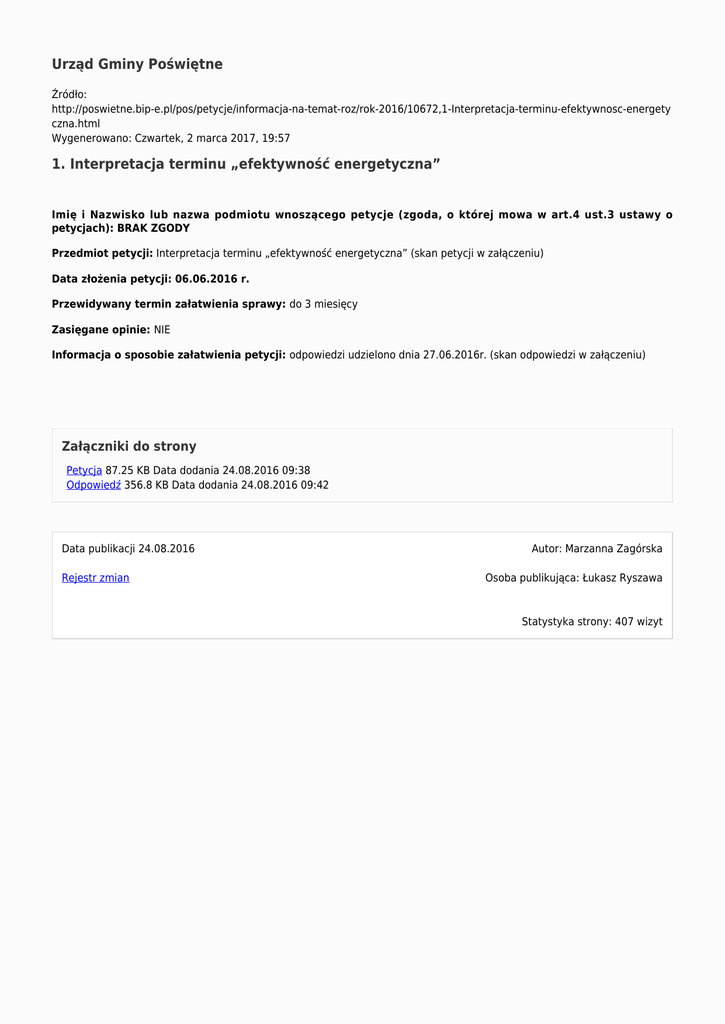 Urząd Gminy Poświętne Źródło: http://poswietne.bip-e.pl/pos/petycje/informacja-na-temat-roz/rok-2016/10672,1-Interpretacja-terminu-efektywnosc-energety czna.html Wygenerowano: Czwartek, 2 marca 2017, 19:57 1. Interpretacja terminu „efektywność energetyczna” Imię i Nazwisko lub nazwa podmiotu wnoszącego petycje (zgoda, o której mowa w art.4 ust.3 ustawy o petycjach): BRAK ZGODY Przedmiot petycji: Interpretacja terminu „efektywność energetyczna” (skan petycji w załączeniu) Data złożenia petycji: 06.06.2016 r. Przewidywany termin załatwienia sprawy: do 3 miesięcy Zasięgane opinie: NIE Informacja o sposobie załatwienia petycji: odpowiedzi udzielono dnia 27.06.2016r. (skan odpowiedzi w załączeniu) Załączniki do strony Petycja 87.25 KB Data dodania 24.08.2016 09:38 Odpowiedź 356.8 KB Data dodania 24.08.2016 09:42 Data publikacji 24.08.2016 Rejestr zmian Autor: Marzanna Zagórska Osoba publikująca: Łukasz Ryszawa Statystyka strony: 407 wizyt