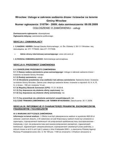 Wrocław: Usługa w zakresie sadzenia drzew i krzewów na terenie Gminy Wrocław Numer ogłoszenia: 310784 - 2009; data zamieszczenia: 09.09.2009 OGŁOSZENIE O ZAMÓWIENIU - usługi Zamieszczanie ogłoszenia: obowiązkowe. Ogłoszenie dotyczy: zamówienia publicznego. SEKCJA I: ZAMAWIAJĄCY I. 1) NAZWA I ADRES: Zarząd Zasobu Komunalnego , ul. Św. ElŜbiety 3, 50-111 Wrocław, woj. dolnośląskie, tel. 071 7778400, faks 071 7777506. • Adres strony internetowej zamawiającego: www.zzk.wroc.pl I. 2) RODZAJ ZAMAWIAJĄCEGO: Administracja samorządowa. SEKCJA II: PRZEDMIOT ZAMÓWIENIA II.1) OKREŚLENIE PRZEDMIOTU ZAMÓWIENIA II.1.1) Nazwa nadana zamówieniu przez zamawiającego: Usługa w zakresie sadzenia drzew i krzewów na terenie Gminy Wrocław. II.1.2) Rodzaj zamówienia: usługi. II.1.3) Określenie przedmiotu oraz wielkości lub zakresu zamówienia: Sadzenie drzew i krzewów na terenie Gminy Wrocław. Zakres prac obejmuje sadzenie drzew i krzewów w rejonach: B, H, K, R, S, U drzew - 106 szt, krzewów 14 szt.. II.1.4) Wspólny Słownik Zamówień (CPV): 77.21.16.00-8. II.1.5) Czy dopuszcza się złoŜenie oferty częściowej: nie. II.1.6) Czy dopuszcza się złoŜenie oferty wariantowej: nie. II.1.7) Czy przewiduje się udzielenie zamówień uzupełniających: tak. II.2) CZAS TRWANIA ZAMÓWIENIA LUB TERMIN WYKONANIA: Zakończenie: 30.11.2009. SEKCJA III: INFORMACJE O CHARAKTERZE PRAWNYM, EKONOMICZNYM, FINANSOWYM I TECHNICZNYM III.1) WARUNKI DOTYCZĄCE ZAMÓWIENIA Informacja na temat wadium: 1.Oferta musi być zabezpieczona wadium w wysokości 800,00 zł (słownie: osiemset złotych), 2.W zaleŜności od woli Wykonawcy wadium moŜe być wniesione w: a)pieniądzu, b)poręczeniach bankowych lub poręczeniach spółdzielczej kasy oszczędnościowo kredytowej, z tym, Ŝe poręczenie kasy jest zawsze poręczeniem pienięŜnym, c)gwarancjach bankowych, d)gwarancjach ubezpieczeniowych, e)poręczeniach udzielanych przez podmioty, o których mowa w art.6 b ust.5 pkt 2 ustawy z dnia 9 listopada 2000 r. o utworzeniu Polskiej Agencji Rozwoju Przedsiębiorczości (Dz. U. Nr 109 poz. 1158 ze zmianami). 3.Wadium wnoszone w pieniądzu naleŜy wpłacić przelewem na rachunek bankowy Zamawiającego: BZ WBK S.A I O Wrocław nr 13 1090 2398 0000 0006 0829 2362, tak aby kwota wadium znalazła się na koncie Zamawiającego nie później niŜ w dniu i godzinie przewidzianej na składanie ofert - podając (w tytule) na dowodzie wpłaty numer postępowania i lub nazwę postępowania. 4.Oryginał dowodu wniesienia wadium w pieniądzu lub jego kopię, opatrzoną klauzulą (za zgodność z oryginałem) i poświadczoną za zgodność z oryginałem przez Wykonawcę (podpisem czytelnym lub nieczytelnym wraz z pieczątką imienną), naleŜy dołączyć do oferty. 5.Wadium wnoszone w innej formie niŜ pieniądz musi mieć postać oświadczenia Gwaranta, w którym Gwarant zobowiązuje się nieodwołalnie i bezwarunkowo, na pierwsze Ŝądanie zapłacić Zamawiającemu kwotę stanowiącą równowartość wadium w przypadkach określonych ustawą, tj. gdy: a)Wykonawca w odpowiedzi na wezwanie, o którym mowa w art. 26 ust. 3 nie złoŜy dokumentów lub oświadczeń, o których mowa w art. 25 ust. 1, lub pełnomocnictw, chyba Ŝe udowodni, Ŝe wynika to z przyczyn nieleŜących po jego stronie, b) Wykonawca odmówi podpisania umowy w sprawie zamówienia publicznego na warunkach zawartych w ofercie, c)Wykonawca nie wniósł wymaganego zabezpieczenia naleŜytego wykonania umowy, d)zawarcie umowy w sprawie zamówienia publicznego stało się niemoŜliwe z przyczyn leŜących po stronie Wykonawcy. 6.Dowód wniesienia wadium w innej formie niŜ pieniądz naleŜy: a) oryginał dołączyć do oferty w taki sposób, by nie tworzył z nią całości tj. nie ponumerowany i nie związany na stałe z ofertą, b)kopię dowodu wniesienia wadium, opatrzoną klauzulą (za zgodność z oryginałem) i poświadczoną za zgodność z oryginałem przez Wykonawcę (podpisem czytelnym lub nieczytelnym wraz z pieczątka imienną) dołączyć do oferty. III.2) WARUNKI UDZIAŁU • Opis warunków udziału w postępowaniu oraz opis sposobu dokonywania oceny spełniania tych warunków: O udzielenie zamówienia ubiegać się mogą Wykonawcy spełniający warunki określone w art. 22 ust. 1 ustawy Prawo zamówień publicznych, a takŜe spełniający niŜej wymienione warunki: 1. Potencjał kadrowy Wykonawca musi wykazać, Ŝe dysponuje lub będzie dysponował osobą, która będzie uczestniczyć w wykonaniu zamówienia posiadającą wymagane kwalifikacje do wykonania przedmiotu zamówienia, tj. kierunkowe wykształcenie odpowiadające przedmiotowi zamówienia lub ukończony kurs pielęgnacji i leczenia drzew ozdobnych; osoba ta będzie odpowiadać za prawidłowe wykonanie zabiegów związanych z sadzeniem drzew i krzewów. Sposób dokonywania oceny spełniania warunków udziału w postępowaniu: Na potwierdzenie spełnienia wyŜej wymienionych warunków - Wykonawca dołączy do oferty oświadczenia i dokumenty wymienione w rozdziale IV SIWZ. Ocena spełniania warunków • wymaganych od Wykonawcy zostanie dokonana wg formuły: spełnia - nie spełnia.. Informacja o oświadczeniach i dokumentach, jakie mają dostarczyć wykonawcy w celu potwierdzenia spełniania warunków udziału w postępowaniu: A. Status prawny - wymagane dokumenty: 1. oświadczenie o spełnieniu warunków określonych w art. 22 ust. 1 ustawy Pzp wzór załącznika nr 2 do SIWZ 2. aktualny odpis z właściwego rejestru albo aktualne zaświadczenia o wpisie do ewidencji działalności gospodarczej, jeŜeli odrębne przepisy wymagają wpisu do rejestru lub zgłoszenia do ewidencji działalności gospodarczej - wystawione nie wcześniej niŜ 6 miesięcy przed upływem terminu składania ofert, 3. jeśli Wykonawca ma siedzibę lub miejsce zamieszkania poza terytorium Rzeczpospolitej Polskiej, zamiast dokumentu określonego w pkt 2 składa dokument lub dokumenty, wystawione w kraju , w 