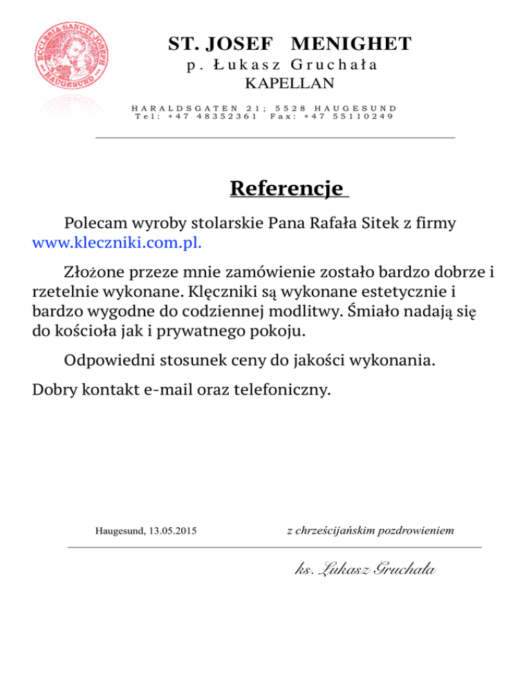 ST. JOSEF MENIGHET p. Łukasz Gruchała KAPELLAN H A R A L D S G A T E N 2 1 ; 5 5 2 8 H A U G E S U N D T e l : +47 48352361 Fax: +47 55110249 Referencje Polecam wyroby stolarskie Pana Rafała Sitek z firmy www.kleczniki.com.pl. Złożone przeze mnie zamówienie zostało bardzo dobrze i rzetelnie wykonane. Klęczniki są wykonane estetycznie i bardzo wygodne do codziennej modlitwy. Śmiało nadają się do kościoła jak i prywatnego pokoju. Odpowiedni stosunek ceny do jakości wykonania. Dobry kontakt e-mail oraz telefoniczny. Haugesund, 13.05.2015 z chrześcijańskim pozdrowieniem ks. Łukasz Gruchała