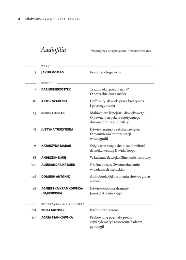 2 teksty drugie 2015 / 5 s p i s t r e ś c i Audiofilia Wstęp 7 Jakub Momro Szkice 13 Współpraca merytoryczna: Dariusz Brzostek Fenomenologia ucha Dariusz Brzostek yrania oka, pokora ucha? T O potrzebie sound studies 28Artur Szarecki offitivity: dźwięk, praca kreatywna C i posthegemonia 45Robert Losiak alowniczość pejzażu dźwiękowego. M O pewnym aspekcie estetycznego doświadczenia audiosfery 58 źwięki natury a sztuka dźwięku. D O rozumieniu reprezentacji w fonografii Justyna Tuszyńska 71Katarzyna Marak dgłosy w bezgłosie: niesamowitość O dźwięku według Davida Toopa 88Andrzej Hejmej W kulturze dźwięku. Słuchanie literatury 103Aleksandra Kremer łośna poezja. Uważne słuchanie G w badaniach literackich 126 udiobook. Od brzmienia słów do głosu A autora Dominik Antonik 148Agnieszka Kramkowska- -Dąbrowska R o z t r z ą s a n i a i r o z b i o r y Dźwiękochłonne dramaty Janusza Krasińskiego 167Zofia Mitosek Bachtin raz jeszcze 175Agata Stankowska róbowanie poematu prozą, P czyli dylematy i roszczenia badacza genologii 188Iwona Sowińska-Fruhtrunk Doświadczenie muzyki, doświadczenie w muzyce. Refleksje na podstawie książki Przeciw muzykologii niewrażliwej Macieja Jabłońskiego 199Wojciech Śmieja łopoty z innością, inność z kłopotami. K Recenzja książki Mariana Bieleckiego Kłopoty z Innością 210Tomasz Szymon Markiewka R ortiański konstruktywizm wobec krytycznego intencjonizmu. Rozważania wokół książki Danuty Szajnert p r e z e n ta c j e 229Roland Barthes Ziarno głosu Przeł. J. Momro 238 Polityka głosu Przeł. P. Bożek, G. Nowak Mladen Dolar 261Salomé Voegelin 283 Dociekania S łuchając hałasu i ciszy. Ku filozofii sztuki dźwiękowej Przeł. P. Bożek, G. Nowak Małgorzata Mikołajczak iędzy mimikrą a rebelią. Pejzaż M (post)kolonialny regionalnej literatury 306Anna Nasiłowska eografia literatury polskiej: G rozpoznawanie Wschodu 321Kamila Gieba róba epopei. O narracjach założycielskich P tzw. Ziem Odzyskanych glossy 336Wojciech Ryczek Politropia: retoryka Odyseusza 357Elżbieta Zarych ocna rozmowa – nokturn w muzyce, N literaturze i malarstwie romantyzmu 386 arbarzyńca w ogrodzie Suhrkampa. B Zbigniew Herbert i jego niemiecki wydawca Paweł Zajas