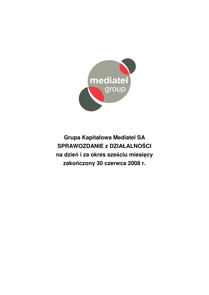 Grupa Kapitałowa Mediatel SA SPRAWOZDANIE z DZIAŁALNOŚCI na dzień i za okres sześciu miesięcy zakończony 30 czerwca 2008 r. Grupa Kapitałowa Mediatel SA SPRAWOZDANIE z DZIAŁALNOŚCI na dzień i za okres sześciu miesięcy zakończony 30 czerwca 2008 r. (wszystkie kwoty w tys. jeżeli nie zaznaczono inaczej) Niniejsze Sprawozdanie Zarządu z działalności Grupy Kapitałowej Mediatel SA za okres od 01 stycznia 2008 r. do 30 czerwca 2008 r. zostało podpisane w dniu 30 września 2008 r. przez Zarząd Mediatel SA: _______________ _______________ Marcin Kubit Prezes Zarządu Mediatel SA Marek Nowakowski Członek Zarządu Mediatel SA ____________________ Jacek Niedziałkowski Członek Zarządu Mediatel SA __________________ Jerzy Cegliński Członek Zarządu Mediatel SA 2 Grupa Kapitałowa Mediatel SA SPRAWOZDANIE z DZIAŁALNOŚCI na dzień i za okres sześciu miesięcy zakończony 30 czerwca 2008 r. (wszystkie kwoty w tys. jeżeli nie zaznaczono inaczej) Spis Treści Sprawozdanie z działalności Grupy Kapitałowej Mediatel SA 1. Podstawowe informacje o Spółce i Grupie Kapitałowej 5 2. Wybrane dane finansowe 7 3. Informacje określone w przepisach 8 4. Ważniejsze wydarzenia mające wpływ na działalność Grupy 8 5. Omówienie podstawowych wielkości ekonomiczno-finansowych, ujawnionych w półrocznym sprawozdaniu finansowym 10 6. Informacje o podstawowych produktach i rynkach zbytu 10 7. Ocena czynników i nietypowych zdarzeń mających wpływ na wynik za okres 6 miesięcy zakończony dnia 30 czerwca 2008 roku 8. 9. 13 Perspektywy rozwoju działalności Grupy oraz charakterystyka wpływu zewnętrznych i wewnętrznych czynników na rozwój 14 Opis istotnych czynników ryzyka i zagrożeń 15 10. Znaczące umowy zawarte przez Grupę Kapitałową Mediatel w okresie sprawozdawczym 17 11. Powiązania organizacyjne lub kapitałowe Mediatel 17 12. Transakcje z podmiotami powiązanymi 17 13. Zaciągnięte kredyty, umowy pożyczek, z uwzględnieniem terminów ich wymagalności, oraz udzielone poręczenia i gwarancje 19 14. Udzielone pożyczki, z uwzględnieniem terminów ich wymagalności, a także udzielone poręczenia i gwarancje jednostkom powiązanym 20 15. Emisja akcji w okresie objętym raportem i opis wykorzystania przez Spółkę wpływów z tej emisji 21 16. Prognozy wyników 22 17. Przegląd sytuacji operacyjnej i finansowej oraz analiza głównych pozycji bilansowych 23 18. Ocena możliwości realizacji zamierzeń inwestycyjnych, w tym inwestycji kapitałowych, w porównaniu do wielkości posiadanych środków, z uwzględnieniem możliwych zmian w strukturze finansowania tej działalności 19. Zmiany w podstawowych zasadach zarządzania Mediatel SA i jego grupą kapitałową 27 27 20. Zmiany w składzie osób zarządzających i nadzorujących Mediatel SA w ciągu ostatniego roku obrotowego 27 21. Zasady dotyczące powoływania i odwoływania osób zarządzających oraz uprawnienia osób zarządzających, w szczególności prawo do podjęcia decyzji o emisji lub wykupie akcji 28 22. Wszelkie umowy zawarte między Spółką Mediatel a osobami zarządzającymi, przewidujące rekompensatę w przypadku ich rezygnacji lub zwolnienia z zajmowanego stanowiska bez ważnej przyczyny lub gdy ich odwołanie lub zwolnienie następuje z powodu połączenia Spółki przez przejęcie; 29 23. Wynagrodzenia wypłacone i należne osobom zarządzającym i nadzorującym 29 24. Akcje Mediatel będące w posiadaniu osób zarządzających i nadzorujących 30 25. Akcjonariusze posiadający, bezpośrednio lub pośrednio przez podmioty zależne, co najmniej 5 % w ogólnej liczbie głosów na walnym zgromadzeniu Spółki 31 3 Grupa Kapitałowa Mediatel SA SPRAWOZDANIE z DZIAŁALNOŚCI na dzień i za okres sześciu miesięcy zakończony 30 czerwca 2008 r. (wszystkie kwoty w tys. jeżeli nie zaznaczono inaczej) 26. Informacje o znanych Spółce Mediatel umowach (w tym również zawartych po dniu bilansowym), w wyniku których mogą w przyszłości nastąpić zmiany w proporcjach posiadanych akcji przez dotychczasowych akcjonariuszy i obligatariuszy 32 27. Posiadacze wszelkich papierów wartościowych, które dają specjalne uprawnienia kontrolne w stosunku do Mediatel 28. System kontroli programów akcji pracowniczych 33 33 29. Ograniczenia dotyczące przenoszenia prawa własności papierów wartościowych Spółki oraz wszelkie ograniczenia w zakresie wykonywania prawa głosu przypadających na akcje Mediatel 30. Podmiot uprawniony do badania sprawozdań finansowych 33 34 31. Istotne wydarzenia w zaistniałe po dacie 30 czerwca 2008 r., na dzień sporządzenia Sprawozdania z działalności tj. 32. Oświadczenia zarządu 34 37 4 Grupa Kapitałowa Mediatel SA SPRAWOZDANIE z DZIAŁALNOŚCI na dzień i za okres sześciu miesięcy zakończony 30 czerwca 2008 r. (wszystkie kwoty w tys. jeżeli nie zaznaczono inaczej) 1. Podstawowe informacje o Spółce i Grupie Kapitałowej Jednostką dominującą Grupy Kapitałowej Mediatel (dalej „Grupa Kapitałowa”, „Grupa”) jest Mediatel Spółka Akcyjna (zwana dalej „Spółka”, „Mediatel”). siedziba: ul. Bitwy Warszawskiej 1920r. 7A, 02-366 Warszawa sąd rejestrowy: Sąd Rejonowy dla m. st. Warszawy w Warszawie, XII Wydział Gospodarczy Krajowego Rejestru Sądowego KRS: 0000045784 Kapitał zakładowy: 1.816.503 zł Spółka Mediatel SA jest dynamicznie rozwijającym się niezależnym dostawcą zintegrowanych usług telekomunikacyjnych. W wyniku rozwoju poprzez przeprowadzone w pierwszej połowie 2008 roku akwizycje podmiotów telekomunikacyjnych, Spółka znacząco zdywersyfikowała obszar swojej działalności (poszerzyła liczbę segmentów rynkowych oraz zwiększyła zasięg geograficzny swojej działalności) co miało również wpływ na wzbogacenie portfolio produktowego Spółki. Grupa Kapitałowa Mediatel oferuje usługi telekomunikacyjne na bazie własnej oraz dzierżawionej infrastruktury telekomunikacyjnej. Podmioty wchodzące w skład Grupy Kap