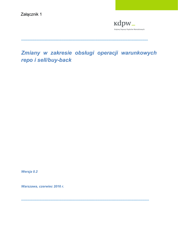 Załącznik 1 -------------------------------------------------------------------------------------------------------------------- Zmiany w zakresie obsługi operacji warunkowych repo i sell/buy-back Wersja 0.2 Warszawa, czerwiec 2016 r. --------------------------------------------------------------------------------------------------------------------- KDPW S.A. Modele obsługi transakcji warunkowych stosowane obecnie w KDPW 1. 2. 3. 4. Transakcje repo i sell/buy-back „zwykłe” – instrukcja zamykająca generowana w systemie depozytowym na podstawie danych zawartych w instrukcji otwierającej. Stosowane są trzy warianty z perspektywy zasad zestawiania instrukcji: a. Instrukcje nie wymagające zestawiania – w szczególności operacji repo zawierane z NBP oraz transakcje warunkowe zawierane na rynku Treasury BondSpot Poland pomiędzy podmiotami będącymi uczestnikami bezpośrednimi KDPW. b. Instrukcje wymagające zestawiania – bilateralne zestawianie instrukcji przekazywanych przez strony rozrachunku lub w przypadku niektórych transakcji warunkowych zawieranych na rynku Treasury BondSpot Poland przez BondSpot (w imieniu uczestnika KDPW) oraz podmiot prowadzących rachunek dla strony transakcji niebędącej uczestnikiem KDPW. c. Instrukcje wymagające 3-stronnego zestawiania – w przypadku niektórych transakcji warunkowych zawieranych na rynku Treasury BondSpot Poland instrukcje przekazywane przez BondSpot (instrukcja „informacyjna”) oraz podmioty prowadzące rachunki dla stron transakcji niebędących uczestnikami KDPW. Instrukcje rozrachunku, oprócz standardowych danych, zawierają dodatkowo informacje dotyczące: Oznaczenia typu umowy repo Stopy repo i typu stopy repo Daty rozrachunku transakcji zamykającej Transakcje repo i sell/buy-back realizowane bez pośrednictwa KDPW – dokonanie rozrachunku transakcji otwierającej i zamykającej wymaga przekazania zgodnych instrukcji rozrachunku. W instrukcji otwierającej nie są wymagane dane dotyczące transakcji zamykającej. Krajowy Depozyt nie generuje instrukcji dotyczących zamknięcia. Transakcje repo i sell/buy-back zawierane w ramach transakcji OTC rozliczanych przez KDPW_CCP – instrukcje rozrachunku dostarczane przez izbę rozliczeniową KDPW_CCP, nie wymagają zestawiania. Transakcje tri-party repo – instrukcje rozrachunku tworzone w systemie depozytowym na podstawie zleceń rozrachunku transakcji repo dostarczanych do KDPW. W systemie depozytowym są generowane instrukcje dotyczące otwarcia i zamknięcia repo, jak również dotyczące bieżących rozrachunków związanych z prowadzoną przez KDPW aktualizacją wartości repo i aktualizacją przekazanych pomiędzy stronami zabezpieczeniami. Transakcje warunkowe – zmiany 2/7 KDPW S.A. Zakres planowanych zmian w obsłudze transakcji warunkowych 1. Transakcje repo i sell/buy-back „zwykłe” i transakcje repo i sell/buy-back realizowane bez pośrednictwa KDPW – zintegrowanie tych dwóch obecnie funkcjonujących modeli. Odstąpienie przez KDPW od modelu obsługi transakcji warunkowych, w którym instrukcja zamykająca generowana jest w systemie depozytowym na podstawie danych zawartych w instrukcji otwierającej. Jednocześnie, z uwagi na fakt, że regulacje CSDR przewidują wymóg zestawiania jako standardowo obowiązującą funkcjonalność, planowane jest wprowadzenie jednolitego modelu w zakresie zasad zestawiania instrukcji. Przewiduje się, że wszystkie transakcje warunkowe zawierane poza obrotem zorganizowanym, z wyjątkiem transakcji rozliczanych w izbach rozliczeniowych CCP lub zawieranych z NBP, będą wymagały zestawiania – w szczególności będą obowiązywać następujące modele: a. Bilateralne zestawianie instrukcji – dla transakcji z rynku OTC. b. Instrukcje wymagające 3-stronnego zestawiania – dla transakcji warunkowych zawieranych na platformach transakcyjnych, w tym na rynku Treasury BondSpot Poland (niezależnie od faktu, czy stroną transakcji był uczestnik KDPW czy też podmiot niebędący uczestnikiem KDPW). Przewiduje się przy tym, że instrukcje przekazywane przez uczestników KDPW powinny być odpowiednio zgodne z instrukcją „informacyjną” przekazaną przez BondSpot. Odstępuje się od stosowania oznaczeń dla typu repo oraz sell/buy-back, tj. oznaczeń kodowych R1-R4. Informujemy jednocześnie, że wraz z implementacją niniejszych zmian nastąpi odstąpienie przez KDPW od obsługi operacji repo z blokowaniem papierów wartościowych na koncie nabywcy, bądź zbywcy (obecny typ repo R2 i R3). Nastąpi również likwidacja, związanego z tymi operacjami, statusu aktywów CORE. W instrukcji otwierającej będzie wskazywana planowana data rozrachunku transakcji zamykającej: informacja podawana o ile taka data została uzgodniona, data ta ma charakter informacyjny – nie służy do generowania instrukcji zamykającej, data zamknięcia transakcji warunkowej będzie podlegać zestawianiu – zgodność dat w przypadku wskazana przez obie strony rozrachunku. Zakłada się możliwość braku wskazania tej daty: dwustronnie (tzw. open repo) lub jednostronnie (jako datę przyjmuje się wartość wskazaną przez kontrahenta), podawanie planowane daty transakcji zamykającej wymagane ze względu na odmienne traktowanie transakcji warunkowych w zakresie operacji buy-in (zgodnie z regulacjami CSDR odstępuje się od realizacji operacji buy-in w przypadku, gdy transakcja zamykająca jest planowana do rozrachunku w terminie 30 dni od otwarcia). Transakcje warunkowe – zmiany 3/7 KDPW S.A. Planowane zmiany w oznaczeniach kodowych transakcji warunkowych – celem tych zmian jest wprowadzenie jednolitych zasad w zakresie wymogów zestawiania instrukcji, jak również zapewnienie stosowania takich zasad, które pozwolą na płynne przejście z własnych oznaczeń kodowych stosowanych w systemie kdpw_stream na oznaczenia uwzględniające standardy ISO (operacja planowana do realizacji w 2018 r.). Nowa kodyfikacja operacji przewi