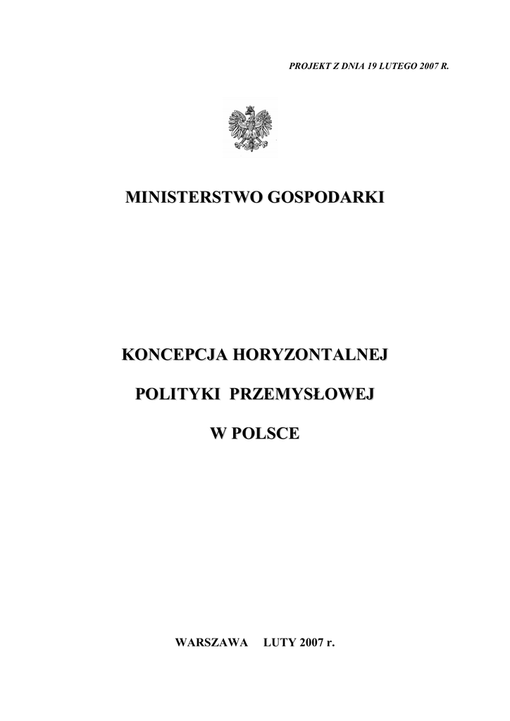 PROJEKT Z DNIA 19 LUTEGO 2007 R. MINISTERSTWO GOSPODARKI KONCEPCJA HORYZONTALNEJ POLITYKI PRZEMYSŁOWEJ W POLSCE WARSZAWA LUTY 2007 r. Spis treści 1. Wprowadzenie ............................................................................................................. 3 2. Uwarunkowania ............................................................................................................. 4 3. Sytuacja w polskim przemyśle....................................................................................... 4 4. Cel horyzontalnej polityki przemysłowej ...................................................................... 7 5. Wyzwania stawiane polskiemu przemysłowi ................................................................ 8 6. Obszary działań horyzontalnych .................................................................................... 8 6.1. Badania i rozwój oraz innowacyjność......................................................................... 9 6.2. Technologie informacyjne i komunikacyjne............................................................. 10 6.3. Kapitał ludzki ............................................................................................................ 10 6.4. Ochrona środowiska – zrównoważony rozwój ......................................................... 11 6.5. Rynki zbytu ............................................................................................................... 12 6.6. Ochrona własności przemysłowej............................................................................. 13 6.7. Uproszczenie i poprawa systemu regulacji prawnych .............................................. 14 6.8. Dostęp do kapitału..................................................................................................... 14 7. Instrumenty w ramach obszarów działań ..................................................................... 15 7.1. Badania i rozwój oraz innowacyjność....................................................................... 15 7.2. Technologie informacyjne i komunikacyjne............................................................. 16 7.3. Kapitał ludzki ............................................................................................................ 17 7.4. Ochrona środowiska – zrównoważony rozwój ......................................................... 17 7.5. Rynki zbytu ............................................................................................................... 18 7.6. Ochrona własności przemysłowej............................................................................. 18 7.7. Uproszczenie i poprawa systemu regulacji prawnych .............................................. 18 7.8. Dostęp do kapitału..................................................................................................... 18 8. Realizacja horyzontalnej polityki przemysłowej ......................................................... 19 9. Podsumowanie ............................................................................................................. 20 10. Miejsce Koncepcji horyzontalnej polityki przemysłowej w Polsce wśród europejskich i krajowych dokumentów strategicznych......................................................................... 20 2 1. Wprowadzenie Od reform ustrojowych po 1989 r. polska polityka przemysłowa skupiała się na podejściu sektorowym, w ramach którego państwo podejmowało i wspierało działania restrukturyzacyjne w polskim przemyśle w celu przekształcenia go w konkurencyjną gałąź gospodarki. W obecnych uwarunkowaniach gospodarczych, w obliczu silnej i rosnącej konkurencji zarówno na jednolitym rynku Unii Europejskiej, jak i w świetle postępującej globalizacji państwo polskie staje przed szczególnym wyzwaniem efektywnego i skutecznego wspierania długofalowego wzrostu i rozwoju polskiego przemysłu. Wobec nowych wyzwań potrzebne jest nowe podejście do polityki przemysłowej. Polityka przemysłowa będzie skupiać się na podejmowaniu działań horyzontalnych najefektywniej wspierających długookresowy wzrost i rozwój polskiego przemysłu. W podejściu horyzontalnym polityka oddziałująca na polski przemysł powinna polegać na stałym podnoszeniu jakości warunków ramowych prowadzenia działalności przemysłowej poprzez wspólne dla wszystkich sektorów działania ukierunkowane na podnoszenie konkurencyjności przedsiębiorstw przemysłowych. Działania te przede wszystkim będą prowadzić do podnoszenia innowacyjności i postępu technicznego w przedsiębiorstwach, poprawy jakości kapitału ludzkiego i dostosowania jego struktury do potrzeb rynkowych oraz usuwania barier prawnych i administracyjnych hamujących wzrost gospodarczy. Horyzontalne podejście do polityki przemysłowej w pierwszej kolejności dotyczyć będzie sektorów z dominującym bądź całkowitym udziałem własności prywatnej. Do sektorów tych zaliczyć należy w szczególności przemysł biotechnologiczny, chemiczny, drzewny, elektroniczny, farmaceutyczny, ICT, lekki, meblowy, maszynowy i motoryzacyjny. Dla tych sektorów nie znajduje dalszego uzasadnienia przygotowywanie strategii sektorowych określających cele rozwojowe i sposoby ich osiągnięcia. Decyzje o strategii rozwoju przedsiębiorstw i branż zostawione muszą być przedsiębiorcom. Do przedsiębiorstw z sektorów objętych horyzontalną polityką przemysłową skierowane będą, przygotowane przez Ministerstwo Gospodarki we współpracy z przedsiębiorcami, analizy konkurencyjności oraz analizy rozwoju trendów technologicznych (foresight technologiczny). Jednocześnie, proponowane instrumenty przemysłowej polityki horyzontalnej będą tworzyć warunki dla rozwoju nowych sektorów o dużym potencjale wzrostu. Sektory te powstają na styku tradycyjnych branż i bazują na intensywnym wykorzystaniu wyników badań naukowych i prac rozwojowych. 