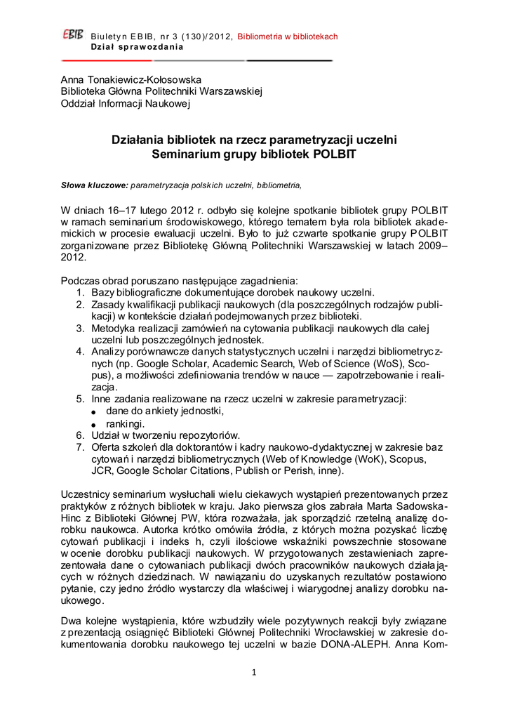 B iu let y n E B IB , n r 3 ( 1 30 )/ 2 01 2, Bibliomet ria w bibliotekach Dz i a ł sp ra w oz da ni a Anna Tonakiewicz-Kołosowska Biblioteka Główna Politechniki Warszawskiej Oddział Informacji Naukowej Działania bibliotek na rzecz parametryzacji uczelni Seminarium grupy bibliotek POLBIT Słowa kluczowe: parametryzacja polsk ich uczelni, bibliometria, W dniach 16–17 lutego 2012 r. odbyło się kolejne spotkanie bibliotek grupy POLBIT w ramach seminarium środowiskowego, którego tematem była rola bibliotek akademickich w procesie ewaluacji uczelni. Było to już czwarte spotkanie grupy POLBIT zorganizowane przez Bibliotekę Główną Politechniki Warszawskiej w latach 2009– 2012. Podczas obrad poruszano następujące zagadnienia: 1. Bazy bibliograficzne dokumentujące dorobek naukowy uczelni. 2. Zasady kwalifikacji publikacji naukowych (dla poszczególnych rodzajów publikacji) w kontekście działań podejmowanych przez biblioteki. 3. Metodyka realizacji zamówień na cytowania publikacji naukowych dla całej uczelni lub poszczególnych jednostek. 4. Analizy porównawcze danych statystycznych uczelni i narzędzi bibliometryc znych (np. Google Scholar, Academic Search, Web of Science (WoS), Scopus), a możliwości zdefiniowania trendów w nauce — zapotrzebowanie i realizacja. 5. Inne zadania realizowane na rzecz uczelni w zakresie parametryzacji: dane do ankiety jednostki, rankingi. 6. Udział w tworzeniu repozytoriów. 7. Oferta szkoleń dla doktorantów i kadry naukowo-dydaktycznej w zakresie baz cytowań i narzędzi bibliometrycznych (Web of Knowledge (WoK), Scopus, JCR, Google Scholar Citations, Publish or Perish, inne). Uczestnicy seminarium wysłuchali wielu ciekawych wystąpień prezentowanych przez praktyków z różnych bibliotek w kraju. Jako pierwsza głos zabrała Marta SadowskaHinc z Biblioteki Głównej PW, która rozważała, jak sporządzić rzetelną analizę dorobku naukowca. Autorka krótko omówiła źródła, z których można pozyskać liczbę cytowań publikacji i indeks h, czyli ilościowe wskaźniki powszechnie stosowane w ocenie dorobku publikacji naukowych. W przygotowanych zestawieniach zaprezentowała dane o cytowaniach publikacji dwóch pracowników naukowych działa jących w różnych dziedzinach. W nawiązaniu do uzyskanych rezultatów postawiono pytanie, czy jedno źródło wystarczy dla właściwej i wiarygodnej analizy dorobku naukowego. Dwa kolejne wystąpienia, które wzbudziły wiele pozytywnych reakcji były związane z prezentacją osiągnięć Biblioteki Głównej Politechniki Wrocławskiej w zakresie dokumentowania dorobku naukowego tej uczelni w bazie DONA-ALEPH. Anna Kom1 B iu let y n E B IB , n r 3 ( 1 30 )/ 2 01 2, Bibliomet ria w bibliotekach Dz i a ł sp ra w oz da ni a perda przedstawiła zadania realizowane na rzecz uczelni wraz z wybranymi przykładami analiz, a także aktywność publikacyjną Politechniki Wrocławskiej na tle innych uczelni w Polsce. Barbara Urbańczyk omówiła metodologię wykonywania analizy prac naukowych pracowników tej uczelni w kontekście zmieniającej się bazy cytowań. Poza tym zaprezentowała nowy sposób rejes tracji prac cytujących i możliwości powiązania ich z rekordami bibliograficznymi w bazie DONA-ALEPH. W obu wystąpieniach podkreślono korzyści wynikające ze stworzenia kompleksowej platformy dorobku naukowego w Politechnice Wrocławskiej, integrującej bazę DONA z modułem cytowań w systemie ALEPH. Obie autorki wystąpień zwróciły też uwagę na korzyści wynikające z dobrej współpracy z władzami uczelni oraz na korzyści płynące ze wzorcowej współpracy nie tylko pomiędzy Oddziałem Dokumentacji a Oddziałem Informacji Naukowej, ale przede wszystkim pomiędzy bibliotekami sieci Politechniki Wrocławskiej. Małgorzata Musiał i Danuta Turecka z Biblioteki Głównej Akademii GórniczoHutniczej przedstawiły dokonania swojej macierzystej biblioteki w zakresie dokume ntowania dorobku naukowego uczelni oraz wykorzystania danych, wprowadzanych do bazy bibliograficznej, w parametryzacji uczelni. Baza bibliograficzna tworzona przez tę bibliotekę jest, podobnie jak we Wrocławiu, podstawą do oceny okresowej pracowników, jednostek lub całej uczelni. Na zaproszenie organizatorów w seminarium udział wzięła Anna Grygorowicz — dyrektor Biblioteki Głównej Uniwersytetu Medycznego w Gdańsku. Anna Grygorowicz jest członkiem Zespołu ds. Punktacji, powołanego przez Konferencję Dyrektorów B ibliotek Akademickich Szkół Polskich (KDBASP). W swoim wystąpieniu wyjaśniła nowe zasady oceny parametrycznej oraz punktację polskich czasopism naukowych. Omówiła także postulaty zdefiniowane przez KDBASP i wystosowane do Komitetu Ewaluacji Jednostek Naukowych (KEJN) przy Ministerstwie Nauki i Szkolnictwa Wyższego, dotyczące m.in. publikacji recenzowanych i nierecenzowanych, jak ró wnież materiałów konferencyjnych. Ostatnim punktem czwartkowych obrad były warsztaty przygotowane i poprowadzone przez Krzysztofa Szymańskiego, reprezentującego firmę Thomson. Zaprezentował on możliwości uzyskania danych porównawczych dorobku naukowego pracowników uczelni na platformie Web of Knowledge. Taka analiza może posłużyć do porównania dokonań w jednej lub w kilku pokrewnych dziedzinach w danej uczelni lub do analiz porównawczych w kraju i na świecie. Dodatkowo zostały zaprezentowane możliwości tworzenia własnych baz bibliograficznych w oparciu o dane z bazy Web of Science. Krzysztof Szymański omówił także komercyjne narzędzie InCites, które może służyć władzom uczelni do oceny badań naukowych, wydajności poszczegó lnych pracowników i jednostek. Narzędzie pozwala na analizę porównawczą ilości ową i jakościową z innymi uczelniami w kraju i na świecie. 2 B iu let y n E B IB , n r 3 ( 1 30 )/ 2 01 2, Bibliomet ria w bibliotekach Dz i a ł sp ra w oz da ni a Fot. 1. Seminarium POLBIT — ok azja do wymiany doś wiadczeń na temat metod stos