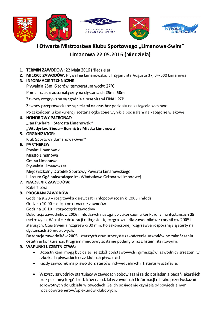 I Otwarte Mistrzostwa Klubu Sportowego „Limanowa-Swim” Limanowa 22.05.2016 (Niedziela) 1. TERMIN ZAWODÓW: 22 Maja 2016 (Niedziela) 2. MIEJSCE ZAWODÓW: Pływalnia Limanowska, ul. Zygmunta Augusta 37, 34-600 Limanowa 3. INFORMACJE TECHNICZNE: Pływalnia 25m; 6 torów, temperatura wody: 27°C Pomiar czasu: automatyczny na dystansach 25m i 50m Zawody rozgrywane są zgodnie z przepisami FINA i PZP Zawody przeprowadzane są seriami na czas bez podziału na kategorie wiekowe Po zakończeniu konkurencji zostaną ogłoszone wyniki z podziałem na kategorie wiekowe 4. HONOROWY PATRONAT: „Jan Puchała – Starosta Limanowski” „Władysław Bieda – Burmistrz Miasta Limanowa” 5. ORGANIZATOR: Klub Sportowy „Limanowa-Swim” 6. PARTNERZY: Powiat Limanowski Miasto Limanowa Gmina Limanowa Pływalnia Limanowska Międzyszkolny Ośrodek Sportowy Powiatu Limanowskiego I Liceum Ogólnokształcące im. Władysława Orkana w Limanowej 7. NACZELNIK ZAWODÓW: Robert Lora 8. PROGRAM ZAWODÓW: Godzina 9.30 – rozgrzewka dziewcząt i chłopców roczniki 2006 i młodsi Godzina 10.00 – oficjalne otwarcie zawodów Godzina 10.10 – rozpoczęcie zawodów Dekoracja zawodników 2006 i młodszych nastąpi po zakończeniu konkurenci na dystansach 25 metrowych. W trakcie dekoracji odbędzie się rozgrzewka dla zawodników z roczników 2005 i starszych. Czas trwania rozgrzewki 30 min. Po zakończonej rozgrzewce rozpoczną się starty na dystansach 50 metrowych. Dekoracje zawodników 2005 i starszych oraz uroczyste zakończenie zawodów po zakończeniu ostatniej konkurencji. Program minutowy zostanie podany wraz z listami startowymi. 9. WARUNKI UCZESTNICTWA: Uczestnikami mogą być dzieci ze szkół podstawowych i gimnazjów, zawodnicy zrzeszeni w szkółkach pływackich oraz klubach pływackich. Każdy zawodnik ma prawo do 2 startów indywidualnych i 1 startu w sztafecie. Wszyscy zawodnicy startujący w zawodach zobowiązani są do posiadania badań lekarskich oraz pisemnych zgód rodziców na udział w zawodach i informacji o braku przeciwskazań zdrowotnych do udziału w zawodach. Za ich posiadanie czyni się odpowiedzialnymi rodziców/trenerów/opiekunów klubowych. 10. ZASADY FINANSOWANIA: Koszty organizacyjne pokrywają organizatorzy Koszty uczestnictwa ponoszą kluby Opłata startowa wynosi 30zł od zawodnika, płatna 30 min w dniu zawodów przed rozpoczęciem startów. Wszystkie świadczenia płatne gotówką w dniu zawodów. Skreślenie zawodnika bez ponoszenia opłaty startowej możliwe do godziny 20.00 do dnia 19 maja 2016 - (dotyczy zgłoszeń grupowych) Zawodnicy zgłoszeni indywidualnie dokonują opłaty przelewem na konto bankowe o numerze 83 1240 5123 1111 0010 3613 9641 do dnia 16 maja 2016 liczy się data zaksięgowania środków na koncie klubu. W tytule przelewu należy podać „Imię i nazwisko zawodnika – opłata startowa OMKS Limnaowa-Swim”. W przypadku braku wpłaty na konto opłaty startowej w powyższym terminie zgłoszenie zawodnika nie zostanie wzięte pod uwagę. Opłata startowa dokonywana przelewem indywidualnie przez rodzica/opiekuna zawodnika nie podlega zwrotowi. 11. ZGŁOSZENIA DO ZAWODÓW: należy przesłać w postaci pliku lenex na adres: [email protected] Zgłoszenie musi zawierać: imię i nazwisko zawodnika, pełną datę urodzenia (DD/MM/RRRR), nazwę klubu, numer licencji, dystans, konkurencję oraz najlepszy czas uzyskany w ostatnich 12 miesiącach Zgłoszenie indywidualne wysyłane przez rodziców zawodników nie należących do szkółek pływackich lub klubów, należy wysłać adres e-mail [email protected] do dnia 16 maja 2016 do godziny 20.00 podając: imię i nazwisko zawodnika, pełną datę urodzenia (DD/MM/RRRR), dystans, konkurencję oraz najlepszy czas uzyskany w ostatnich 12 miesiącach. Termin zgłoszeń dla szkółek i klubów upływa we wtorek 17 maja 2016 o godzinie 20.00 Dodatkowo zgłoszenie musi zawierać dane kontaktowe osoby zgłaszającej (e-mail, telefon) Wszystkie materiały potrzebne do przygotowania zgłoszenia dostępne na www.swimart.pl Po opublikowaniu listy zgłoszonych zawodników nie będą możliwe żadne zmiany za wyjątkiem skreśleń. Ze względu na ograniczone możliwości obiektu oraz bezpieczeństwo uczestników organizator zastrzega sobie prawo do wprowadzenia limitu ilości zawodników uczestniczących w zawodach. O przyjęciu zgłoszenia decyduje kolejność wpłynięcia zgłoszenia (data, godzina). Klub otrzyma informacje o przyjęciu, bądź odrzuceniu zgłoszenia droga elektroniczną. 12. NAGRODY: medale i dyplomy za miejsca I-III w każdej konkurencji i kategorii wiekowej za I-III miejsce w sztafetach przyznawane statuetki w klasyfikacji drużynowej za miejsca I-VI puchary w miarę pozyskiwania sponsorów pula nagród może ulec zwiększeniu PROGRAM SPORTOWY ZAWODÓW: Lp. 1-2 3-4 5-6 7-8 9-10 11-12 13-14 KONKURENCJA 25m st. dowolny 25m st. grzbietowy 25m st. klasyczny 50m st. motylkowy 50m st. dowolny 50m st. grzbietowy 50m st. klasyczny sztafeta 4x50m zmiennym 15 K/M K/M K/M K/M K/M K/M K/M K/M KATEGORIE WIEKOWE 2009 i młodsi 2008 2007 2006 x 2009 i młodsi 2008 2007 2006 x x x 2007 2006 x 2004 i młodsi 2003 i starsi 2005 2004 2003 2002 2001 i starsi 2005 2004 2003 2002 2001 i starsi 2005 2004 2003 2002 2001 i starsi mix 2004 i młodsi (3K+1M) 2003 i starsi (2K+2M) 13. SPRAWY PORZĄDKOWE: za dyscyplinę i porządek w czasie trwania zawodów odpowiedzialni są opiekunowie drużyn; za dopuszczenie zawodnika do startu odpowiedzialny jest opiekun drużyny lub rodzic; organizatorzy zastrzegają sobie prawo korekty programu czasowego; tor nr 6 jest torem jednokierunkowym – przeznaczonym na skoki; wszyscy zawodnicy zobowiązani są do posiadania aktualnych badań lekarskich. Za ich posiadanie czyni się odpowiedzialnymi trenerów/opiekunów; organizatorzy zastrzegają sobie możliwość wykorzystania wizerunków uczestników w celach promocyjnych; listę startową opiekunowie drużyn otrzymują po opłaceniu opłaty