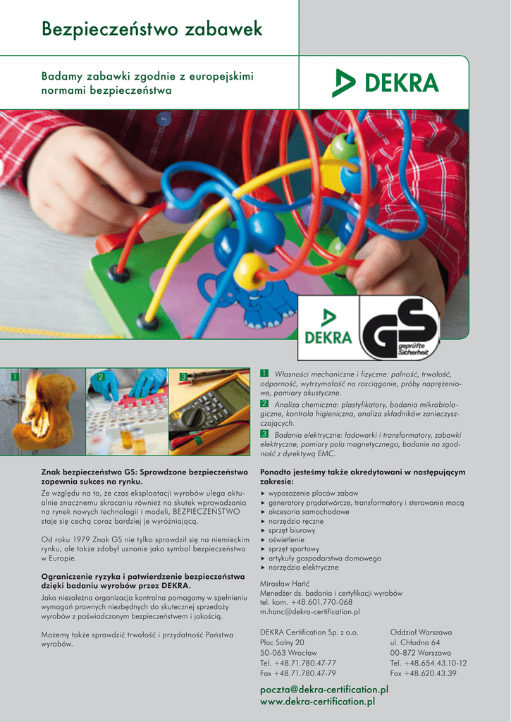 Bezpieczeństwo zabawek Badamy zabawki zgodnie z europejskimi normami bezpieczeństwa 1 2 3 1 Własności mechaniczne i fizyczne: palność, trwałość, odporność, wytrzymałość na rozciąganie, próby naprężeniowe, pomiary akustyczne. 2 Analiza chemiczna: plastyfikatory, badania mikrobiologiczne, kontrola higieniczna, analiza składników zanieczyszczających. 3 Badania elektryczne: ładowarki i transformatory, zabawki elektryczne, pomiary pola magnetycznego, badanie na zgodność z dyrektywą EMC. Znak bezpieczeństwa GS: Sprawdzone bezpieczeństwo zapewnia sukces na rynku. Ponadto jesteśmy także akredytowani w następującym zakresie: Ze względu na to, że czas eksploatacji wyrobów ulega aktualnie znacznemu skracaniu również na skutek wprowadzania na rynek nowych technologii i modeli, BEZPIECZEŃSTWO staje się cechą coraz bardziej je wyróżniającą. wyposażenie Od roku 1979 Znak GS nie tylko sprawdził się na niemieckim rynku, ale także zdobył uznanie jako symbol bezpieczeństwa w Europie. Ograniczenie ryzyka i potwierdzenie bezpieczeństwa dzięki badaniu wyrobów przez DEKRA. Jako niezależna organizacja kontrolna pomagamy w spełnieniu wymagań prawnych niezbędnych do skutecznej sprzedaży wyrobów z poświadczonym bezpieczeństwem i jakością. Możemy także sprawdzić trwałość i przydatność Państwa wyrobów. placów zabaw prądotwórcze, transformatory i sterowanie mocą akcesoria samochodowe narzędzia ręczne sprzęt biurowy oświetlenie sprzęt sportowy artykuły gospodarstwa domowego narzędzia elektryczne generatory Mirosław Hańć Menedżer ds. badania i certyfikacji wyrobów tel. kom. +48.601.770-068 [email protected] DEKRA Certification Sp. z o.o. Plac Solny 20 50-063 Wrocław Tel. +48.71.780.47-77 Fax +48.71.780.47-79 [email protected] www.dekra-certification.pl Oddział Warszawa ul. Chłodna 64 00-872 Warszawa Tel. +48.654.43.10-12 Fax +48.620.43.39