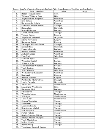 Trasa – Kargów-Chałupki-Grzymała-Podlesie-Wierzbica-Tuczępy-Niecisławice-Jarosławice adres uwagi l.p. imię i nazwisko 1. Robak Mateusz Daniel Góra 2. Walasek Wiktoria Anna Góra 3. Wojtyś Michał Krzysztof Wierzbica 4. Król Łukasz Wierzbica 5. Kwiatkowska Izabela Kargów 6. Marciniec Norbert Marek Chałupki 7. Basa Adam Grzymała 8. Nowicki Bartosz Podlesie 9. Lech Konrad Janusz Tuczępy 10. Tomasz Bartos Kargów 11. Wojciech Kozłowski Grzymała 12. Dawid Mrowiński Kargów 13. Katarzyna Tutak Kargów 14. Katarzyna Wiktoria Tutak Chałupki 15. Konrad Basa Grzymała 16. Patrycja Borycka Podlesie 17. Bartosz Jamrozy Wierzbica 18. Justyna Samiec Wierzbica 19. Piotr Maj Wierzbica 20. Marcin Chojna Góra 21. Weronika Stępień Podlesie 22. Wiktoria Wilk Podlesie 23. Misterkiewicz Weronika Podlesie 24. Tutak Bartosz Podlesie 25. Wilk Wiktoria Wierzbica 26. Wojtyś Paweł Krzysztof Wierzbica 27. Bąk Jacek Kargów 28. Bieniek Zuzanna Kargów 29. Pawłowska Marta Oliwia Chałupki 30. Litwin Patrycja Grzymała 31. Jowita Ptak Nieciesławice 32. Magdalena Wordliczek Góra 33. Katarzyna Bień Podlesie 34. Natalia Bień Tuczępy 35. Weronika Mazur Nieciesławice 36. Wilk Igor Nieciesławice 37. Tutak Alicja Nieciesławice 38. Grabka Weronika Tuczępy 39. Kuźnia Ola Tuczępy 40. Łukaszek Sandra Tuczępy 41. Krupitowicz Michał Tuczępy 42. Ptak Wojciech Nieciesławice 43. Furtak Natalia Tuczępy 44. Samiec Mateusz Michał Tuczępy 45. Haczyk Paulina Krystyna Tuczępy 46. Tutak Magdalena Tuczępy 47. Maleta Natalia Tuczępy 48. Boroń Błażej Tuczępy 49. Tometczak Dominik Cezary