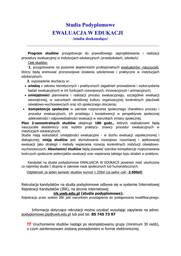 Studia Podyplomowe EWALUACJA W EDUKACJI _ /studia doskonalące/ Program studiów przygotowuje do prawidłowego zaprojektowania i realizacji procedury ewaluacyjnej w instytucjach edukacyjnych /przedszkolach, szkołach/. Cele studiów: 1. przygotowanie na poziomie akademickim profesjonalnych ewaluatorów -nauczycieli, którzy będą animować prorozwojowe działania szkoleniowe i praktyczne w instytucjach edukacyjnych. 2. wyposażenie słuchaczy w: wiedzę z zakresu teoretycznych i praktycznych zagadnień prowadzenia i wykorzystania badań ewaluacyjnych w ich funkcjach rozwojowych, innowacyjnych i animacyjnych; umiejętności planowania i realizacji procesu ewaluacyjnego, szczególnie ewaluacji wewnętrznej, w warunkach określonej kultury organizacyjnej konkretnych placówek oświatowo-wychowawczych oraz ich społecznego otoczenia; kompetencje społeczne w zakresie rozpoznania społecznego charakteru procesu i procedur ewaluacyjnych, ich przebiegu i konsekwencji w perspektywie społecznej adekwatności i odpowiedzialności ewaluacji w warunkach zmiany społecznej. Plan 2-semestralnych studiów obejmuje 180 godz., których realizatorami będą nauczyciele akademiccy oraz wybitni praktycy- znawcy procedur ewaluacyjnych w instytucjach edukacyjnych. Studia mają wykształcić umiejętności ewaluacyjne - w duchu ewaluacji uspołecznionej i dialogicznej; misją studiów jest stymulowanie rozwojowo rozumianej i aplikowanej ewaluacji jako strategii i metody wspierania rozwoju konkretnych instytucji oświatowowychowawczych. Absolwenci studiów będą posiadać szerokie kompetencje rozpoznawania twórczych społecznie potencjałów ewaluacji oraz wspierania takiego typu działań w praktyce. Kandydat na studia podyplomowe EWALUACJA W EDUKACJI powinien mieć ukończone co najmniej studia I stopnia w zakresie nauk społecznych lub humanistycznych. Odpłatność za jeden semestr studiów wynosi 1.250zł (za pełny cykl -2.500zł) Rekrutacja kandydatów na studia podyplomowe odbywa się w systemie Internetowej Rejestracji Kandydatów (IRK), na stronie internetowej irk.uwb.edu.pl (studia podyplomowe). Rejestracja przez system IRK jest warunkiem przystąpienia do postępowania kwalifikacyjnego. Informacje dotyczące rekrutacji można uzyskać wysyłając zapytanie na adres: [email protected] lub pod tel. 85 745 73 97 !!! Uruchomienie studiów nastąpi po skompletowaniu grupy (minimum 30 osób), o czym zainteresowani zostaną powiadomieni w formie elektronicznej.