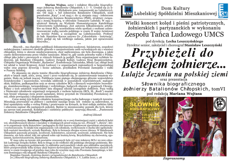 Marian Wojtas, autor i redaktor Słownika biograficz nego żołnierzy Batalionów Chłopskich, t. I V. Urodził się 21 li stopada 1925 r. w Michalowie pow. tomaszowski na Lubelszczyź nie. Od 1942 r. był żołnierzem Batalionów Chłopskich, nosił pseudonim „Karp”, a od 1943 r. do 15 sierpnia 1944 żołnierzem Państwowego Korpusu Bezpieczeństwa (PKB), struktury związa nej z Armią Krajową, w obwodzie Tomaszów Lubelski. W 1951 r. ukończył historię na Wydziale Humanistycznym Katolickiego Uniwersytetu Lubelskiego. Jest autorem kilkudziesięciu artyku łów na temat BCh, uczestnikiem wielu spotkań z osobami zainte resowanymi walką narodu polskiego w czasie II wojny światowej na terenie Polski, a szczególnie na Lubelszczyźnie. Profesor dr hab. Stanisław Kaczor nazywa Go „Człowiekiem Instytucją”, który podjął się tak wielkiego zadania, jakim jest opracowanie Słownika... *** Słownik... ma charakter publikacji dokumentacyjnonaukowej. Inicjatorom, zespołowi redakcyjnemu i autorowi chodziło głównie o zarejestrowanie osób wywodzących się z warstwy chłopskiej, która w okresie międzywojennym, choć najliczniejsza, nie była doceniana, a jakże często dyskryminowana przez władze sanacyjne. Mimo to, gdy zaszła potrzeba walki o Polskę, chłopi jako jedni z pierwszych w różnych formach ją podjęli. Poza organizacjami wybitnie lu dowymi, jak Bataliony Chłopskie, Ludowy Związek Kobiet, Ludowa Straż Bezpieczeństwa. Chłopska Organizacja Wolności „Racławice”, Konfederacja Tatrzańska, Młody Las, chłopi brali też udział w Armii Krajowej, Armii Ludowej i w organizacjach regionalnych w bezpośredniaj walce oraz poprzez dywersję i liczne sabotaże, przykładem Powstanie Zamojskie i walki w Puszczy Solskiej. Po ukazaniu się pięciu tomów Słownika biograficznego żołnierzy Batalionów Chłop skich w latach 1998, 2001, 2005, 2007 i 2010 wydawało się, że zainteresowanie tematem wy gaśnie. Stało się jednak inaczej. Publikacja tomu piątego obejmującego głównie województwa świętokrzyskie i mazowieckie, wywołała oddźwięk w pozostałych województwach: małopol skim, łódzkim, podkarpackim oraz ze strony członków BCh z dawnych województw lwowskie go, stanisławowskiego, tarnopolskiego i wołyńskiego, będących obecnie w granicach Ukrainy. Polacy z tych ostatnich województw lata okupacji odczuli szczególnie dotkliwie. Poza walką z Niemcami członkowie organizacji związanych z ruchem ludowym (BCh, SL „Roch") musieli tam bronić własnego życia przed sąsiadami, którzy przystali do Ukraińskiej Powstańczej Ar mii, silnie powiązanej z okupantem niemieckim. Coraz mniej żyje byłych członków konspiracyjnego ruchu ludowego z tamtych terenów. Mieszkają przeważnie na północy i zachodzie naszego kraju. Ich rodziny są zadowolone, że ktoś upamiętnia walkę o wolną Polskę i przetrwanie na Kresach, że ktoś usiłuje niektóre fakty i zdarzenia zapisać dla następnych pokoleń. Będzie to niezniszczalny pomnik dla tych, którzy na zawsze tam pozostali. Kombatanci i niektórzy publicyści nazywają Słownik… „Panteonem Żołnierzy Batalionów Chłopskich”. Andrzej Zdunek Przypomnijmy. Bataliony Chłopskie składały się w swej dominującej części z młodych ludzi wsi, ukształtowanych ideowo i moralnie w działających przed wojną na wsi „Wiciach” i „Siewie”, któ re to organizacje wielu historyków i pedagogów do dziś nazywa wyjątkowym zjawiskiem oświatowym i wychowawczym. To dzięki tym organizacjom i ich członkom, wychowanym w duchu idei ogólnoludz kich wartości moralnych, wyrosły Bataliony. Była to formacja zbrojna wysoce ideowa. W Batalionach Chłopskich panowała przyjaźń, życzliwość, koleżeństwo, szczerość, uczciwość, solidarność. Nie było donosów, nie było zdrad, nikt nie splamił sobie rąk bratnią krwią. Brzydziliśmy się chciwością, ego izmem, karierowiczostwem, kłamstwem. W 1944 roku na terenie 166 powiatów zrzeszonych było 157 000 żołnierzy BCh i 20 000 człon kiń Ludowego Związku Kobiet. Była to druga co do wielkości siła polskiego zbrojnego podziemia. Bie żącą walkę z okupantem podejmowało 70 oddziałów partyzanckich i około 400 oddziałów specjalnych, które przeprowadziły kilka tysięcy akcji bojowodywersyjnych. Znane jest bohaterstwo naszych żoł nierzy w czasie trwającego od grudnia 1942 roku do września 1943 roku Powstania Zamojskiego, w któ rym dominująca rolę odegrały Bataliony Chłopskie. (...) Stanisław Ozonek, Jesteśmy dumni z przynależności do Batalionów Chłopskich [w.] Słownik biograficzny żołnierzy Batalionów Chłopskich, t. V, Lublin 2010, s. 28 Dom Kultury Lubelskiej Spółdzielni Mieszkaniowej Wielki koncert kolęd i pieśni patriotycznych, żołnierskich i partyzanckich w wykonaniu Zespołu Tańca Ludowego UMCS pod dyrekcją Lecha Leszczyńskiego Dyrektor senior, założyciel i choreograf Stanisław Leszczyński Przybieżeli do Betlejem żołnierze... Lulajże Jezuniu na polskiej ziemi oraz prezentacja Słownika biograficznego żołnierzy Batalionów Chłopskich, tomVI pod redakcją Mariana Wojtasa Zapraszamy Dom Kultury Lubelskiej Spółdzielni Mieszkaniowej Wielki koncert kolęd i pieśni patriotycznych, żołnierskich i partyzanckich w wykonaniu Zespołu Tańca Ludowego UMCS Zespół Tańca Ludowego Uniwersytetu Marii CurieSkłodowskiej w Lublinie powstał w 1953 roku. Jest najstarszym repre zentacyjnym studenckim Zespołem artystycz nym UMCS, założonym i przez 55 lat kierowanym przez magistra Stanisława Leszczyńskiego, osobę niezwykle zasłużoną dla kultury polskiej. Głównym ce lem działalności Zespołu jest roz tańczenie i rozśpiewanie mło dzieży akademickiej oraz uwraż liwienie jej na piękno muzyki, słowa, ruchu i gestu. Zespół liczy około 300 osób, a dotych czas tańczyło w nim ponad 7 tysięcy studentów. Wychowan kowie Zespołu Tańca Ludowego UMCS są kierownikami ponad 40 z