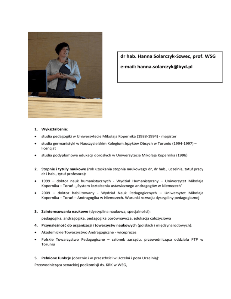 dr hab. Hanna Solarczyk-Szwec, prof. WSG e-mail: [email protected] 1. Wykształcenie: studia pedagogiki w Uniwersytecie Mikołaja Kopernika (1988-1994) - magister studia germanistyki w Nauczycielskim Kolegium Języków Obcych w Toruniu (1994-1997) – licencjat studia podyplomowe edukacji dorosłych w Uniwersytecie Mikołaja Kopernika (1996) 2. Stopnie i tytuły naukowe (rok uzyskania stopnia naukowego dr, dr hab., uczelnia, tytuł pracy dr i hab., tytuł profesora): 1999 – doktor nauk humanistycznych - Wydział Humanistyczny – Uniwersytet Mikołaja Kopernika – Toruń -„System kształcenia ustawicznego andragogów w Niemczech” 2009 – doktor habilitowany - Wydział Nauk Pedagogicznych – Uniwersytet Mikołaja Kopernika – Toruń – Andragogika w Niemczech. Warunki rozwoju dyscypliny pedagogicznej 3. Zainteresowania naukowe (dyscyplina naukowa, specjalności): pedagogika, andragogika, pedagogika porównawcza, edukacja całożyciowa 4. Przynależność do organizacji i towarzystw naukowych (polskich i międzynarodowych): Akademickie Towarzystwo Andragogiczne - wiceprezes Polskie Towarzystwo Pedagogiczne – członek zarządu, przewodnicząca oddziału PTP w Toruniu 5. Pełnione funkcje (obecnie i w przeszłości w Uczelni i poza Uczelnią): Przewodnicząca senackiej podkomisji ds. KRK w WSG, Kierownik Uniwersyteckiego Centrum Edukacji Całożyciowej i Walidacji w UMK, Przewodnicząca Uczelnianej Komisji Wyborczej od 2014 na kadencję do 2016r. w UMK, Przewodnicząca Komisji Wydawniczej na Wydziale Nauk Pedagogicznych UMK, Redaktor Naczelna „Rocznika Andragogicznego” 6. Kształcenie kadry naukowej liczba wypromowanych magistrów: 120 recenzje prac doktorskich: Beata Łapkowska, Stypendia Europejskiego Funduszu Społecznego a szanse edukacyjne młodzieży pogimnazjalnej, Wrocław 2011; Anna Gutowska-Ciołek, Uczenie się w sytuacji przyjaźni w perspektywie andragogicznej, Łódź 2013r. 7. Tematyka naukowo-badawcza (prowadzone badania): a. Wymiary edukacji całożyciowej. Badania biograficzne. b. Dorosłość i starość jako fazy uczenia się wobec wymogów współczesności. c. Studia porównawcze edukacji ustawicznej w Polsce i za granicą. d. Uczenie się w starości na przykładzie dzienników Haliny Semenowicz. e. Portfolio uczenia się kompetencji społecznych 8. Realizowane projekty (naukowo-badawcze, badawczo-rozwojowe, finansowane z programów operacyjnych, z programów ramowych UE): - „Walidacja akademicka” w ramach działania 3.4.1 „Opracowanie założeń merytorycznych i instytucjonalnych KRK oraz KRS dla uczenia się przez całe życie” w Instytucie Badań Edukacyjnych w Warszawie (2011-2013), - Improving Teaching Methods for Europe w ramach programu Erasmus+ we współpracy z Ministerstwem Edukacji Północnej Nadrenii-Westfalii, Uniwersytetem w Mariborze (Słowenia), Centrum Kształcenia Praktycznego Nauczycieli w Düsseldorfie i szkołami Estonii, Słowenii i Polski (2014-2017) 9. Dorobek naukowy (wykaz wybranych publikacji): A. Monografie - Autorskie: 1. Edukacja ustawiczna w Niemczech w kontekście międzynarodowym, Wydawnictwo Uniwersytetu Mikołaja Kopernika, Toruń 2001, ss. 198. 2. Andragodzy w Niemczech w systemie edukacji ustawicznej, Wydawnictwo Novum, Płock – Toruń 2003, ss. 226. 3. Andragogika w Niemczech. Warunki rozwoju dyscypliny pedagogicznej, Wydawnictwo Uniwersytetu Mikołaja Kopernika, Toruń 2008, ss. 379. - Współautorskie: 1. z: W. Gieseke, R. Siebers, E. A. Wesołowska, Doświadczenia edukacyjne kobiet w Niemczech i w Polsce. Raport z badań biograficznych. Bildugserfahrungen von Frauen in Polen und in Deutschland. Report qualitativ-biographischer Forschung, Wydawnictwo Uniwersytetu Mikołaja Kopernika, Toruń 2001, ss. 261 – pozycja dwujęzyczna. 2. z A. Matlakiewicz: Dorośli uczą się inaczej. Andragogiczne podstawy kształcenia ustawicznego, Wydawnictwo Centrum Kształcenia Ustawicznego, Toruń 2005, Wyd. I, ss. 208; Wyd. II, Toruń 2009. - Pod redakcją: 1. H. Depta, J. Półturzycki, H. Solarczyk (red.), Edukacja kulturalna dorosłych. Raport z badań interkulturowych, Warszawa – Radom 2004. 2. A. Frąckowiak, Z. P. Kruszewski, J. Półturzycki, H. Solaczyk-Szwec (red.), Modernizacja edukacji. Projekty międzynarodowe. Materiały dla studentów, Wyd. Novum, Płock 2008. 3. A. Frąckowiak, J. Półturzycki, H. Solarczyk-Szwec (red.): Elżbieta Zawacka. Pisma pedagogiczne, Radom 2009. 4. A. Frąckowiak, R. Góralska, J. Półturzycki, H. Solarczyk-Szwec, Witold Wojdyło: Elżbieta Zawacka, Radom 2009. 5. Aleksandra Semenowicz, Hanna Solarczyk, Agata Szwech (red.), Inspiracje pedagogią freinetowską. Studia, źródła, wspomnienia dedykowane Halinie Semenowicz, Wydawnictwo Naukowe UMK, Toruń 2014. 6. Ewa Skibińska, Hanna Solarczyk-Szwec, AgnieszkaStopińska-Pająk (red.), Edukacja dorosłych w procesie zmian. Materiały z II Zjazdu Andragogicznego, Wydawnictwo WSG, WarszawaBydgoszcz 2014. 7. Hanna Solarczyk, Bernd Käpplinger (red.), Adult Education and Competencies. Approaches of Researchers in Poland and Germany, Edukacja Dorosłych, 2014, nr 1. 10. Zajęcia dydaktyczne - pedagogika - andragogika - pedagogika porównawcza - edukacja ustawiczna z elementami andragogiki