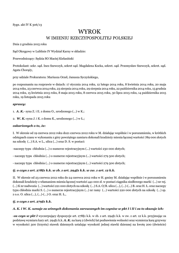 Sygn. akt IV K 306/13 WYROK W IMIENIU RZECZYPOSPOLITEJ POLSKIEJ Dnia 2 grudnia 2015 roku Sąd Okręgowy w Lublinie IV Wydział Karny w składzie: Przewodniczący: Sędzia SO Maciej Kielasiński Protokolant: sekr. sąd. Inez Szewczyk, sekret sąd. Magdalena Kocka, sekret. sąd. Przemysław Szewczyk, sekret. sąd. Agata Chorąży, przy udziale Prokuratora: Mariusza Orzeł, Janusza Syczyńskiego, po rozpoznaniu na rozprawie w dniach: 17 stycznia 2014 roku, 12 lutego 2014 roku, 8 kwietnia 2014 roku, 20 maja 2014 roku, 23 czerwca 2014 roku, 23 sierpnia 2014 roku, 29 sierpnia 2014 roku, 22 października 2014 roku, 15 grudnia 2014 roku, 15 kwietnia 2015 roku, 8 maja 2015 roku, 8 czerwca 2015 roku, 30 lipca 2015 roku, 14 października 2015 roku, 19 listopada 2015 roku sprawy: 1. A. K.- syna Z. i E. z domu O., urodzonego (...) w K.; 2. W. K.-syna J. i K. z domu K., urodzonego (...) w Ł.; oskarżonych o to, że: I. W okresie od 19 czerwca 2012 roku do21 czerwca 2012 roku w M. działając wspólnie i w porozumieniu, w krótkich odstępach czasu w wykonaniu z góry powziętego zamiaru dokonali kradzieży mienia łącznej wartości 789 000 złotych na szkodę (...) S.A. w L., ulica (...) oraz D. S. w postaci: -naczepy typu chłodnia (...) o numerze rejestracyjnym (...) wartości 230 000 złotych; - naczepy typu chłodnia (...) o numerze rejestracyjnym (...) wartości 279 500 złotych; - naczepy typu chłodnia (...) o numerze rejestracyjnym (...) wartości 279 500 złotych; tj. o czyn z art. 278§1 k.k. w zb. z art. 294§1 k.k. w zw. z art. 12 k.k. II. W okresie od 23 czerwca 2012 roku do 24 czerwca 2012 roku w H. gminy M. działając wspólnie i w porozumieniu dokonali kradzieży z włamaniem mienia łącznej wartości 441 000 zł. w postaci ciągnika siodłowego marki (...) nr rej. (...) K nr nadwozia (...) wartości 221 000 złotych na szkodę (...) S.A. O/B. ulica (...), (...)-(...) B. oraz H. Ł. oraz naczepy typu chłodnia marki S. (...) o numerze rejestracyjnym (...) nr ramy (...) wartości 220 000 złotych na szkodę (...) sp. z o.o. O. ulica (...), (...)-(...) O. oraz H. Ł., tj. o czyn z art. 279§1 k.k. A. K. i W. K. uznaje za winnych dokonania zarzucanych im czynów w pkt I i II i za to skazuje ich: -za czyn w pkt I wyczerpujący dyspozycje art. 278§1 k.k. w zb. z art. 294§1 k.k. w zw. z art. 12 k.k. przyjmując za podstawę wymiaru kary art. 294§1 k.k. A. K. na karę 2 (dwóch) lat pozbawienia wolności oraz wymierza karę grzywny w wysokości 300 (trzystu) stawek dziennych ustalając wysokość jednej stawki dziennej na kwotę 200 (dwieście) złotych oraz W. K. na karę 2 (dwóch) lat pozbawienia wolności oraz wymierza karę grzywny w wysokości 300 (trzystu) stawek dziennych ustalając wysokość jednej stawki dziennej na kwotę 200 (dwieście) złotych; -za czyn w pkt II wyczerpujący dyspozycję art. 279§1 k.k. na podstawie art. 279§1 k.k. A. K. na karę 2 (dwóch) lat pozbawienia wolności oraz wymierza karę grzywny w wysokości 300 (trzystu) stawek dziennych ustalając wysokość jednej stawki dziennej na kwotę 200 (dwieście) złotych oraz W. K. na karę 2 (dwóch) lat pozbawienia wolności oraz wymierza karę grzywny w wysokości 300 (trzysta) stawek dziennych ustalając wysokość jednej stawki dziennej na kwotę 200 (dwieście) złotych; na podstawie art. 46§1 k.k. orzeka wobec oskarżonych obowiązek naprawienia szkody poprzez zapłatę solidarnie na rzecz pokrzywdzonego H. Ł. kwoty 441 000 zł. (czterysta czterdzieści jeden tysięcy złotych); na podstawie art. 85 k.k. (w brzmieniu obowiązującym przed wejściem życie ustawy z dnia 20 lutego 2015 roku o zmianie ustawy Kodeks Karny oraz niektórych innych ustaw Dz. U. z 2015 roku poz. 396)i art. 86§1 i 2 k.k. (w brzmieniu obowiązującym przed wejściem życie ustawy z dnia 20 lutego 2015 roku o zmianie ustawy Kodeks Karny oraz niektórych innych ustaw Dz. U. z 2015 roku poz. 396) łączy jednostkowe kary pozbawienia wolności oraz grzywny orzeczone wobec oskarżonych i jako łączne wymierza: A. K. karę 2 (dwóch) lat pozbawienia wolności oraz karę grzywny w wysokości 500 (pięćset) stawek dziennych grzywny ustalając wysokość jednej stawki dziennej na kwotę 200 (dwieście) złotych zaś W. K. karę 2 (dwóch) lat pozbawienia wolności oraz karę grzywny w wysokości 500 (pięćset) stawek dziennych grzywny ustalając wysokość jednej stawki dziennej na kwotę 200 (dwieście) złotych; na podstawie art. 69§1 i 2 k.k. (w brzmieniu obowiązującym przed wejściem życie ustawy z dnia 20 lutego 2015 roku o zmianie ustawy Kodeks Karny oraz niektórych innych ustaw Dz. U. z 2015 roku poz. 396) w zw. z art. 70§1 pkt 1 k.k. (w brzmieniu obowiązującym przed wejściem życie ustawy z dnia 20 lutego 2015 roku o zmianie ustawy Kodeks Karny oraz niektórych innych ustaw Dz. U. z 2015 roku poz. 396) i art.73§1 k.k. (w brzmieniu obowiązującym przed wejściem życie ustawy z dnia 20 lutego 2015 roku o zmianie ustawy Kodeks Karny oraz niektórych innych ustaw Dz. U. z 2015 roku poz. 396) wykonanie orzeczonych wobec A. K. i W. K. kar łącznych pozbawienia wolności warunkowo zawiesza na okres próby wynoszący 5 (pięć) lat i oddaje oskarżonych w tym czasie pod dozór kuratora; na podstawie art. 71§1 pkt 1 k.k. (w brzmieniu obowiązującym przed wejściem życie ustawy z dnia 20 lutego 2015 roku o zmianie ustawy Kodeks Karny oraz niektórych innych ustaw Dz. U. z 2015 roku poz. 396) nakłada na oskarżonych obowiązek przeproszenia pokrzywdzonych; zwalnia oskarżonych od opłat ustalając, że poniesione wydatki obciążają Skarb Państwa; zasądza od Skarbu Państwa na rzecz adw. M. C., Kancelaria Adwokacka, ulica (...) (...)-(...) L. kwotę 2509,20 zł. (dwa tysiące pięćset dziewięć złotych dwadzieścia groszy) tytułem obrony A. K. wykonanej z urzędu oraz na rzecz adw. A. B. Kancelaria Adwokacka, ulica (...) (...)-(...) L. kwotę 2076 zł. (dwa tysiące siedemdziesiąt sześć złotych) tytułem o